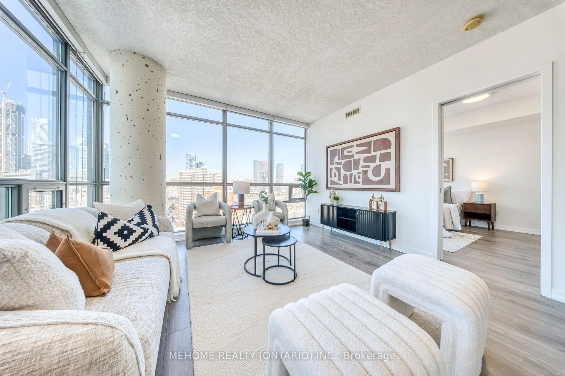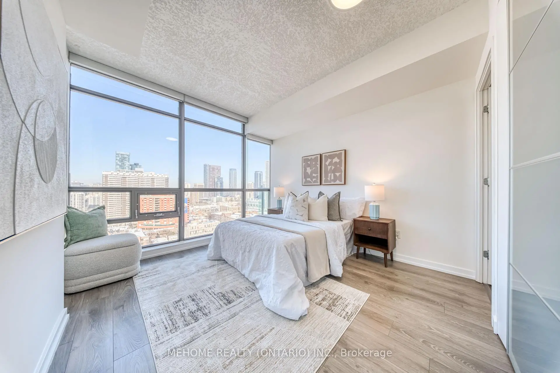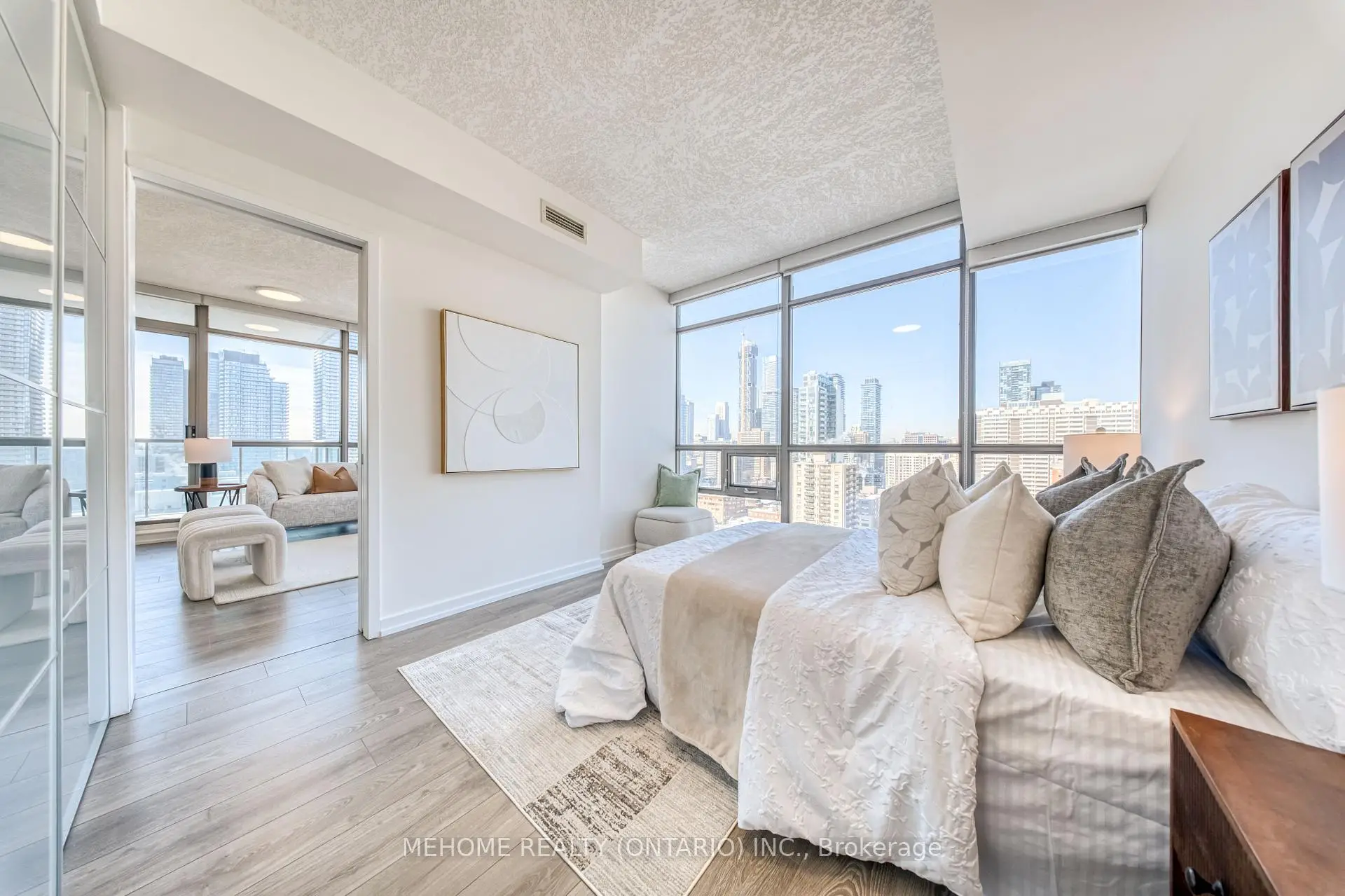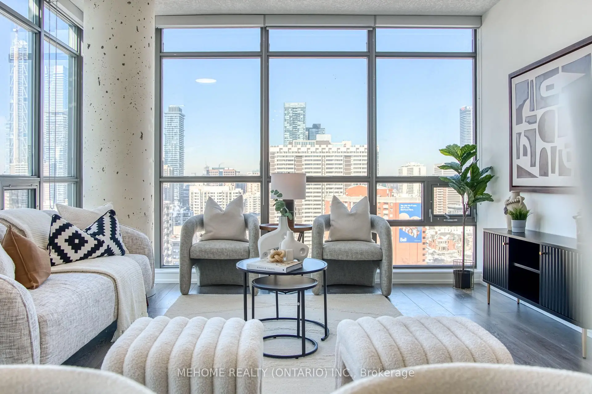 Welcome to this rarely available, impeccably renovated 2-bedroom, 2-bathroom bright corner suite with a desirable northwest exposure in the coveted North Tower of RadioCITY. This thoughtfully curated residence features approximately 9-foot ceilings and floor-to-ceiling windows throughout, allowing abundant natural light and offering expansive northwest city views with beautiful sunset vistas from both the living area and the balcony.The contemporary kitchen is equipped with stainless steel smart appliances, upgraded custom cabinetry, stone countertops, and undermount sinks, seamlessly blending style and functionality.Perfectly located just steps to Maple Leaf Gardens Loblaws, streetcars, and subway access, with approximately a 7-minute walk to College TTC Subway Station. Toronto Metropolitan University and the University of Toronto are nearby, while premier shopping, dining, and cultural destinations such as the Eaton Centre, Distillery District, and Yorkville are all within close proximity. Enjoy refined modern living in the heart of downtown Toronto.
