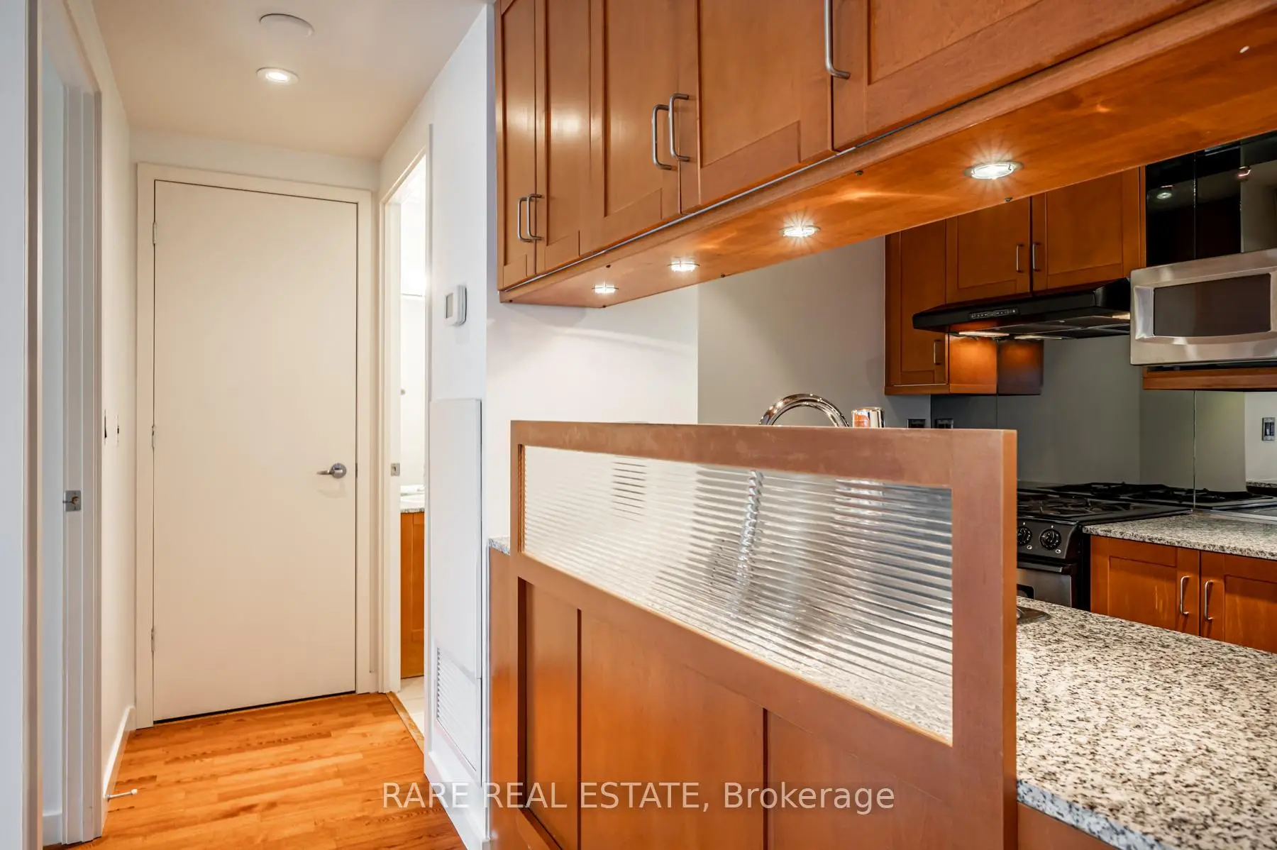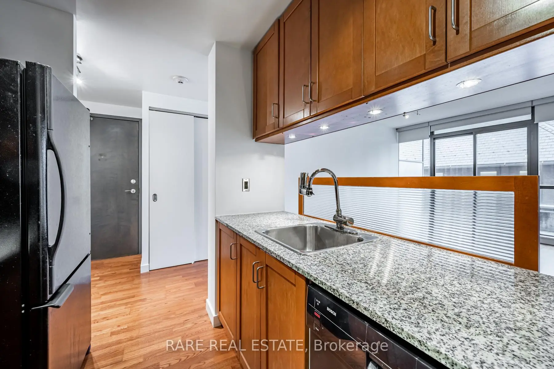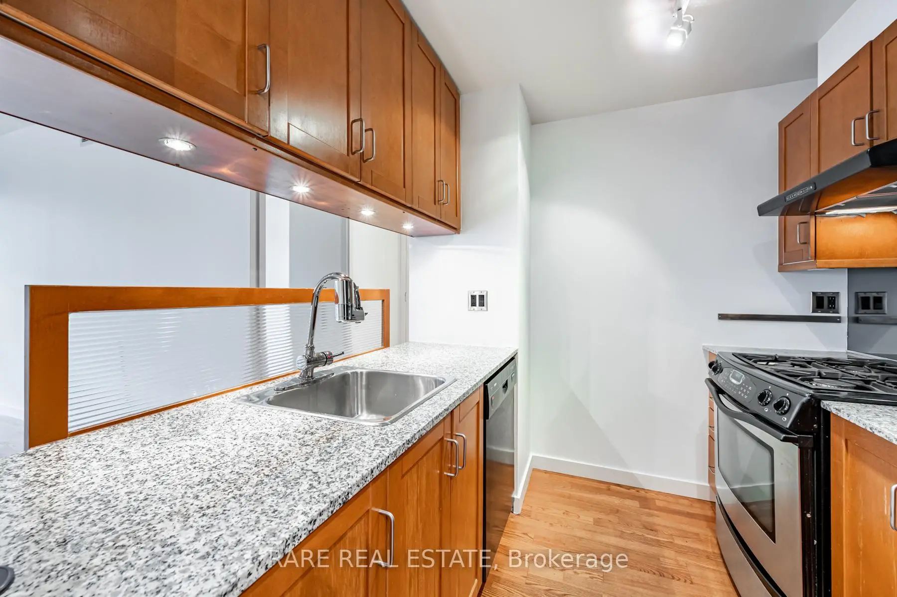 The Perfect 1 Bedroom Suite In Radio City Condos! Large and open 598 Sqft unit with 2 walkouts to huge private balcony Overlooking Quiet Courtyard. All Laminate Floors, Granite Counters In Kitchen With Gas Stove! Outdoor Gas Line For Bbq On Balcony. Bedroom With Sliding Door Walkout To Balcony, and custom closet. Prime Central Location, but set in a quiet neighbourhood. Next To UFT, Ryerson, Hospitals. Historic Maple Leaf Loblaw's Next Store. Walk To Subway Station. High 9Ft Ceilings. 24 Concierge, Gym, Guest Suites, Party Room, Rec Room, Visitors Parking.