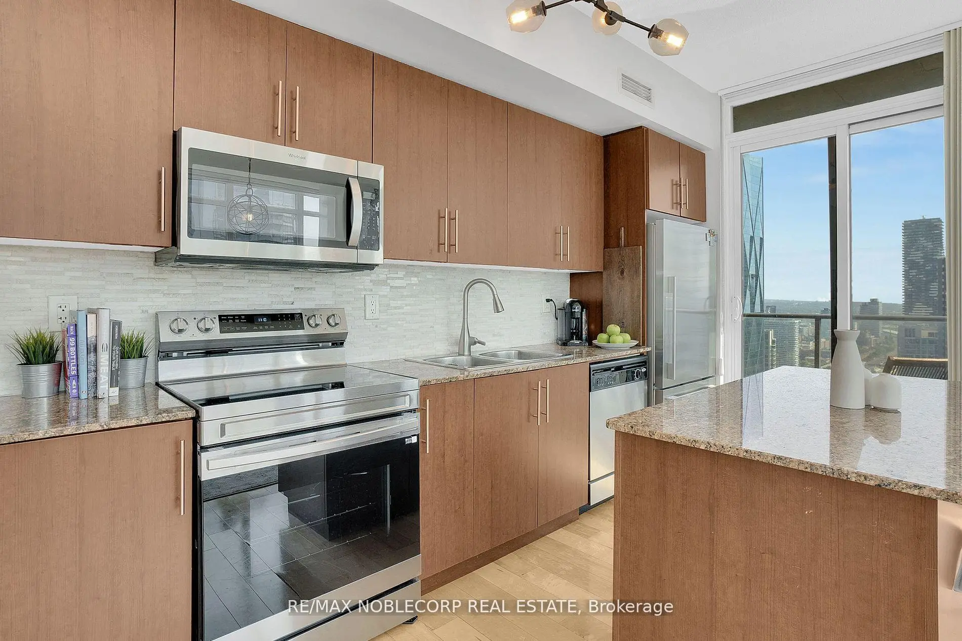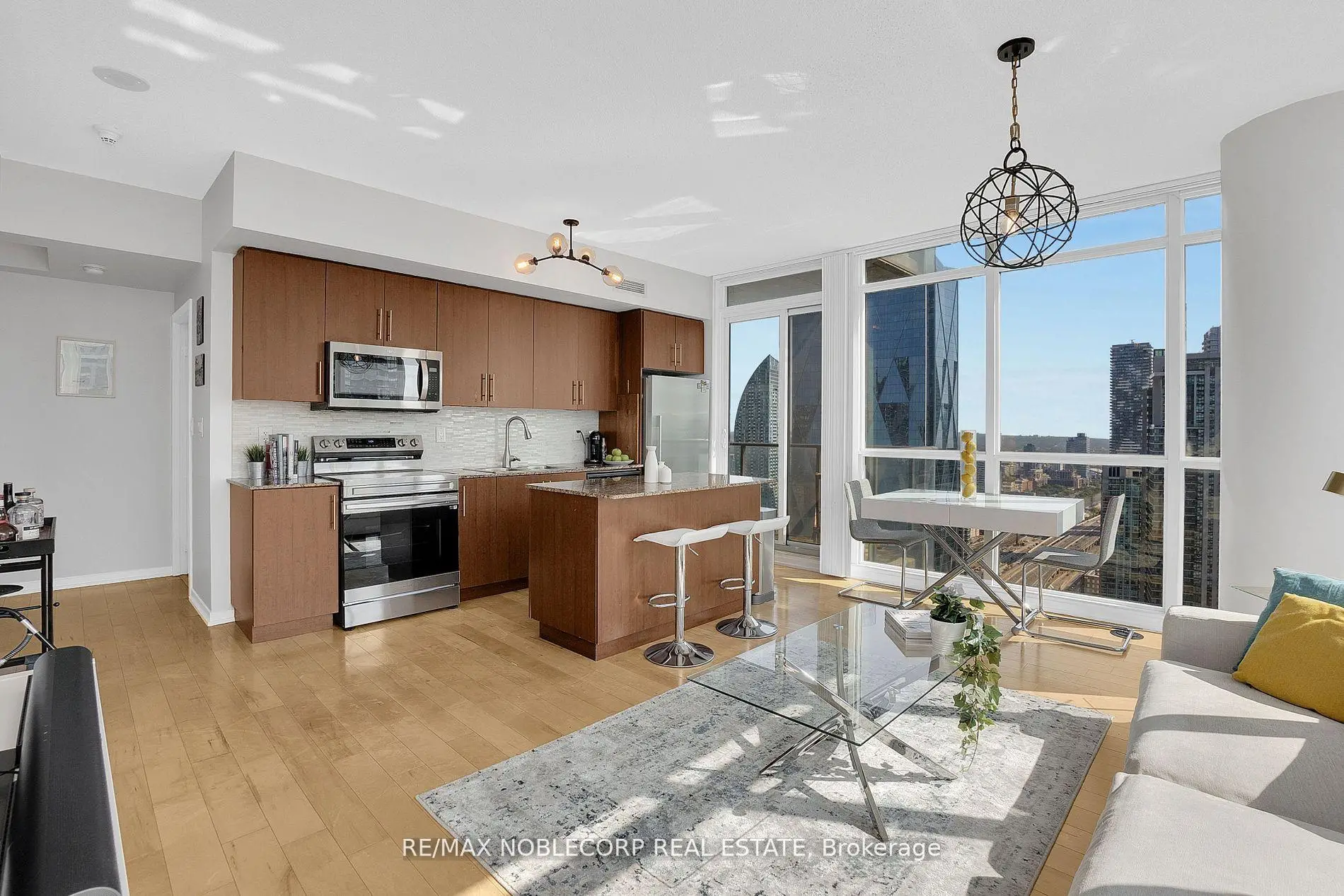 Prestigious And Highly Sought-After Maple Leaf Square Residence. Stunning High-Ceiling 44th-Floor Condo With Floor-To-Ceiling Wrap-Around Windows, Flooding The Space With Natural Light. Featuring Upgraded Appliances, A Kitchen Island, Extended Cabinets, Upgraded Light Fixtures, And Hardwood Flooring. Enjoy The Master Ensuite And A Smart Split Two-Bedroom Layout. Relax On The Large Balcony With Amazing Sw Views. Includes Owned Parking, Locker, And Heat. A Perfect Blend Of Luxury And Convenience! The Seller Agrees, At Their Own Expense, To Replace The Flooring In The Property Prior To Closing. The Flooring Material And Installation Will Be Completed To A Professional Standard And Shall Be Finished Before The Date Of Possession.