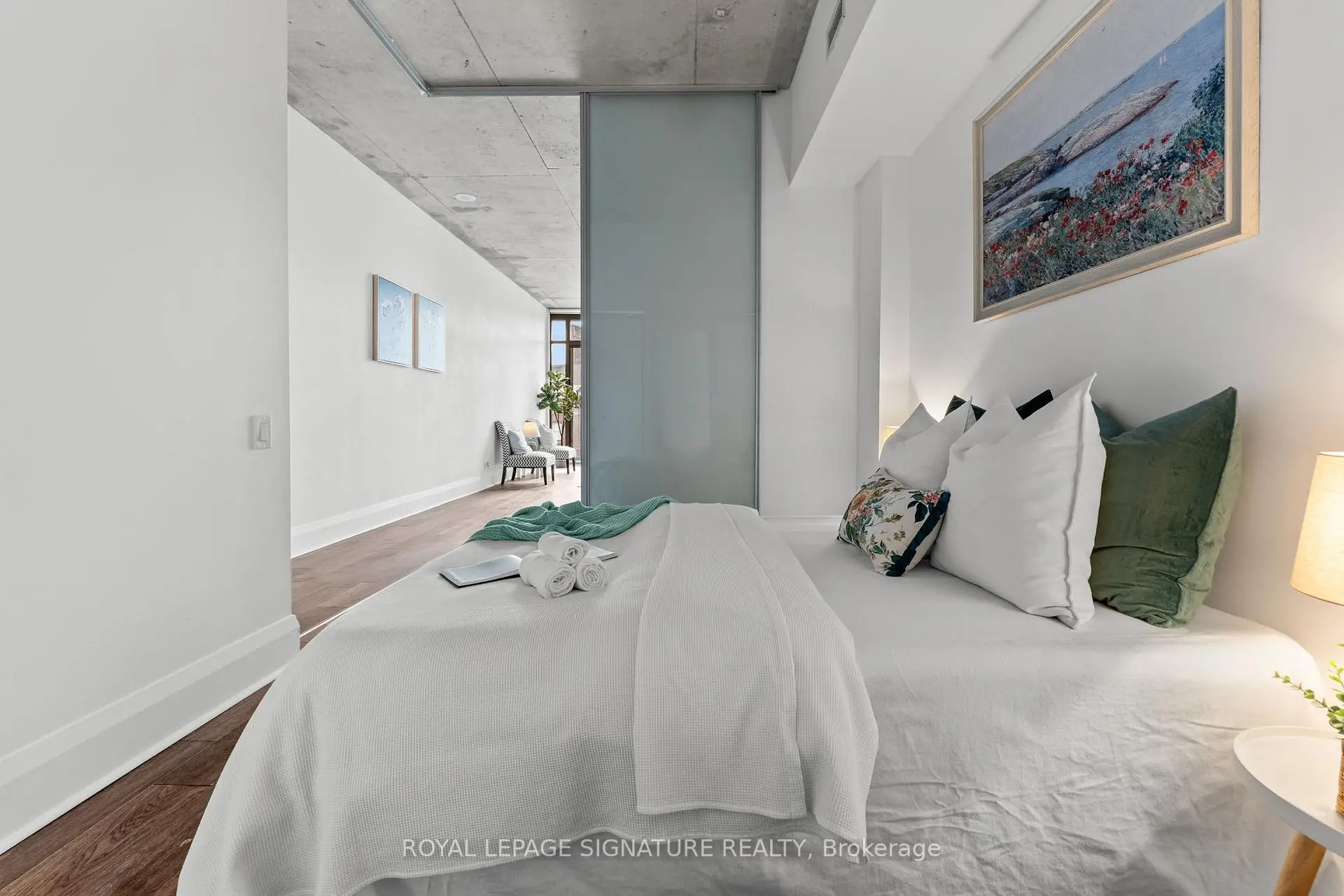 Rarely offered premium 1+1 loft-style suite with owned underground parking and owned locker in the heart of the Distillery District. This unique 764 sq ft layout with soaring 11-ft ceilings is available only on floors 2-5 of the building, creating an open and airy living space rarely found in comparable units. Floor-to-ceiling windows with south exposure offer beautiful views of Lake Ontario and the Distillery District, filling the suite with natural light throughout the day. The thoughtfully designed layout features an open living and dining area, modern kitchen with granite countertops and stainless steel appliances, and a versatile den ideal for a home office, guest space, or second bedroom. The spacious primary bedroom offers excellent storage and convenient access to the 4-piece bath. This is a rare opportunity in the building, combining the sought-after loft-style layout, high ceilings, owned parking, and owned third-floor locker.Enjoy excellent amenities including rooftop pool, fitness centre, and 24-hour concierge, all steps from the Distillery District's renowned restaurants, cafés, galleries, and cobblestone streets. Convenient access to transit, the Gardiner Expressway, and the Don Valley Parkway makes commuting across the city simple.