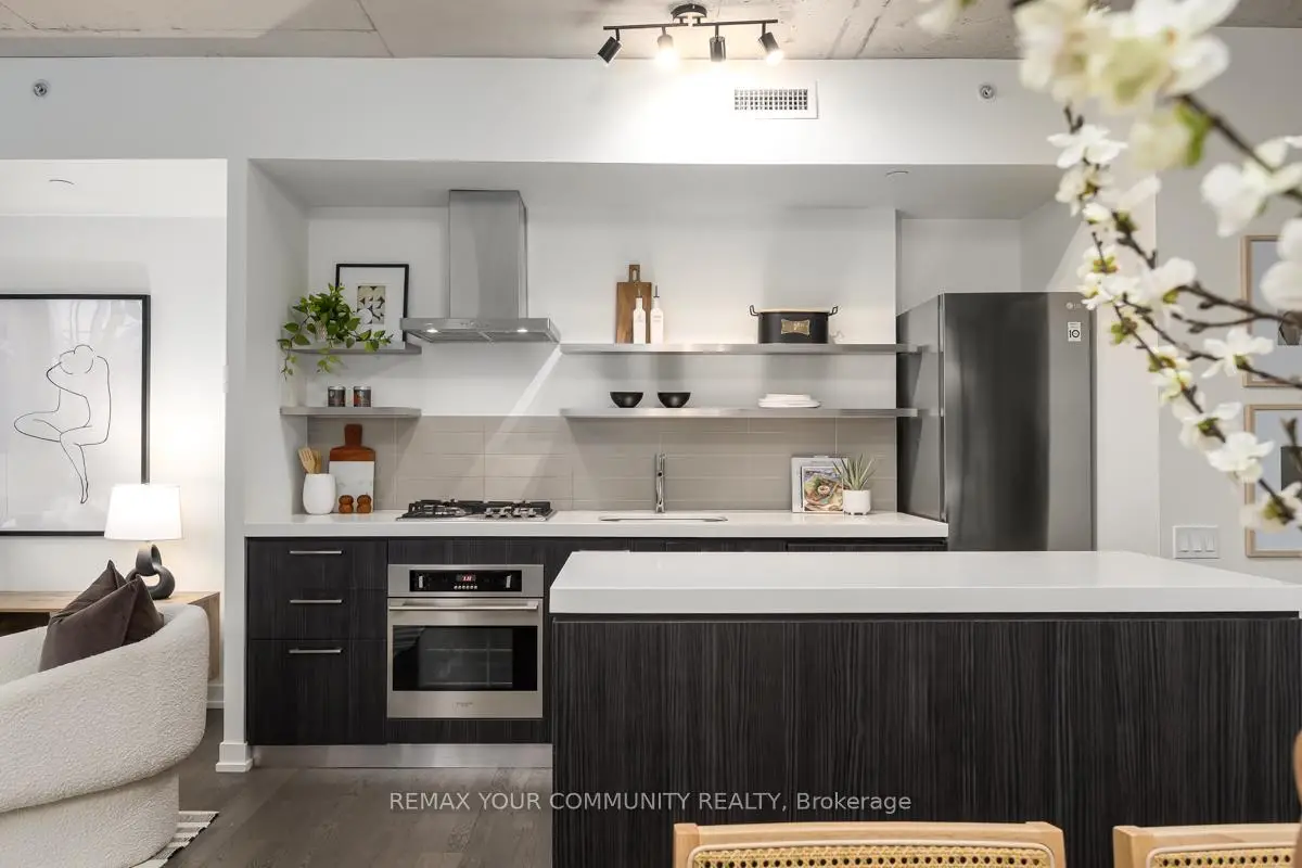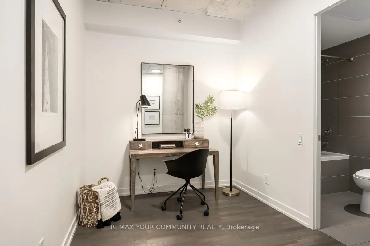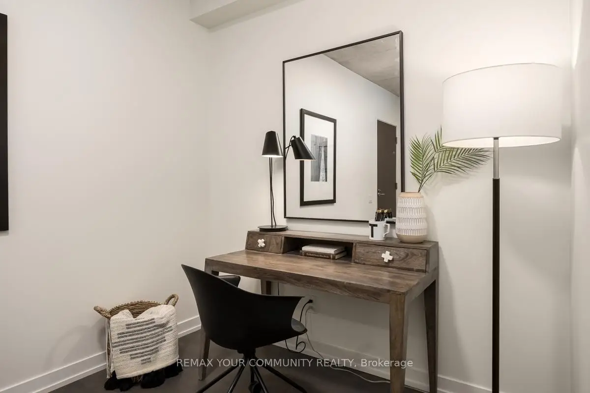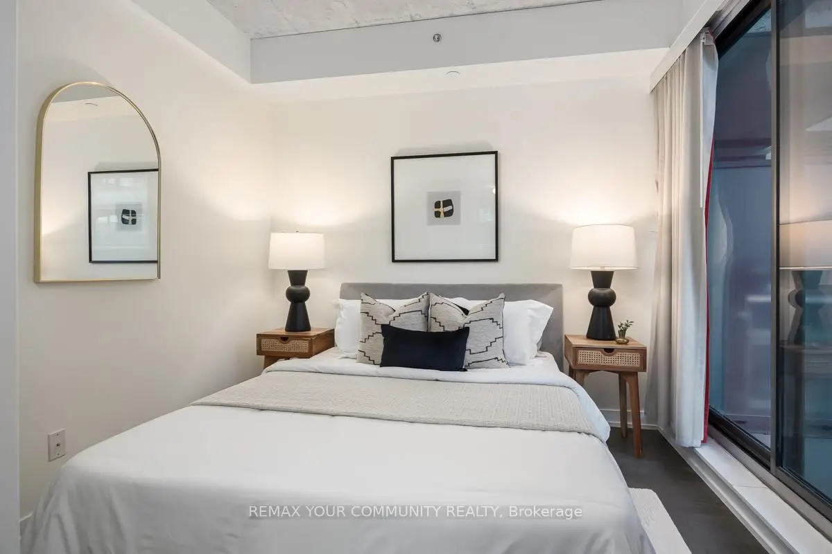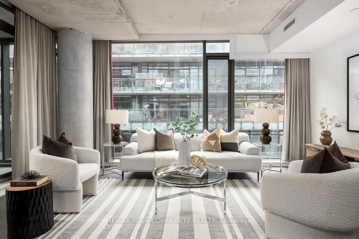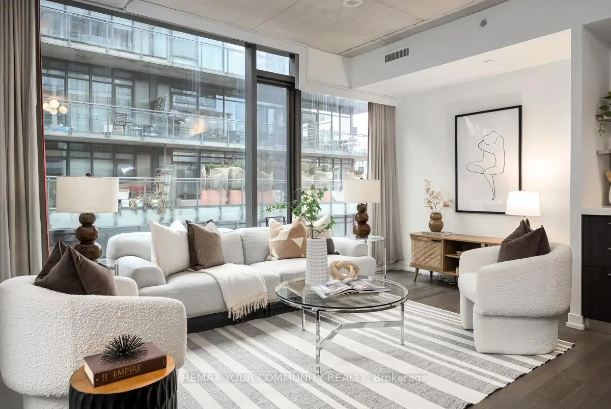 Welcome to Fashion House Lofts located in one of Toronto's most vibrant and iconic neighbourhoods! This bright, freshly painted, open concept suite is 792 sq ft with exposed concrete ceilings and floor to ceiling windows! The modern kitchen has a gas cook-top, SS appliances and large centre island. A Chef's dream! Double sliding doors open to the large 283 sq ft balcony that spans the length of the suite. There is a rare gas BBQ hook-up perfect for entertaining! The primary bedroom also has a sliding door to the balcony for seamless indoor-outdoor relaxing on quiet mornings or evenings. The spacious den provides added space for a generous office ideal for work-life balance. 1 parking and locker are included. Top tier amenities include a stunning infinity pool w/cabanas, gym and party room! Fashion House is just steps to world-class dining, entertaining and transportation. The Keg, Café Renee, Gusto 101, Pai, Aera, Wilbur & Shake Shack are some of the many food options. The Well indoor/outdoor shopping and dining space is an architectural marvel and a must see. There are also countless health and wellness facilities within a 10 min. walk. Fashion House has a near perfect walk and transit score ideal for convenience and luxury living! Don't miss this opportunity to own in one of the most desirable boutique buildings in King West!