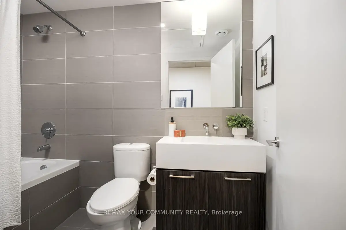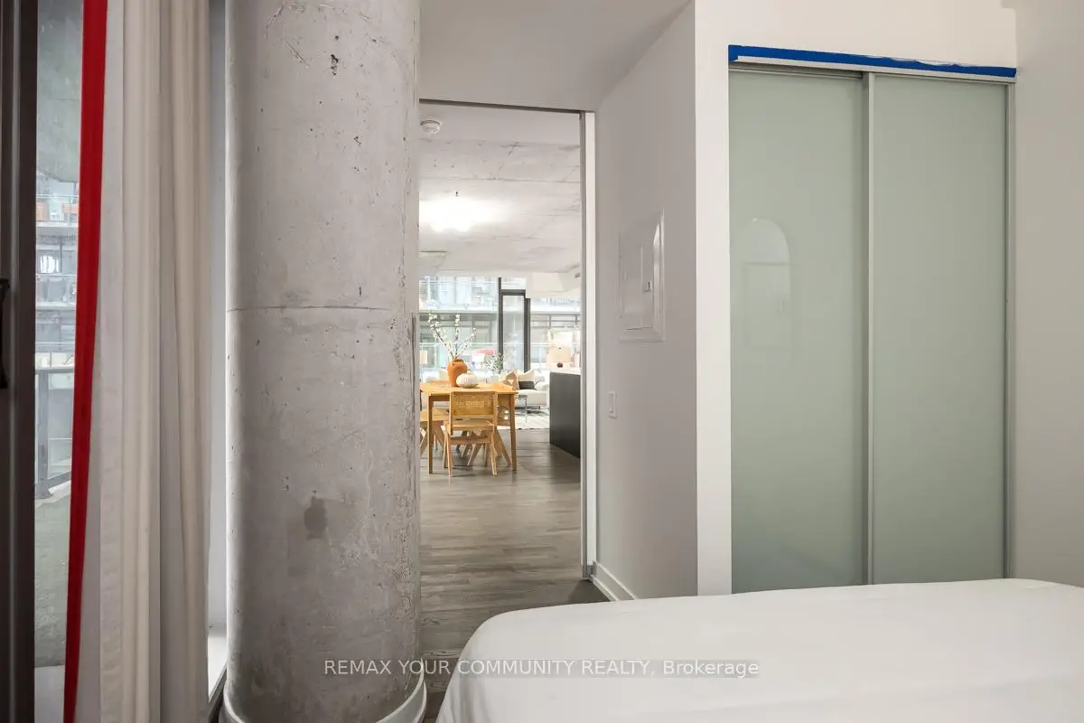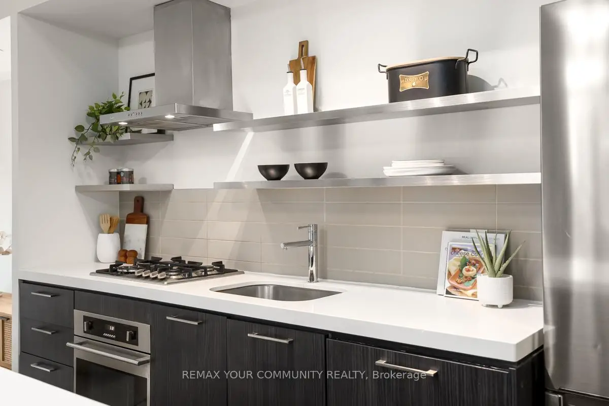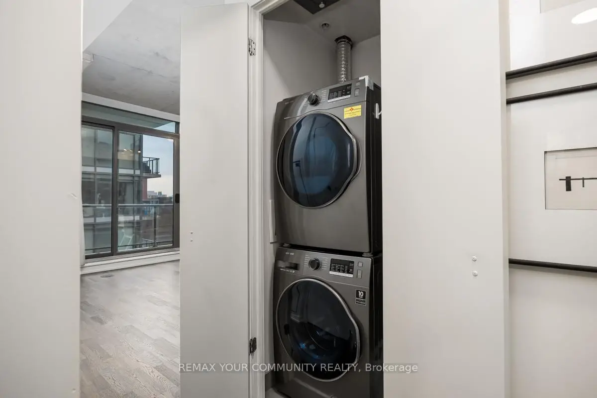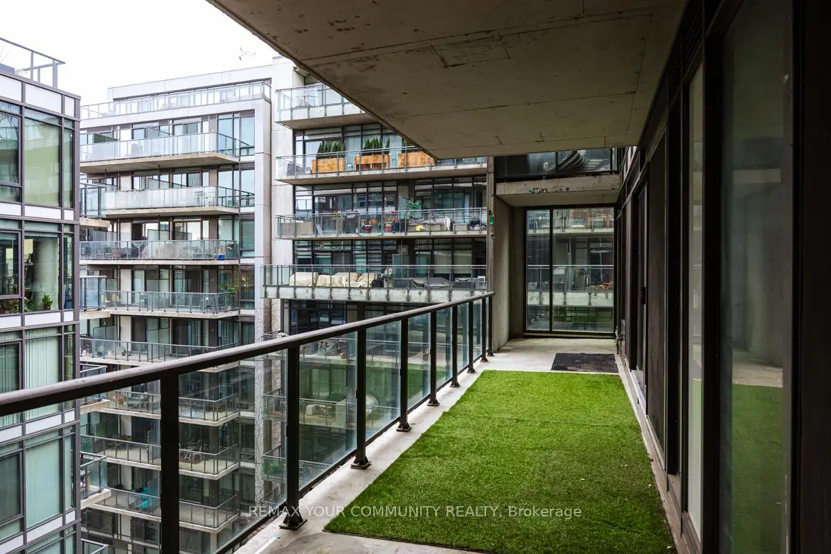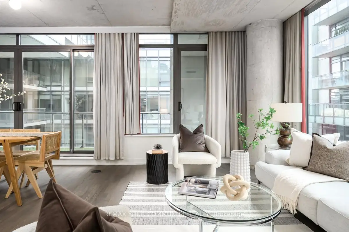 Welcome to Fashion House Lofts located in one of Toronto's most vibrant and iconic neighbourhoods! This bright, freshly painted, open concept suite is 792 sq ft with exposed concrete ceilings and floor to ceiling windows! The modern kitchen has a gas cook-top, SS appliances and large centre island. A Chef's dream! Double sliding doors open to the large 283 sq ft balcony that spans the length of the suite. There is a rare gas BBQ hook-up perfect for entertaining! The primary bedroom also has a sliding door to the balcony for seamless indoor-outdoor relaxing on quiet mornings or evenings. The spacious den provides added space for a generous office ideal for work-life balance. 1 parking and locker are included. Top tier amenities include a stunning infinity pool w/cabanas, gym and party room! Fashion House is just steps to world-class dining, entertaining and transportation. The Keg, Café Renee, Gusto 101, Pai, Aera, Wilbur & Shake Shack are some of the many food options. The Well indoor/outdoor shopping and dining space is an architectural marvel and a must see. There are also countless health and wellness facilities within a 10 min. walk. Fashion House has a near perfect walk and transit score ideal for convenience and luxury living! Don't miss this opportunity to own in one of the most desirable boutique buildings in King West!