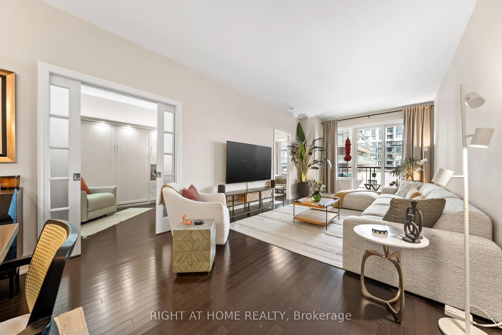 A rare and refined 2 bedroom plus den, 3 bathroom residence, with a versatile den featuring a custom Murphy bed that easily converts into a third bedroom, designed for those who value space, light, and effortless luxury. Offering an impressive 1,358 square feet of interior living paired with a generous 124 square foot terrace, this suite immediately stands apart. Sunlight pours through the south-facing exposure, illuminating the thoughtfully designed layout and highlighting the 9-foot ceilings that enhance the sense of openness throughout. The terrace extends your living space outdoors, creating the perfect setting for morning coffee or evening unwinding. Every detail has been carefully considered. Each bedroom enjoys its own well-appointed space, while the kitchen is both stylish and functional, featuring upgraded cabinetry, granite countertops, and a seamless connection to the living space that makes entertaining feel natural and inviting. Custom built-ins add character and practicality, while two premium parking spots with EV charging and a locker provide everyday convenience.Set within a highly regarded building, residents enjoy access to exceptional amenities including a theatre, indoor pool, spa, gym, yoga studio, guest suites, restaurant, and library. Surrounded by top-rated schools, shopping, transit, and community centres, this is a home that blends comfort, prestige, and lifestyle in one of the city's most desirable settings.
