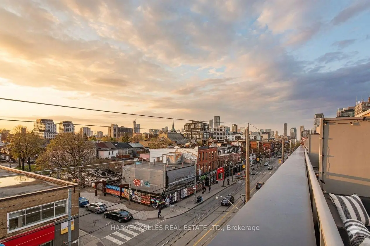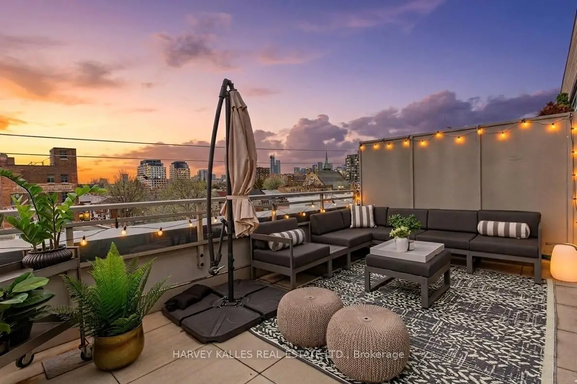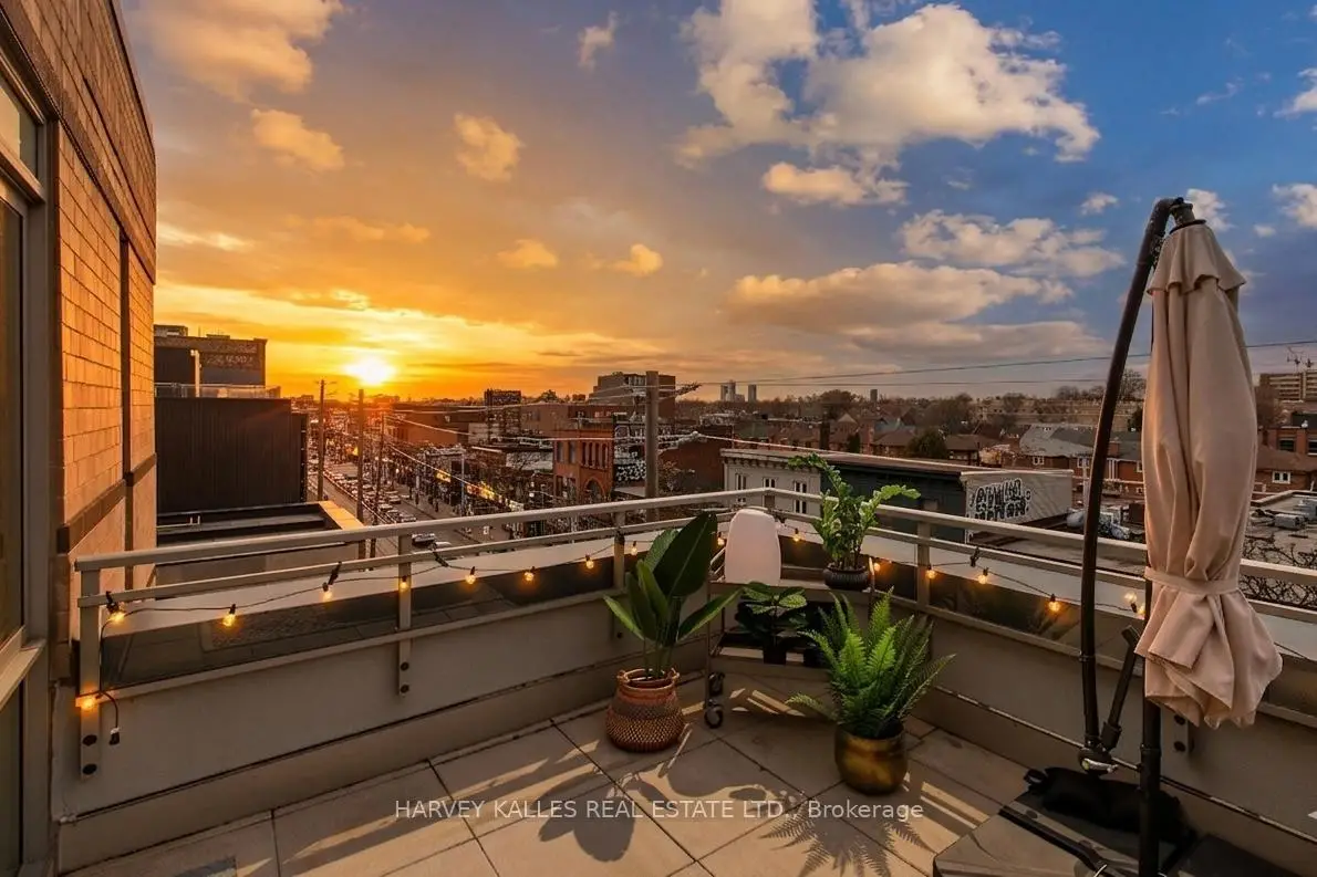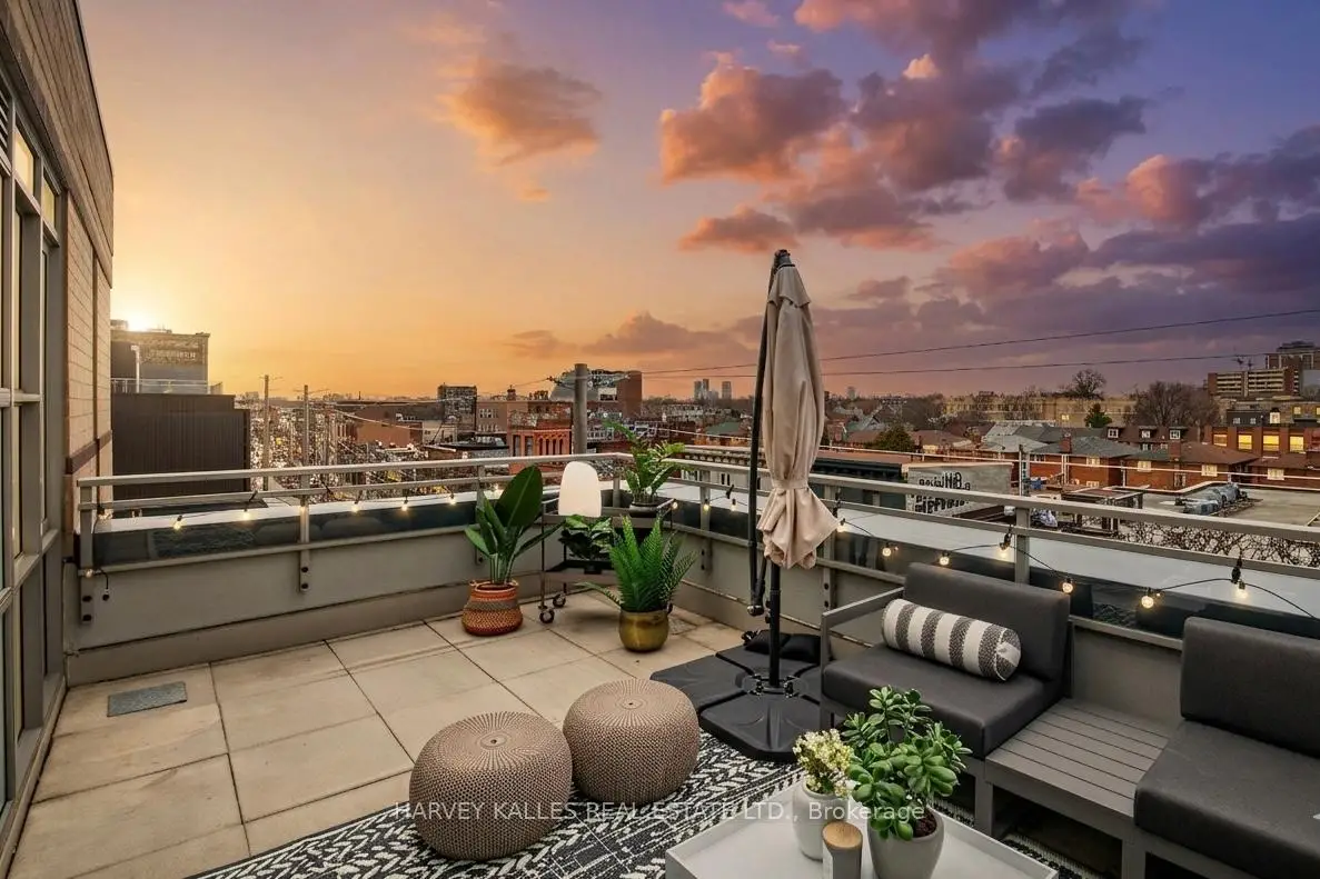 Highly sought-after soft-loft boutique address! This rarely offered end unit presents an elevated take on downtown living. With no neighbour above, enjoy a level of privacy that feels more like a penthouse. Spanning > 1,000 square feet including a standout terrace, paired with 10-foot ceilings, this thoughtfully designed 1 bed + oversized den layout delivers impressive versatility. The den easily functions as a 2nd bedroom, home office, or creative space. The king-sized primary features a walk-in closet and an ensuite, while a separate 2-piece powder room has the potential to be converted into a full 2nd bath. The open-concept living space is stylish and functional, anchored by a sleek modern kitchen with built-in appliances. Step outside to your ultra generous private corner terrace complete with BBQ gas line and water hookup. This outdoor retreat enjoys full sun from morning through evening all summer long, and is an ideal setting for al fresco sunset dining, relaxing, or even gardening, all while taking in the vibrant Queen Street backdrop. With the gym directly across the hall, you are steps from your couch to your workout! Residents enjoy the quiet exclusivity of an intimate building, plus access to a sprawling rooftop deck with sweeping city views. An extra-large parking space and a locker, along with direct underground access to Loblaws, Joe Fresh, and Winners, make daily errands effortless while minimizing winter trips outside. Upcoming lobby and hallway upgrades will further enhance the aesthetic. Perfectly positioned in trendy Queen West, walking distance to everything your heart (and stomach!) could desire. Just moments from King St West, Waterworks Food Hall, The Well, Trinity Bellwoods Park, Kensington Market, and so much more. Convenient TTC transit & the future Ontario Line nearby connect you across the city, and beyond. A rare opportunity to own a standout suite in one of Toronto's most dynamic neighbourhoods. This is urban living at its finest!