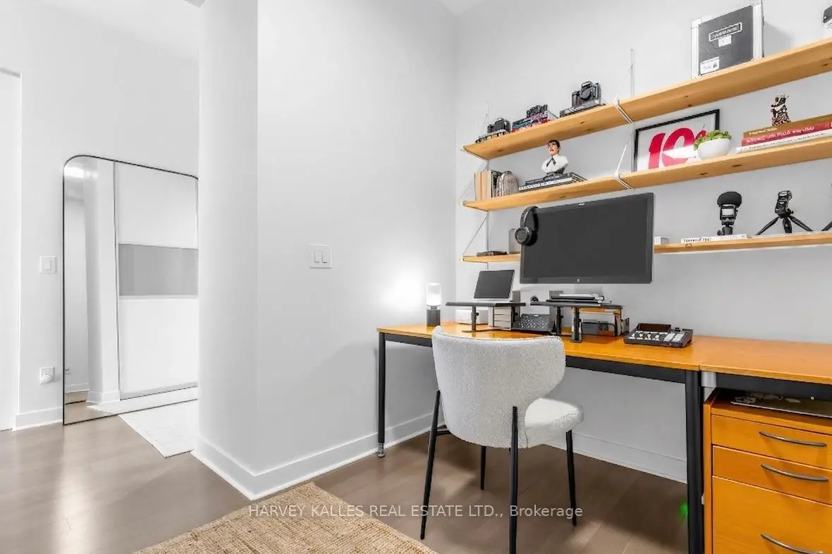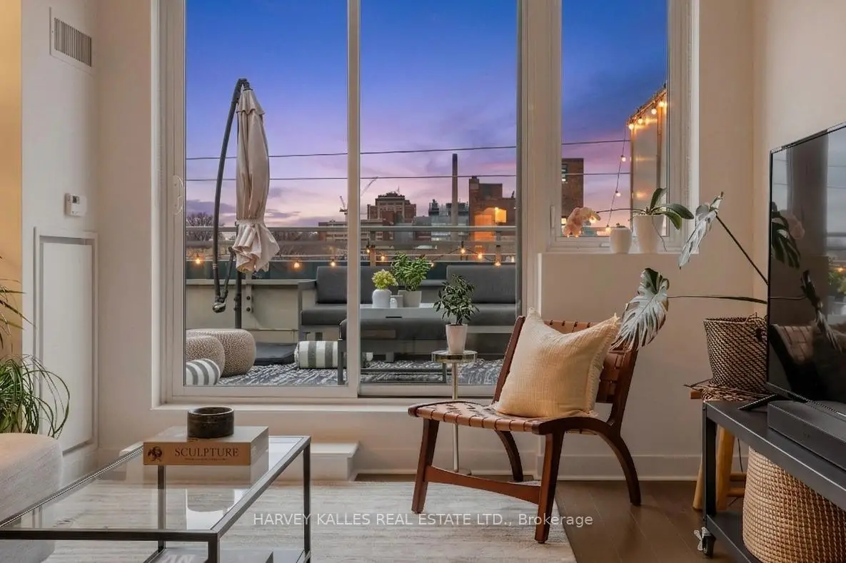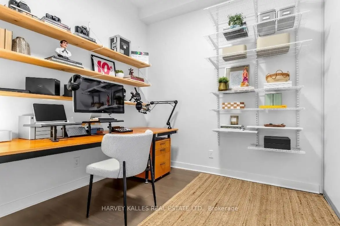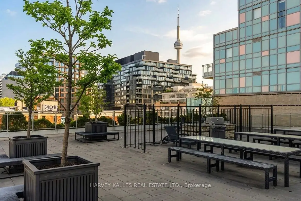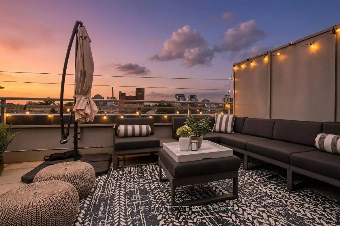 Highly sought-after soft-loft boutique address! This rarely offered end unit presents an elevated take on downtown living. With no neighbour above, enjoy a level of privacy that feels more like a penthouse. Spanning > 1,000 square feet including a standout terrace, paired with 10-foot ceilings, this thoughtfully designed 1 bed + oversized den layout delivers impressive versatility. The den easily functions as a 2nd bedroom, home office, or creative space. The king-sized primary features a walk-in closet and an ensuite, while a separate 2-piece powder room has the potential to be converted into a full 2nd bath. The open-concept living space is stylish and functional, anchored by a sleek modern kitchen with built-in appliances. Step outside to your ultra generous private corner terrace complete with BBQ gas line and water hookup. This outdoor retreat enjoys full sun from morning through evening all summer long, and is an ideal setting for al fresco sunset dining, relaxing, or even gardening, all while taking in the vibrant Queen Street backdrop. With the gym directly across the hall, you are steps from your couch to your workout! Residents enjoy the quiet exclusivity of an intimate building, plus access to a sprawling rooftop deck with sweeping city views. An extra-large parking space and a locker, along with direct underground access to Loblaws, Joe Fresh, and Winners, make daily errands effortless while minimizing winter trips outside. Upcoming lobby and hallway upgrades will further enhance the aesthetic. Perfectly positioned in trendy Queen West, walking distance to everything your heart (and stomach!) could desire. Just moments from King St West, Waterworks Food Hall, The Well, Trinity Bellwoods Park, Kensington Market, and so much more. Convenient TTC transit & the future Ontario Line nearby connect you across the city, and beyond. A rare opportunity to own a standout suite in one of Toronto's most dynamic neighbourhoods. This is urban living at its finest!