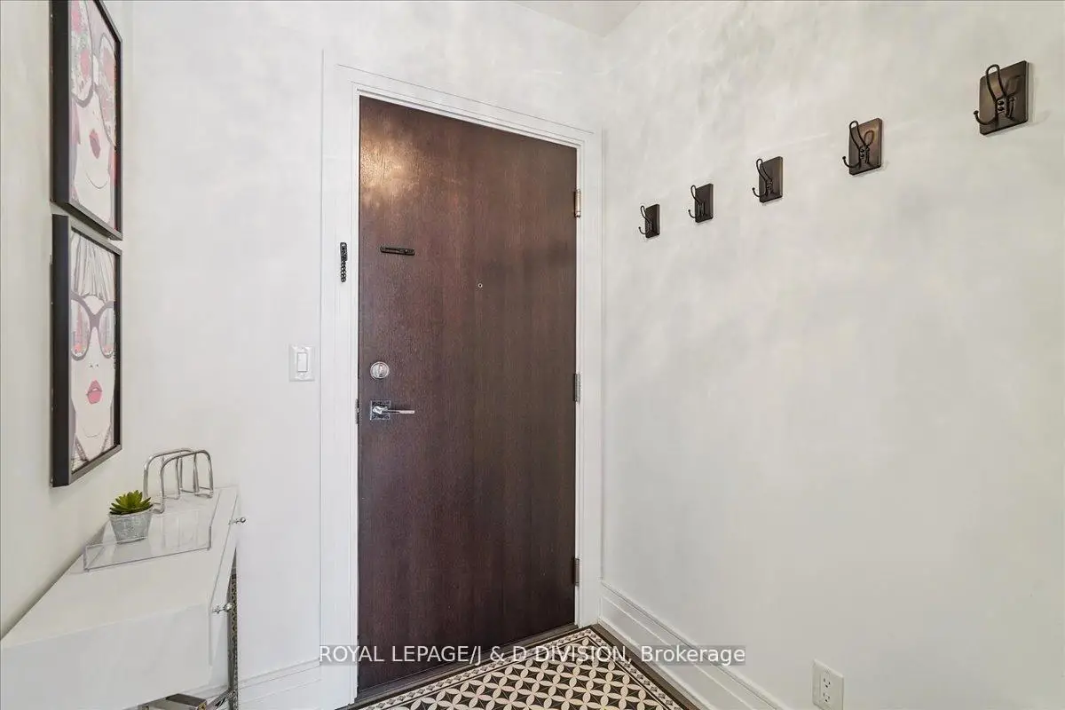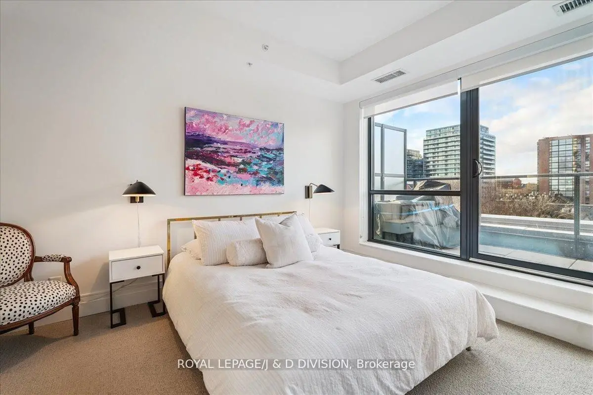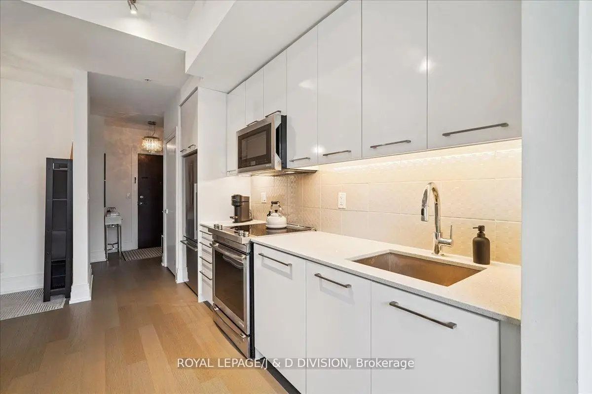 Rare two-storey King West condo with two private terraces. Large windows fill the home with abundant natural light creating a bright and welcoming 882 square feet of living space plus 160 square feet on 2 terraces. Picture your morning coffee on a private terrace while the city quietly wakes up below. The main level features soaring ceilings and an open living and dining area with a well-appointed kitchen, complete with Jenn-Air appliances and a Fisher & Paykel refrigerator and a powder room. The living area flows naturally to a private terrace with a gas BBQ line-perfect for relaxed outdoor dining. A dedicated home office on the main floor provides a comfortable and practical workspace. Upstairs, the primary bedroom easily accommodates a king-size bed and offers unobstructed northern views along with access to a second private terrace. A professionally customized walk-in closet by Simply Closets and convenient second-floor laundry add everyday functionality. The locker is on the second floor and parking is for a motorcycle. A quiet boutique building Residents enjoy a welcoming building community with a party room, bar, expansive outdoor terrace, TV and barbeque. Steps to King West restaurants, groceries, parks, 2 TTC street car access, the future Ontario Line at King & Bathurst nearby and Billy Bishop Airport is within walking distance.
