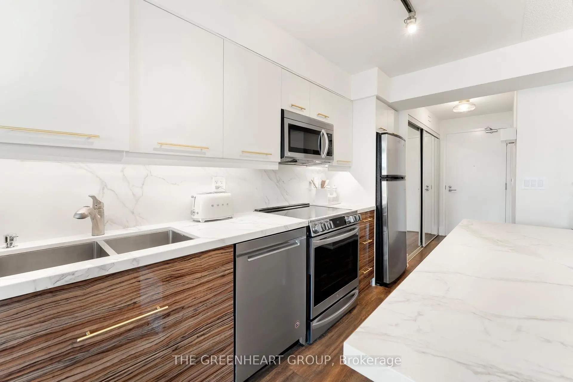 Welcome to this beautifully upgraded 1 bedroom + den condo featuring an open layout and modern finishes throughout. The den has been thoughtfully integrated with the kitchen to create a large center island and open-concept living space, but can easily be converted back if desired. Recent upgrades include a fully renovated bathroom (2024) with a custom quartz vanity, heated backlit mirror, pot lights, new shower and tub fixtures, a sleek glass shower door, and fresh paint. The home is equipped with smart dimmers, smart motorized shades (blackout in the bedroom, privacy in the living room), kitchen under-cabinet smart lighting with adjustable color and temperature, a new washer/dryer (2022), new dishwasher (2026), and a new range (2022). Enjoy incredible views of Lake Ontario, Trillium Park, Coronation Park, and Fort York from the oversized 5 x 21 balcony. Ideally located with 511 and 509 streetcars at your doorstep, June Callwood Park across the street, and walking distance to Exhibition Grounds, BMO Field, Loblaws, Shoppers, LCBO, Budweiser Stage, and Billy Bishop Airport. The building offers exceptional amenities including a gym, indoor pool, hot tub, yoga room, sauna, rooftop terrace with BBQs and a hot tub, bike cage storage, and 24/7 security with package storage.