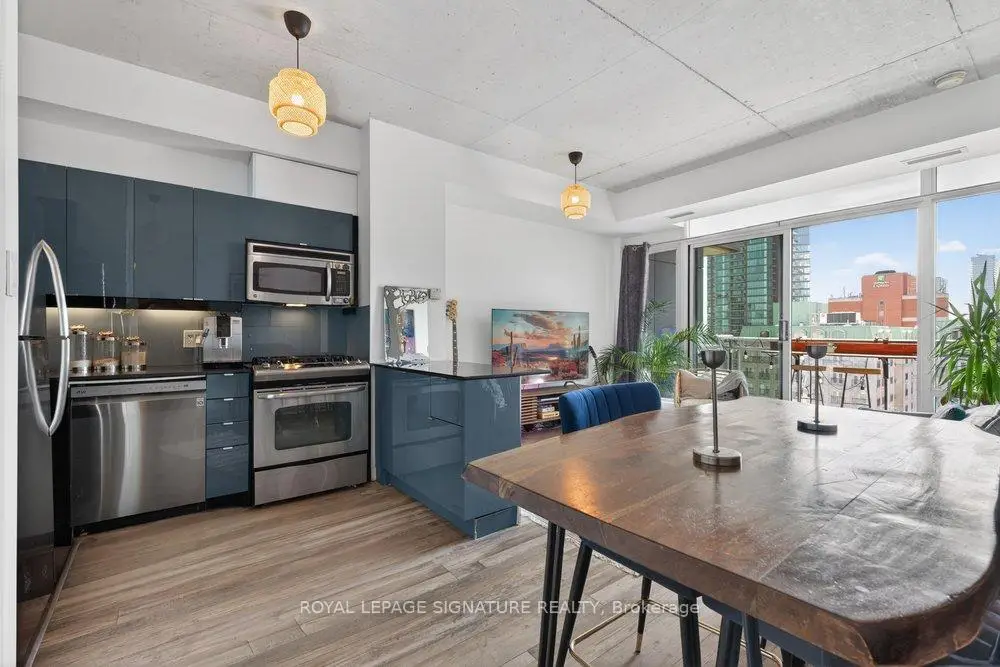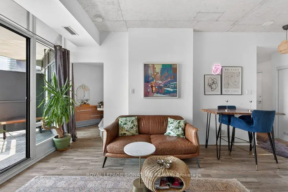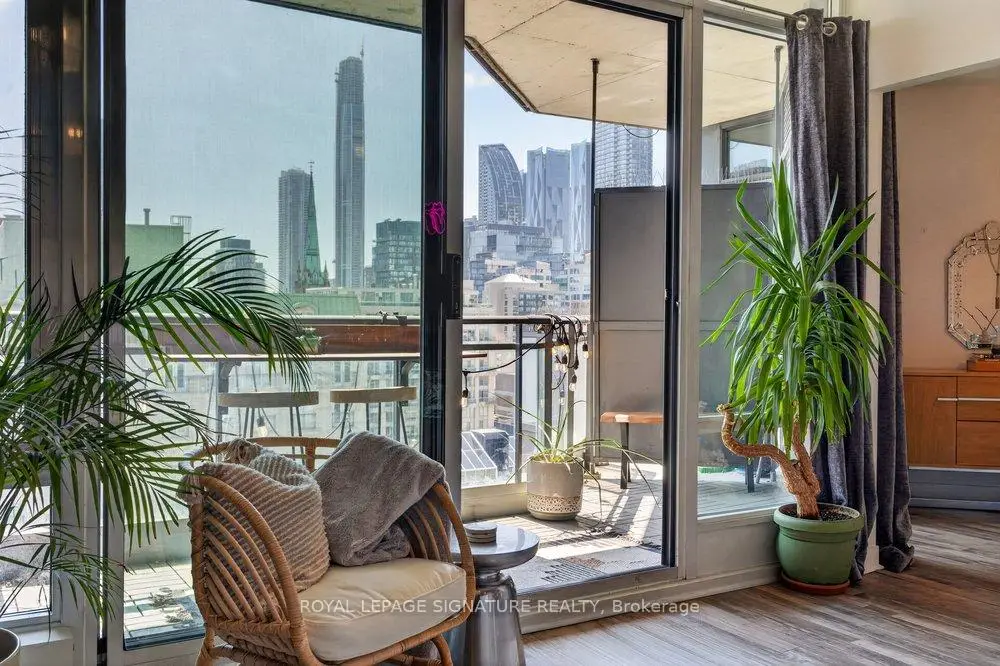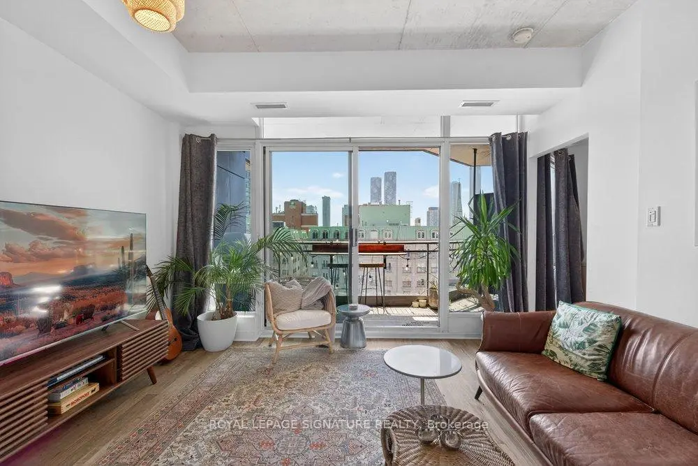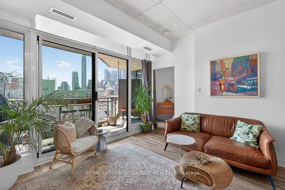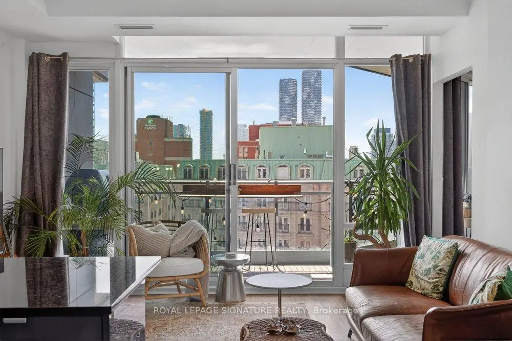 Welcome to Glasshouse Lofts, an exceptional loft residence in the heart of downtown Toronto, perfectly positioned at Queen & Jarvis in the vibrant Church-Yonge Corridor, where the charm of the Garden District meets the historic character of the St. Lawrence Market neighbourhood, all just moments from the Financial District. Soaring 9'3" exposed ceilings and dramatic floor-to-ceiling windows set the tone, flooding the space with natural light while framing breathtaking, unobstructed views of the French Quarter and the city skyline, creating an old-world European charm. The desirable wide layout creates a sense of openness rarely found in downtown condos, offering a highly functional layout for everyday living and effortless entertaining.The thoughtfully renovated kitchen is a true standout, featuring modern finishes and a coveted gas stove, a rare luxury in high-rise living, making it a space where cooking becomes a genuine pleasure. Just beyond, step out to your private balcony, complete with a natural gas BBQ hookup. Generous in size, it feels like a true extension of the living space, perfect for hosting dinner gatherings, cocktail evenings, or enjoying quiet al fresco moments with a stunning urban backdrop. Beautiful laminate flooring flows seamlessly throughout, adding warmth and continuity to the space. The generously sized bedroom provides a peaceful retreat, featuring a double closet and a private walkout to the balcony, where morning coffee comes paired with a view worth waking up for. Step outside and immerse yourself in the pulse of the city. Surrounded by Toronto's most sought-after destinations, from St. Lawrence Market and St. James Park to the Eaton Centre, everything is just steps away. Transit is exceptionally convenient, with streetcars at your doorstep and a short walk to Queen Subway Station. This isn't just a home, it's a lifestyle. A refined urban escape with a distinctly European feel tucked into one of Toronto's most dynamic neighbourhoods.