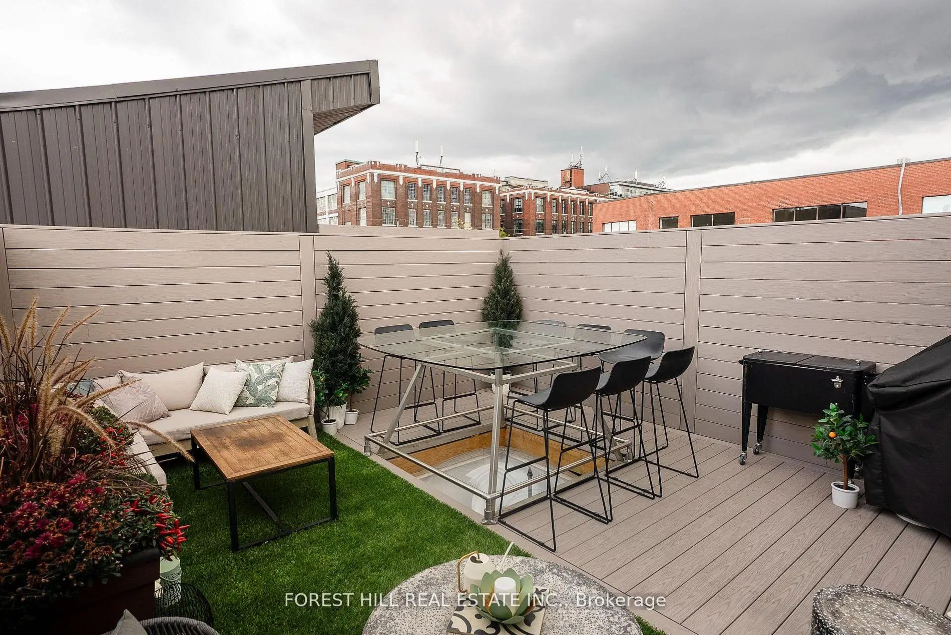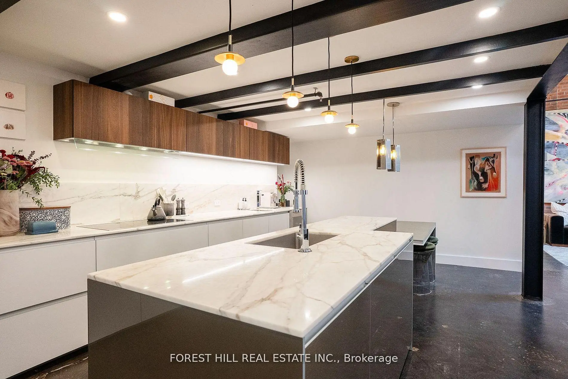 Welcome to The Gallery, a rare three-level designer loft offering over 2,500 sq.ft of interior space and a 375 sq ft rooftop terrace. This residence embodies refined urban sophistication with 26-foot ceilings, exposed brick, polished concrete floors, and gallery lighting. The Ernestomed a kitchen, with more than $150,000 in upgrades, features Gaggenau and Miele appliances, Calacatta marble, a bar sink and wine fridge. The main level showcases a Kelly Wearstler marble mosaic bathroom, combining artful design with luxurious finishes. A floating oak staircase leads to the mezzanine primary suite with herringbone floors, double sinks, and a marble walk-in shower. The private rooftop retreat offers high-end composite decking, multiple seating areas, and a custom dining table suspended over a skylight. Set in the heart of Leslieville, just one block from the new Ontario Line subway, The Gallery defines contemporaryToronto living.