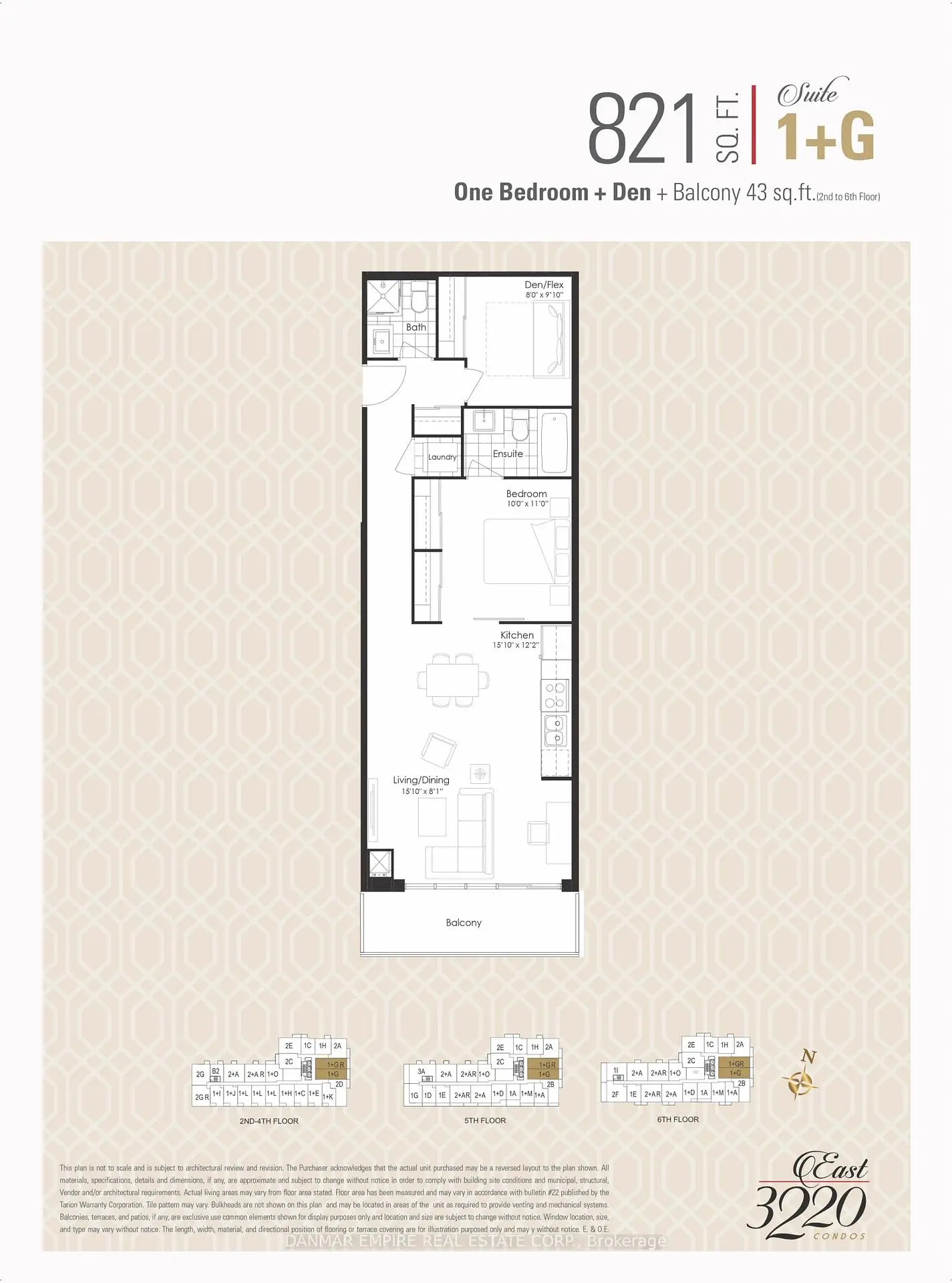 821 sq. ft. as per the approved floor plan attached. This is a brand new unit from the builder's inventory. The buyer may qualify for the HST/GST credit on closing and should verify this with their lawyer. Closing is subject to the builder's fixed closing costs. Please submit offer information on the OREA form. All accepted offers will be prepared and executed on the builder's forms in order to be eligible for the Tarion warranty.The unit features 1 bedroom plus large Den and 2 bathrooms, faces north, and is located away from the main road.