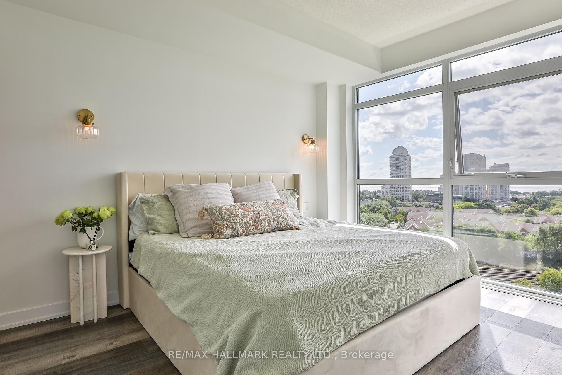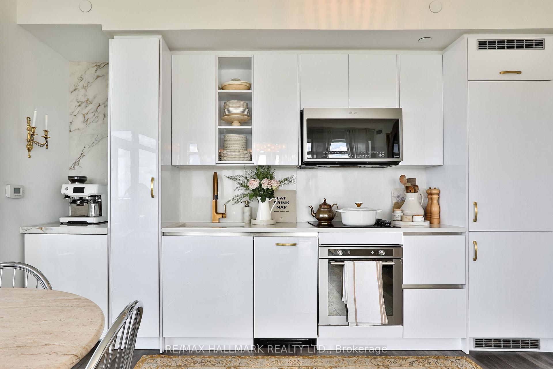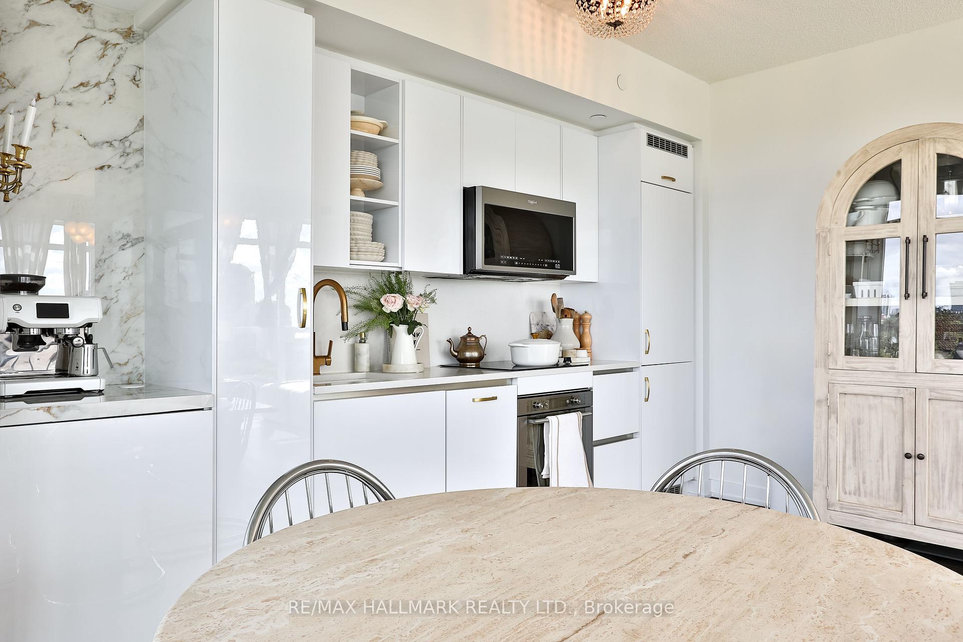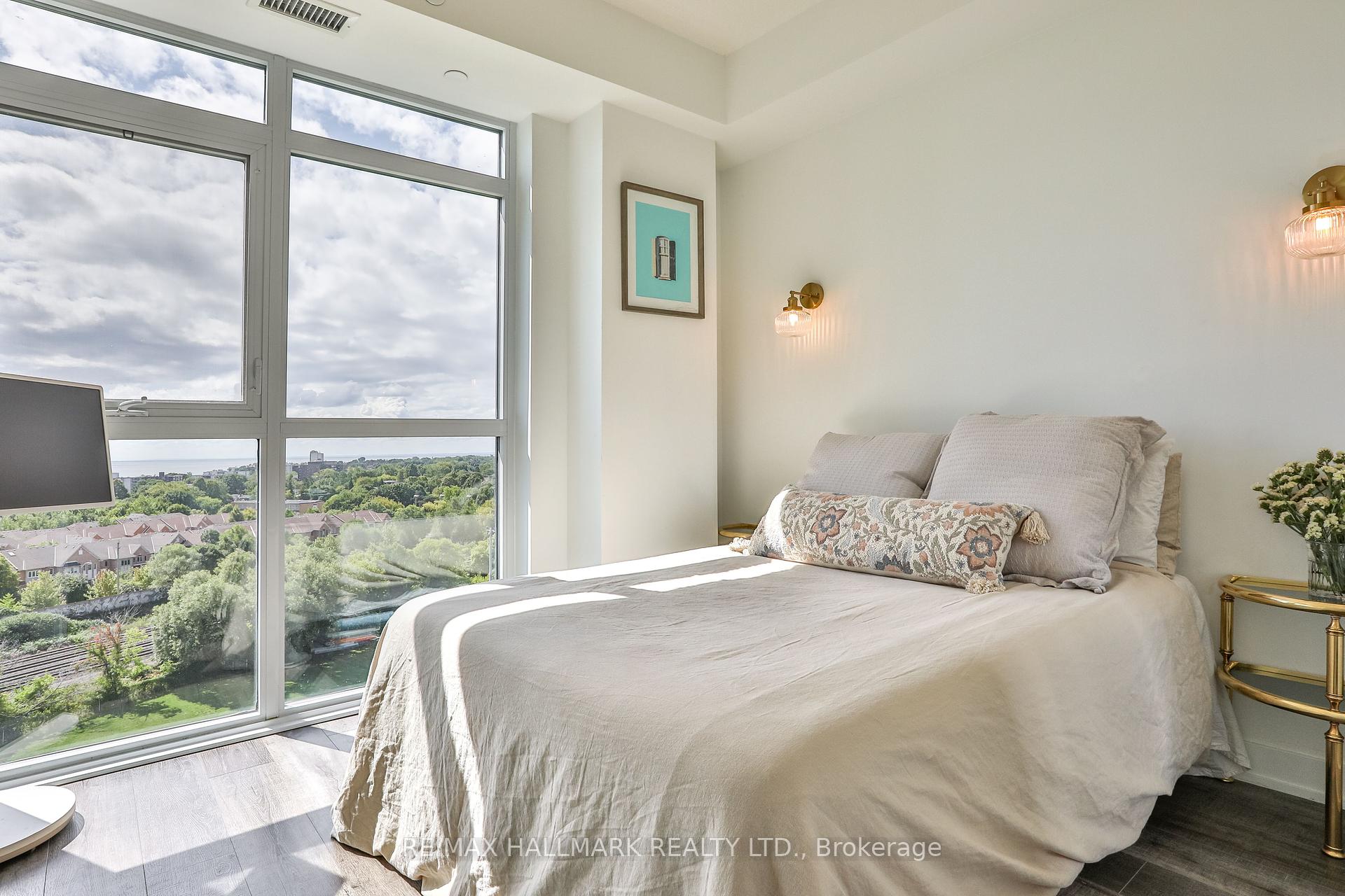Welcome to this beautifully upgraded 2-bedroom, 2-bathroom condo offering 920 sq ft (including balcony) of thoughtfully designed living space with southwest exposure and sweeping views of Lake Ontario. Bright and modern, the open-concept layout showcases a sleek kitchen with a built-in coffee bar featuring porcelain counters and backsplash, an integrated flush fridge, flush cooktop, and undermount sink for a seamless designer look.The spacious living area opens to a private balcony, recently enhanced with custom paver tiles and outdoor pot lights perfect for entertaining or relaxing at sunset. Both bedrooms feature upgraded light fixtures with modern bedside sconces, creating a warm and elegant ambiance. With two generously sized bedrooms, the home is ideal for professionals or couples needing a dedicated work-from-home space. Added conveniences include in-suite laundry, two storage lockers, and a parking spot near the elevator with EV charging rough-in.The building offers resort-style amenities: outdoor pool, sauna, fully equipped gym, yoga studio, pet wash station, and 24-hour concierge and security.Unbeatable location steps from Mimico GO Station for an easy downtown commute, minutes to major highways, and a short walk to the waterfront trail for biking, running, or lakeside strolls. A perfect balance of urban convenience, lakeside tranquility, and work-from-home practicality.