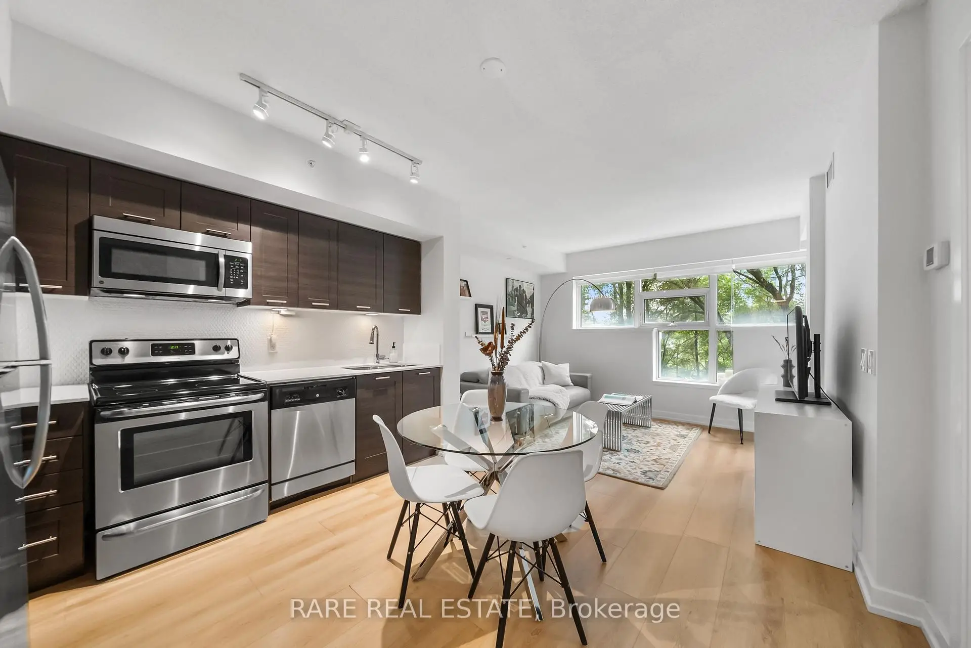 Where Nature Meets City Energy. Set within the vibrant Westlake Village community, this spacious suite captures the calm of the nearby river and treetop views that bring a touch of nature to everyday living. Bathed in west-facing light, the home feels peaceful, airy, and effortlessly livable. Inside, a modern kitchen anchors the space with granite countertops, stainless steel appliances, and an open flow designed for both comfort and connection. Brand new flooring (2023) adds a clean, contemporary finish throughout. The spacious bedroom offers room to unwind, with large windows framing the serene natural landscape beyond. A private balcony extends the living space outdoors, the perfect spot for morning coffee, an evening glass of wine, or simply a quiet breath of fresh air surrounded by greenery. Designed for convenience, this third-floor suite sits right beside the stairwell, ideal for dog owners or anyone who loves an easy step outside to the nearby trails, parks, and waterfront paths. Step out your door and everything you need is within reach: Metro, Shoppers, LCBO, restaurants, cafes, and the TTC all at your doorstep. Highway access is just minutes away, making every commute or weekend escape seamless. This is Westlake living at its best - a modern condo surrounded by nature, where every detail makes life feel just a little bit easier, and a lot more beautiful.