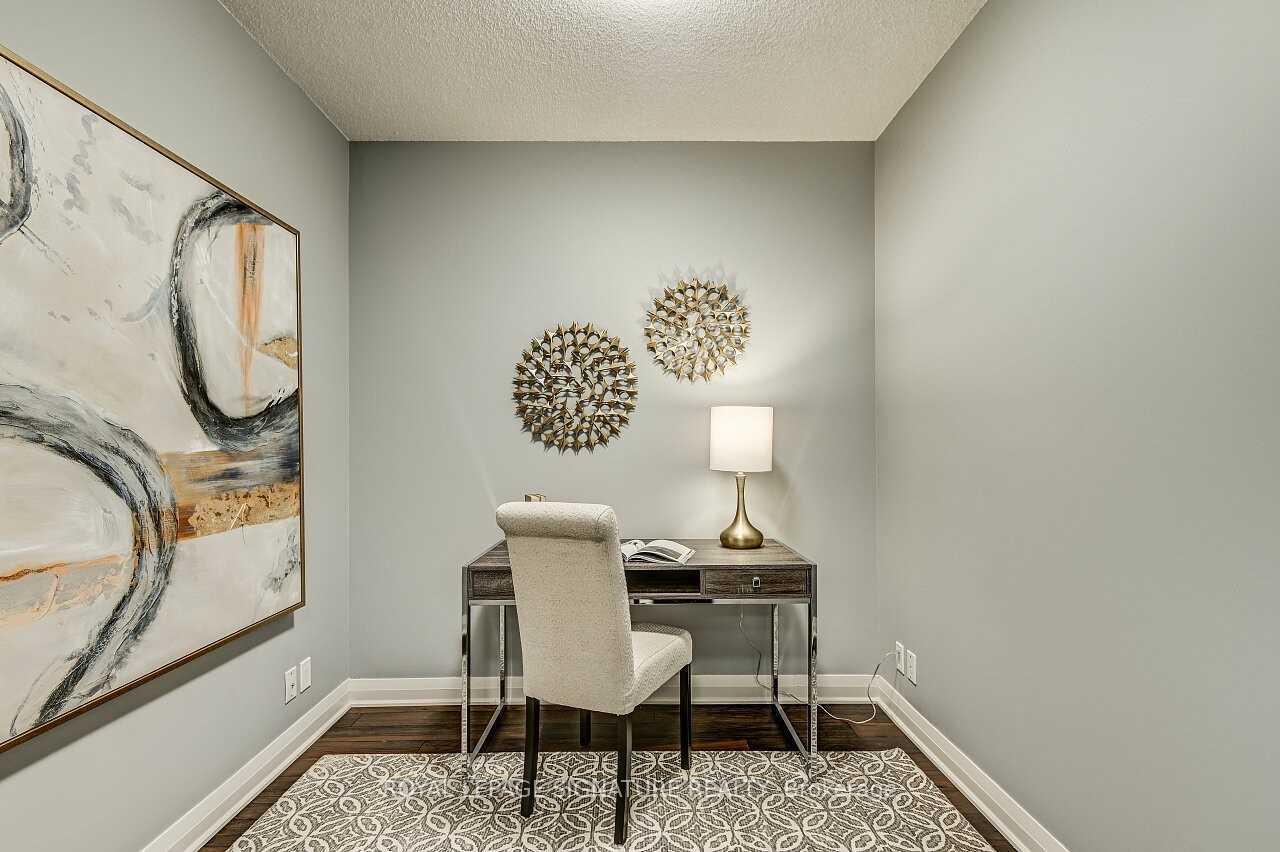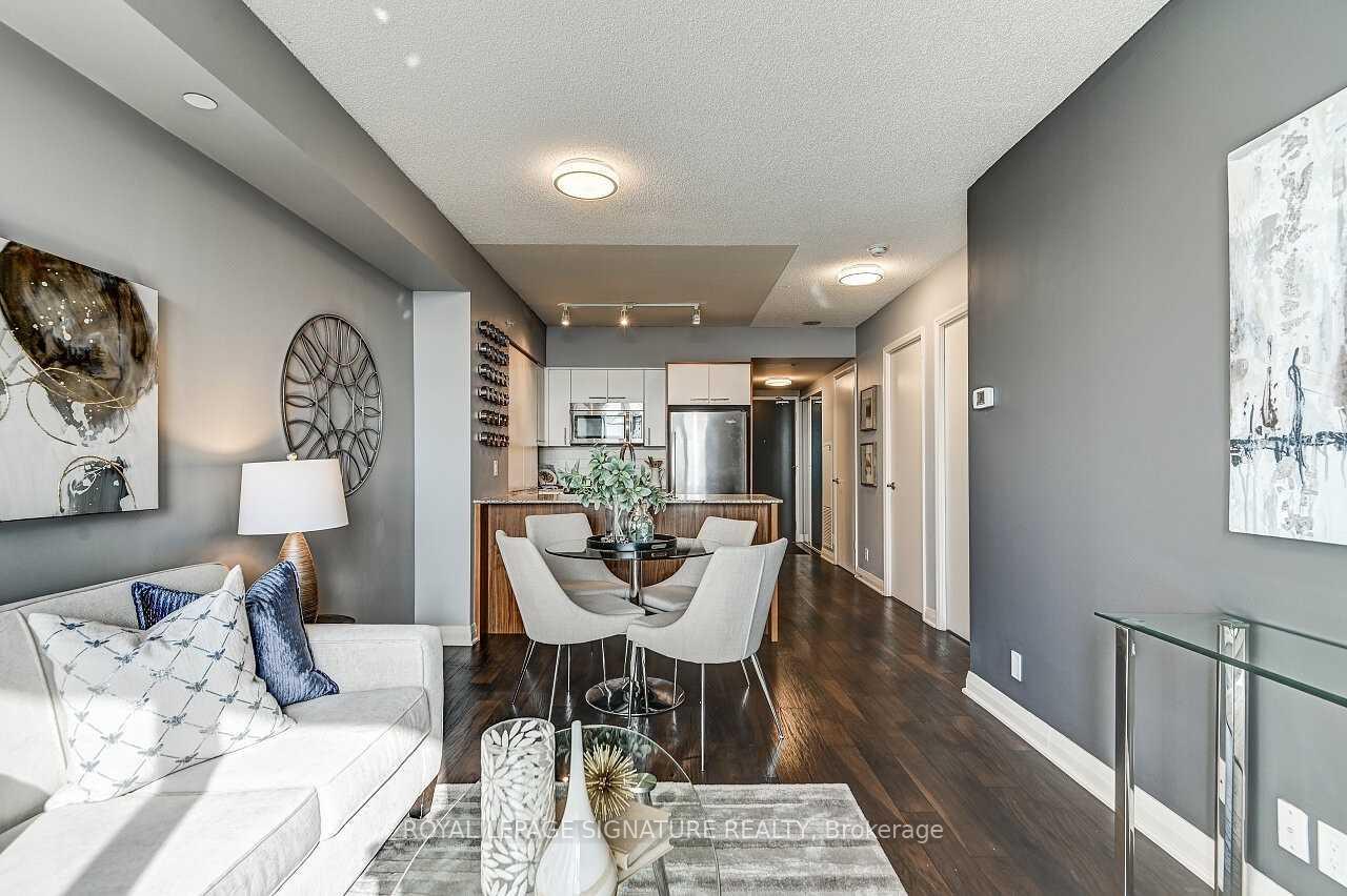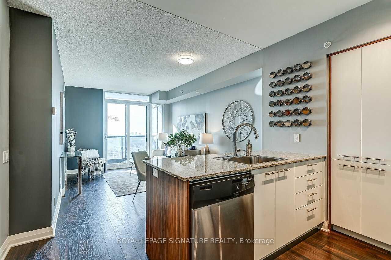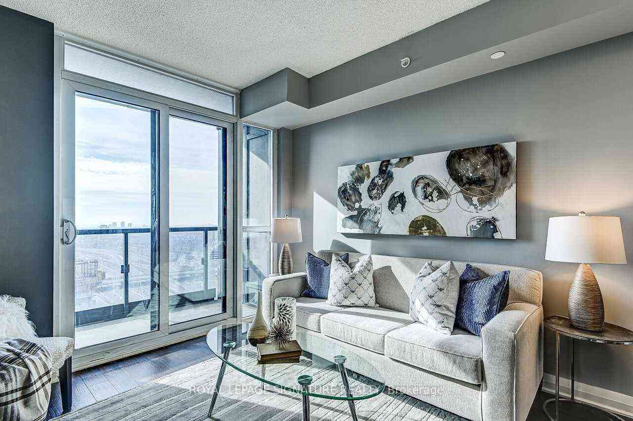 Stunning 1 Bedroom + Den with South Exposure.This bright and stylish suite offers 9-foot ceilings, modern laminate flooring, and convenient in-suite laundry. The open-concept kitchen features granite countertops, a breakfast bar which is great for entertaining, stainless steel appliances, and plenty of cabinetry. The sun-filled living area provides a walk-out to a private south-facing balcony, perfect for taking in panoramic views of Downtown Toronto, including the iconic CN Tower. The spacious primary bedroom includes a floor-to-ceiling window and a walk-in closet.Residents enjoy an impressive selection of resort-style amenities, including an indoor pool,sauna, fitness centre, yoga studio, guest suite, movie theatre, outdoor BBQ area, pet park, anda party/game room.The building offers 24-hour concierge service, secure parking (one spot included), and an unbeatable location close to Hwy 427, QEW, TTC, Kipling GO Station, shopping, dining,entertainment, top-rated schools, parks, Trillium Hospital and more.