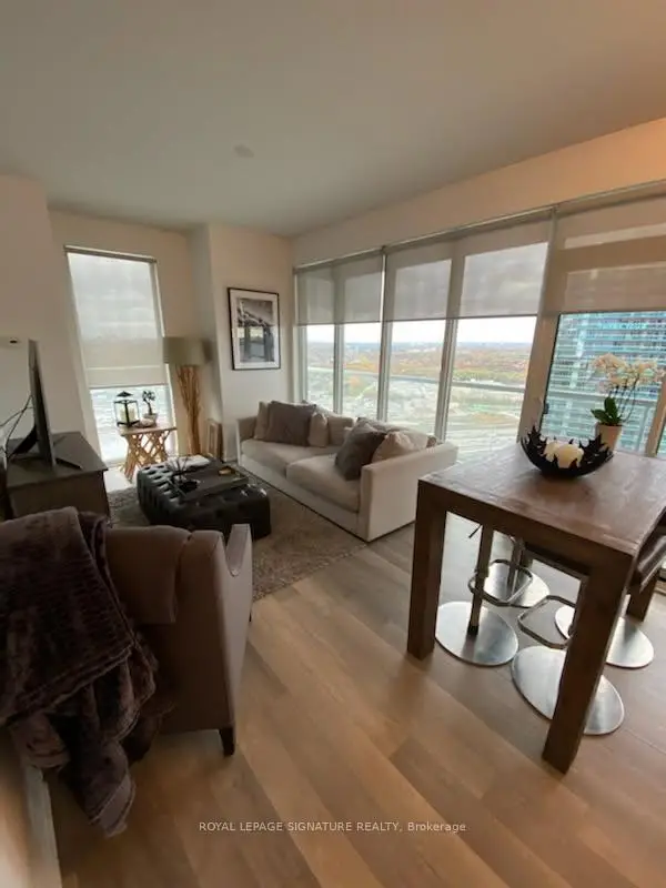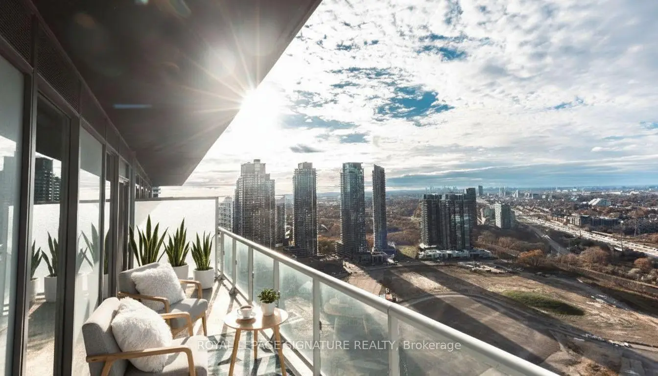 Step into elevated living at Lago at the Waterfront, where this spacious corner suite offers uninterrupted water and skyline views from every room. This bright 2-bedroom layout is flooded with natural light thanks to its desirable southeast exposure as well as north-facing afternoon sun. Enjoy the luxury of a wraparound balcony with multiple access points from the living room as well as both bedrooms - perfect for seamless indoor-outdoor living. The sleek, modern kitchen is equipped with quartz countertops and stainless steel appliances, flowing effortlessly into an open-concept living and dining space designed for everyday comfort and effortless entertaining. Enjoy breathtaking downtown, CN Tower, lake, and cityscape views right from your living room. The primary suite features a large walk-in closet and direct balcony access. Spacious second bedroom has a large closet and balcony access. Parking & Locker Included. Exceptional Building Amenities include: Indoor Pool, Hot Tub & Sauna, Fully Equipped Fitness Centre, Party Room & Guest Suites, Outdoor BBQ Terrace, Dog Wash Station & Car Wash, 24-Hour Concierge & Ample Visitor Parking. Located in the sought-after Humber Bay Shores community, you're steps to waterfront parks, scenic trails, local cafés, restaurants, shopping, and transit. This is a rare opportunity to secure a move-in-ready waterfront home with resort-style amenities at a price that offers exceptional value.