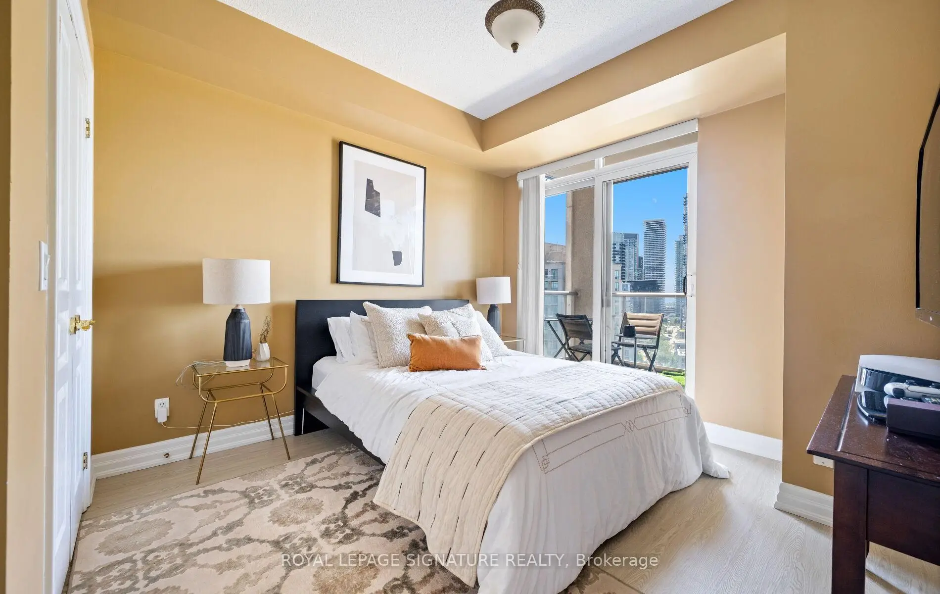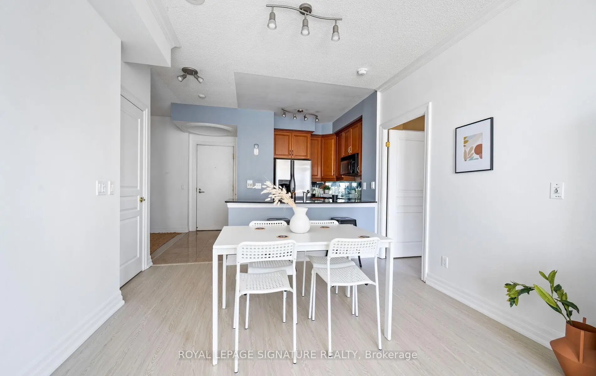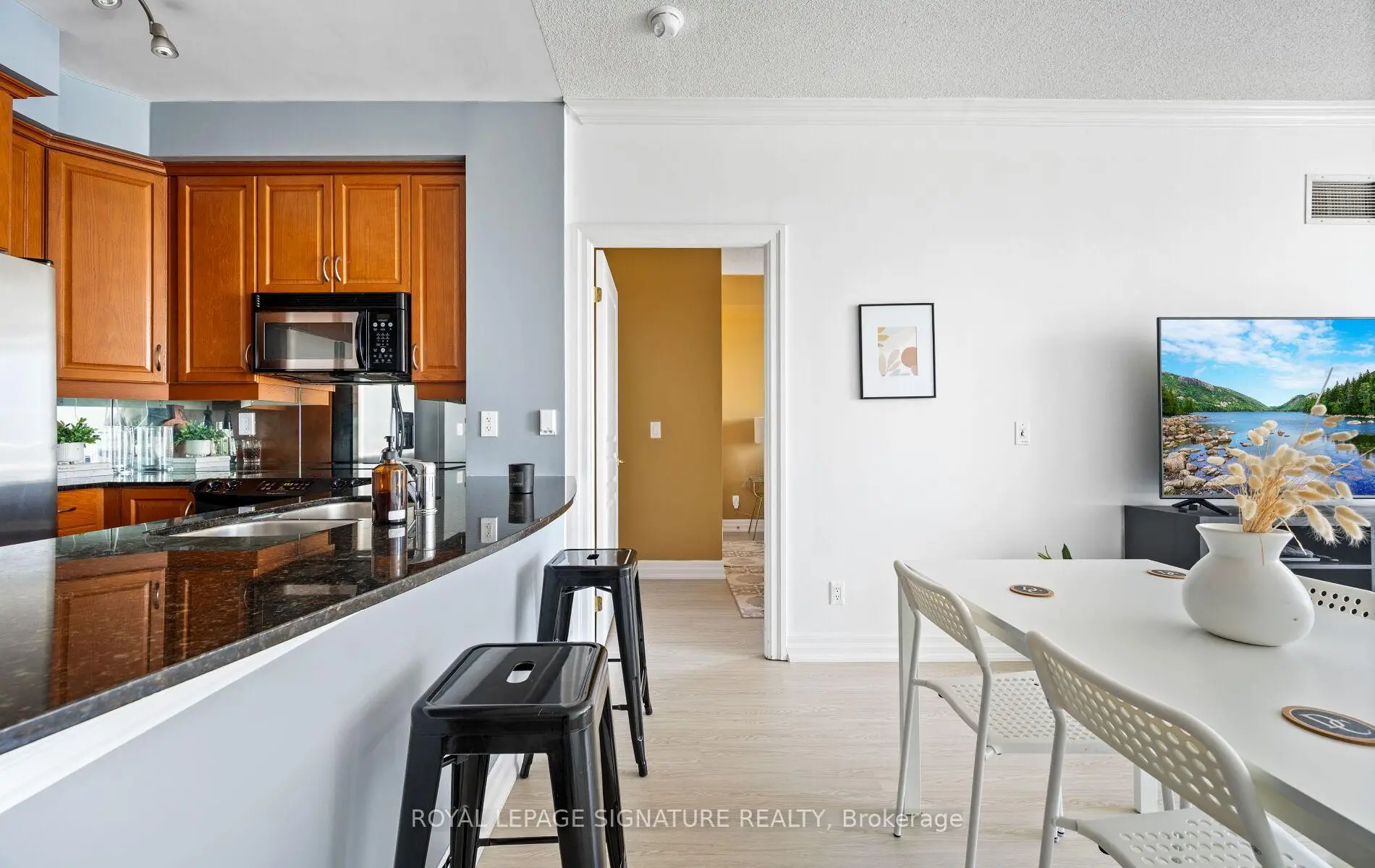 Welcome to The Waterford-where sophisticated lakeside living meets urban convenience in one of Toronto's most sought-after waterfront communities. This spacious and beautifully maintained656 sq. ft. 1-bedroom condo offers a smart, open-concept layout that's perfect for both entertaining and everyday comfort. Step into a freshly updated suite featuring brand new laminate flooring throughout, adding a modern and seamless look. The contemporary kitchen is outfitted with granite countertops, mirrored backsplash, stainless steel appliances, and a breakfast bar that opens into the inviting living and dining area-ideal for hosting or unwinding after a long day. Crown mouldings add a touch of elegance, and the upgraded washer/dryer offers added convenience. Walkout to your private balcony, where you can BBQ and enjoy partial lake views-a rare luxury in condo living. The generously sized bedroom includes a walk-in closet with ample storage space, offering comfort and functionality in one. Whether you're working from home, entertaining guests, or enjoying peaceful lakeside mornings, this suite checks all the boxes. The Waterford is a boutique-style building known for its timeless design, upscale amenities, and unbeatable location. Just steps to the TTC, Humber Bay Park, waterfront trails, and Lake Ontario, plus minutes to the Gardiner Expressway for easy downtown access. Live your best life in Humber Bay Shores, surrounded by lush green space, vibrant cafés, restaurants, and all the conveniences of urban living-all while enjoying the tranquility of the lake at your doorstep.