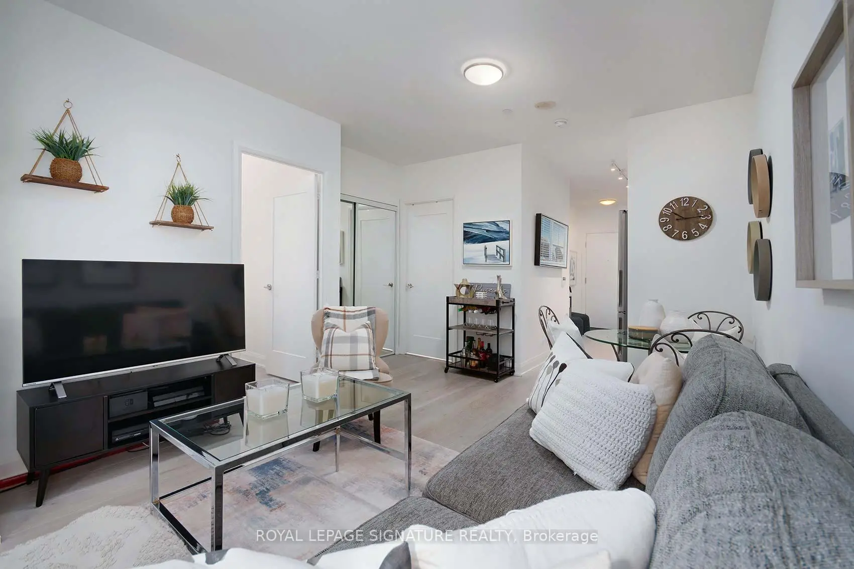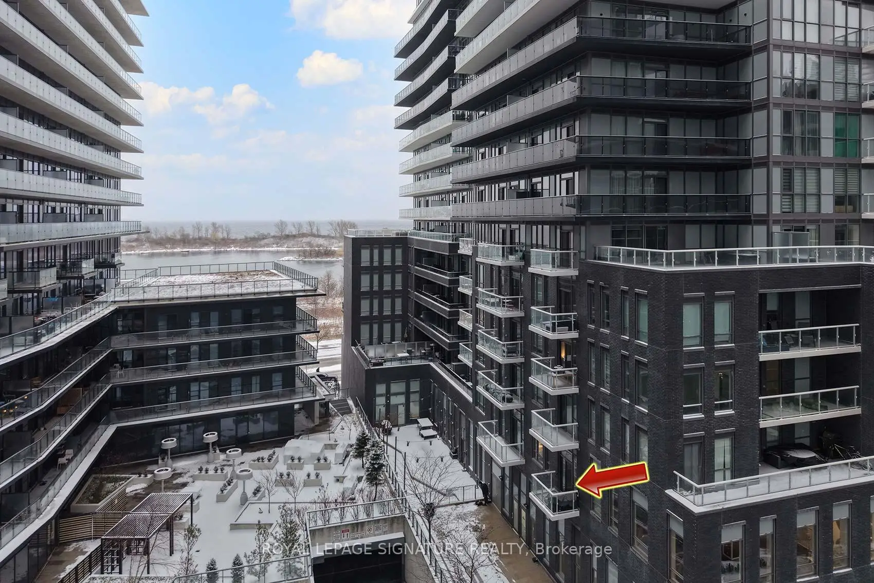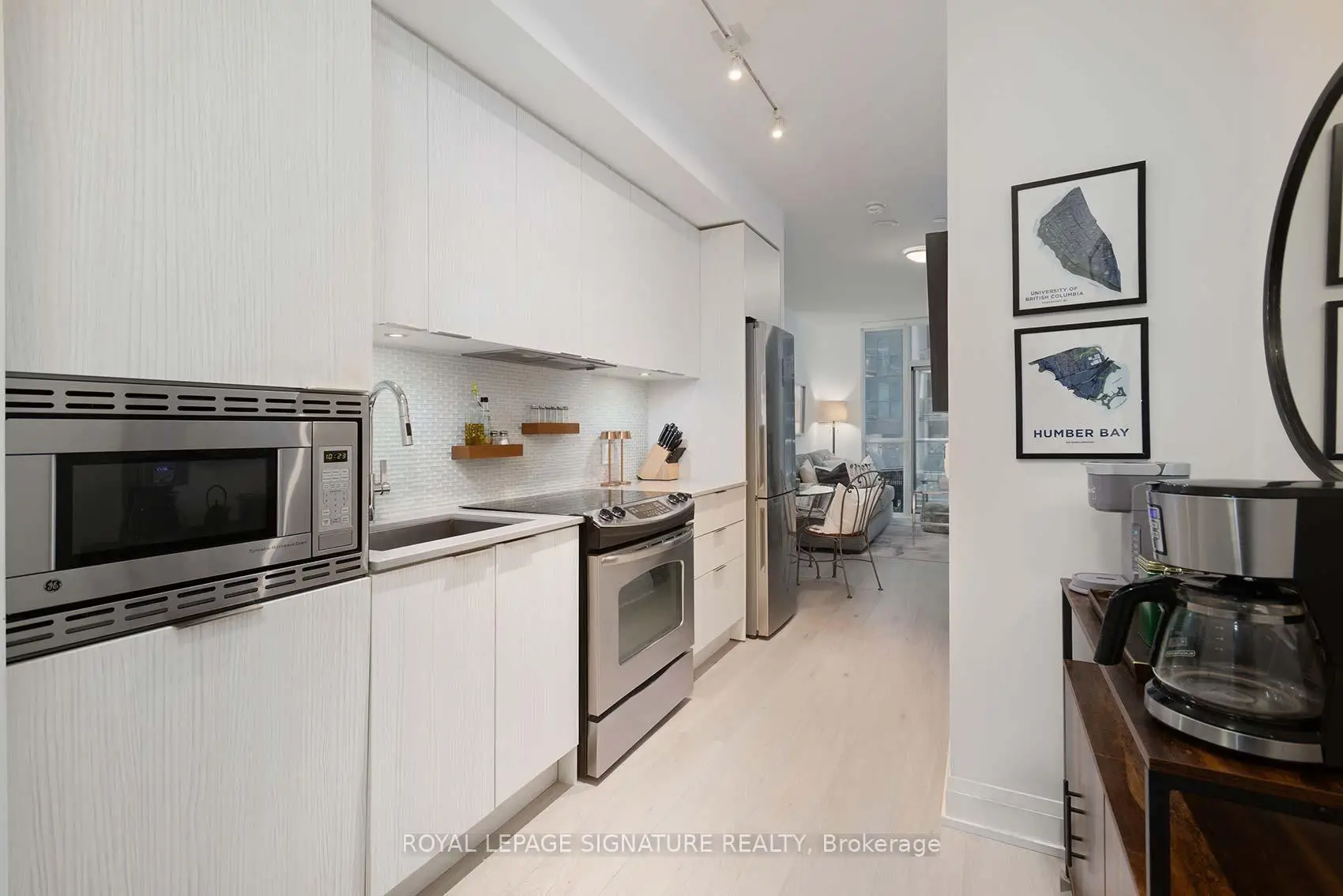 Welcome Riva del Lago - A Monarch-built luxury 16-storey boutique condo in the highly sought-after Humber Bay Shores waterfront community. This beautiful residence is ideally located just steps from Lake Ontario and offers 551 SQ FT of functional space, carpet-free layout featuring one generously sized bedroom with a walk-in closet complete with custom organizers, and one full bathroom. Wide plank, Light-coloured laminate flooring flows throughout the unit, enhancing the bright and modern feel. The contemporary kitchen is equipped with contemporary cabinetry, quality appliances, quartz counters, glass tile backsplash under mount lights & an under mount sink. Enjoy your private 35 sq ft BALCONY with serene partial views overlooking Humber Bay, and the added convenience of being located next door to the building's fitness facilities. Additional features include one secure underground PARKING SPACE, a STORAGE LOCKER and Convenient Ensuite Stackable Washer & Dryer. Residents have access to exceptional amenities including a fully equipped two-storey fitness centre, indoor pool, sauna, party room, 24/7 concierge, Theatre room, "Pet-Washing" Room, Guest Suite and visitor parking. You can literally step out of the building and grab a coffee or a bite to eat, at one of the many bakeries or eateries. Conveniently situated minutes from the Gardiner Expressway, with TTC and streetcar access just steps from the building, commuting to downtown Toronto is effortless. Surrounded by scenic lakeside trails, ideal for jogging and cycling, as well as walkable dining, nearby shopping, and leisure options-this home offers the perfect balance of urban convenience and waterfront living. Please see ATTACHED FEATURE SHEET for all upgrades and information. FLOOR PLAN also attached.