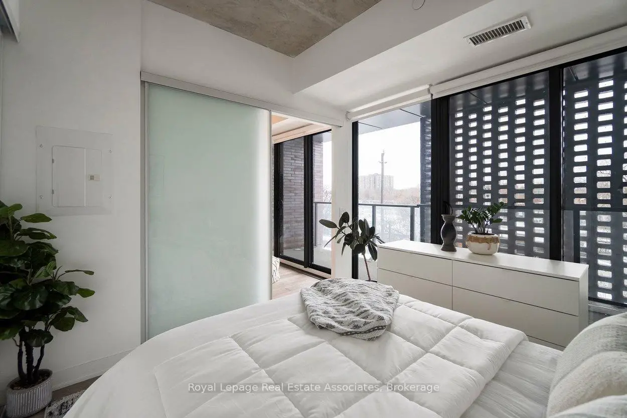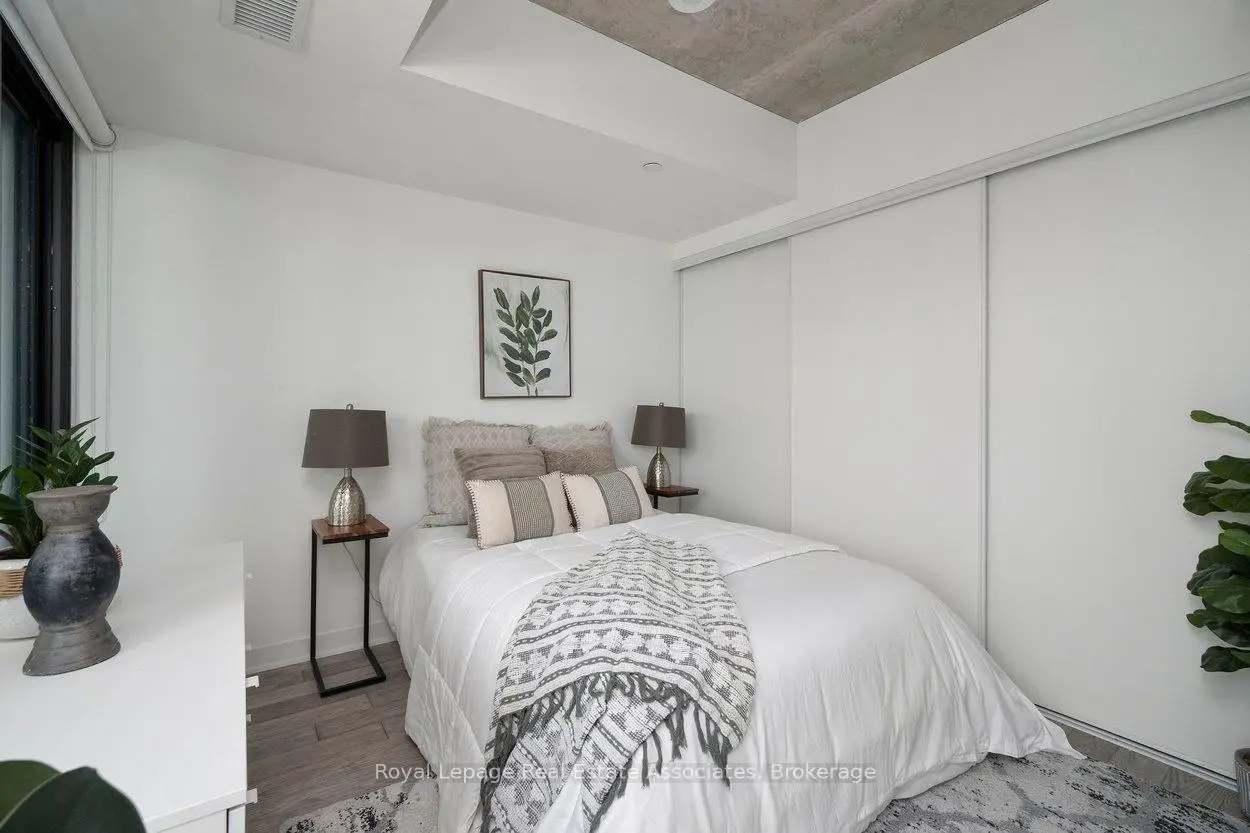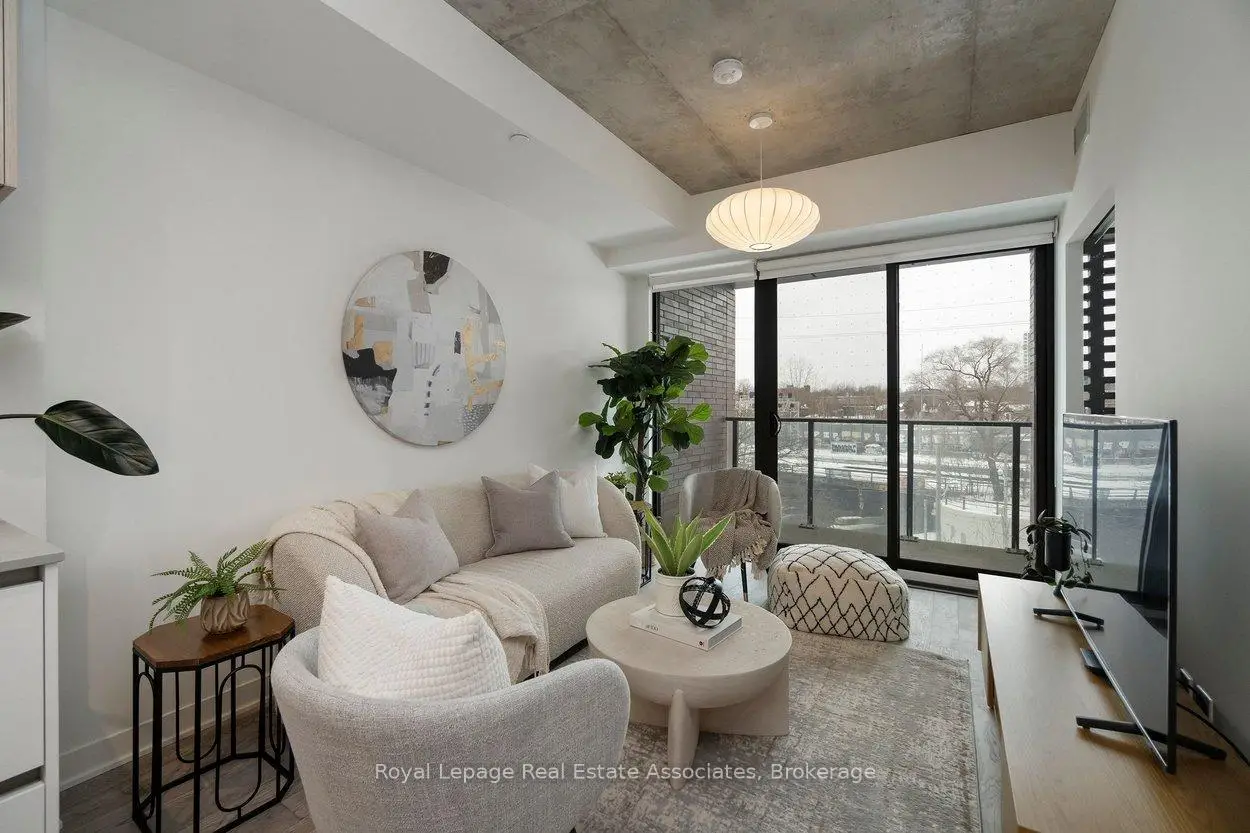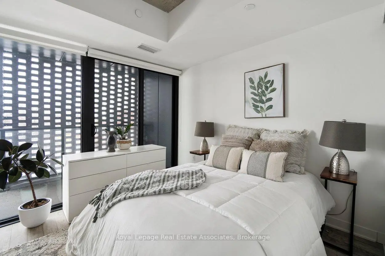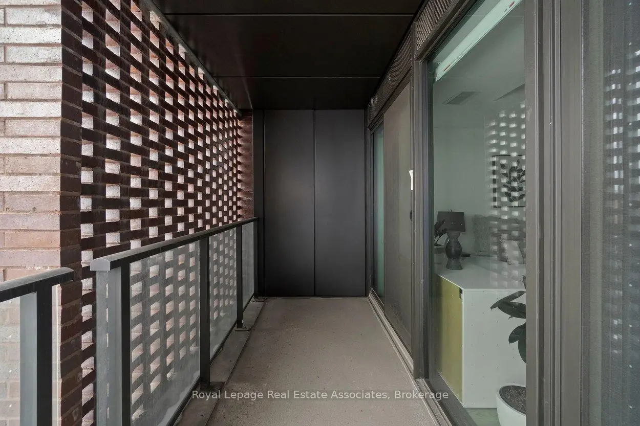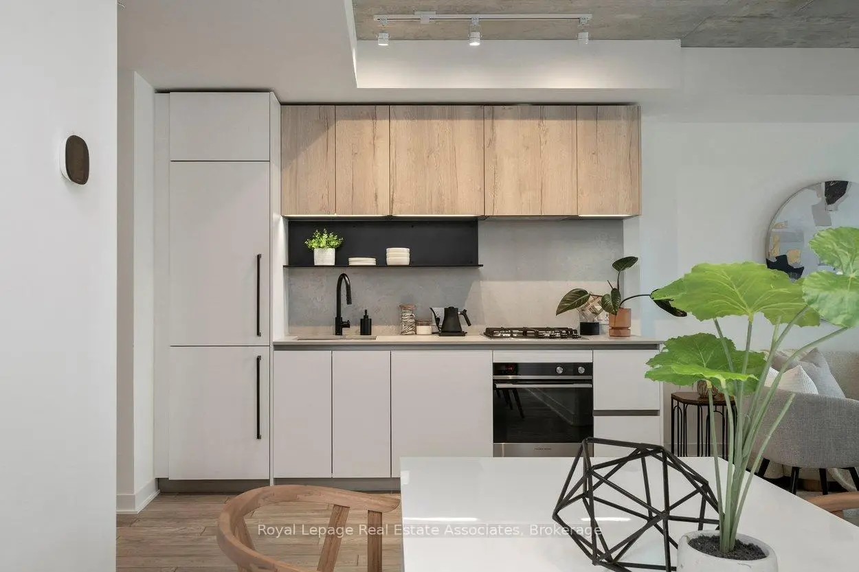 Designed to feel good the moment you walk in. Concrete accents, great light, and an effortless flow set the tone for modern west-end living done right. Clean lines, hardwood underfoot, and wall-to-wall windows create an immediate sense of openness, while exposed concrete ceilings add a cool, loft-inspired edge. The kitchen blends style and function with quartz counters, integrated appliances, a gas cooktop, modern lighting, and black hardware accents. The open living space flows to a private balcony, perfect for morning coffee or late-night chats. A tucked-away den offers flexible bonus space. The bedroom features expansive windows, custom blinds, and a wall-to-wall closet. The bathroom features a walk-in glass shower and bold black accents. Located in Junction Point, a design-forward building recognized as the BiLD 2021 Project of the Year. Maintenance fees include insurance, common area maintenance, and Rogers Xfinity Internet (1.5 Gigabit Unlimited). Steps to cafés, shops, parks, and transit, including TTC, UP Express, and GO.