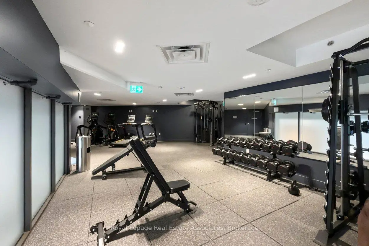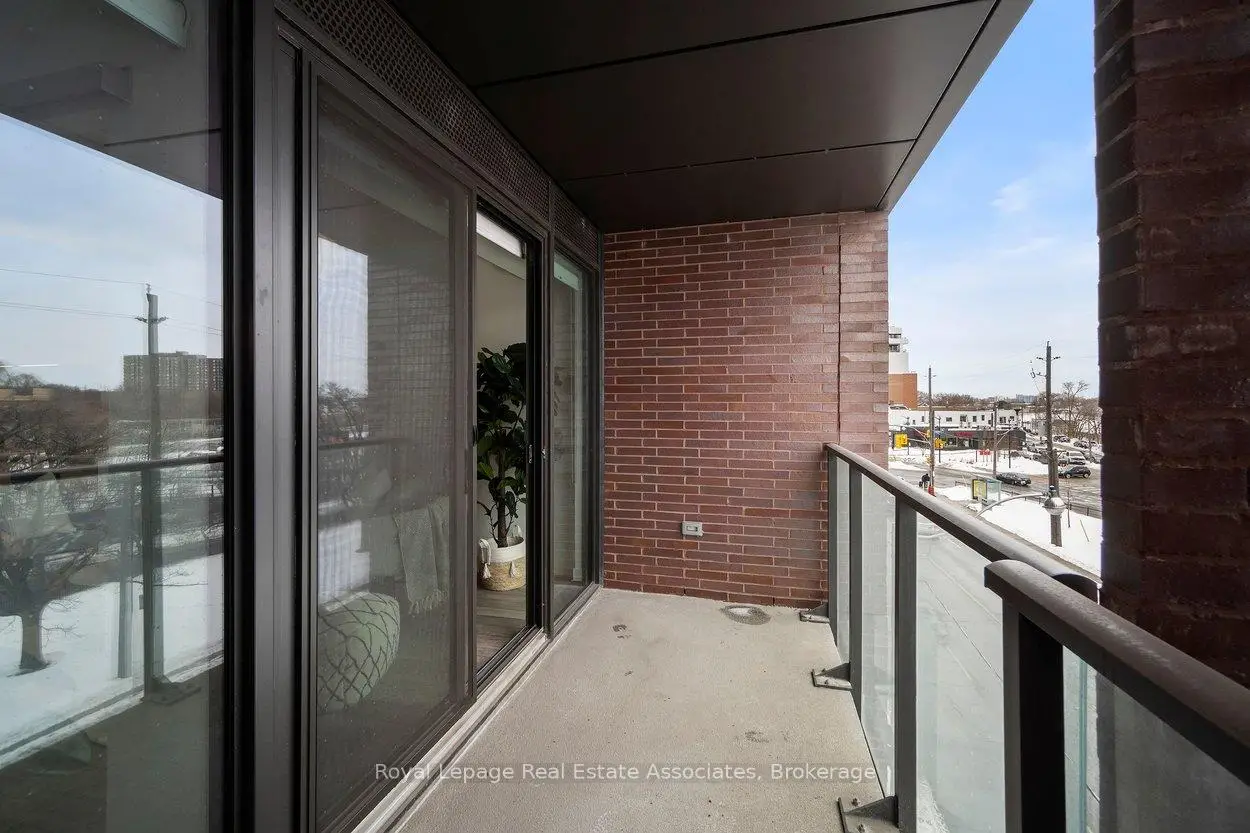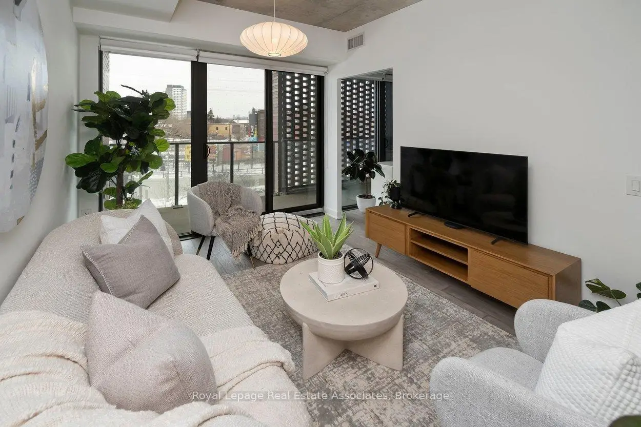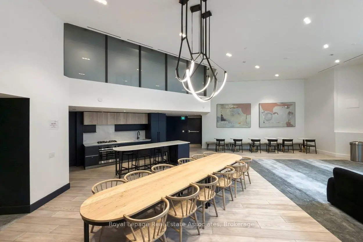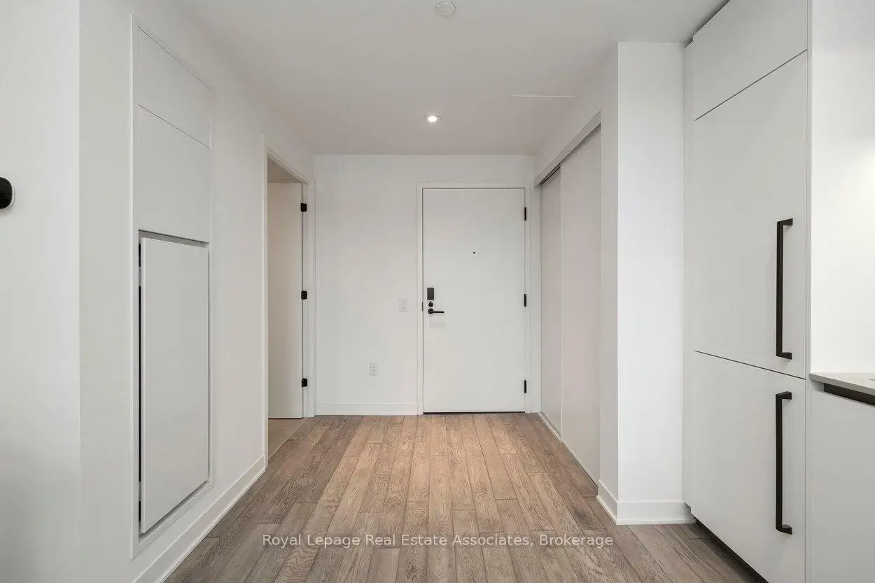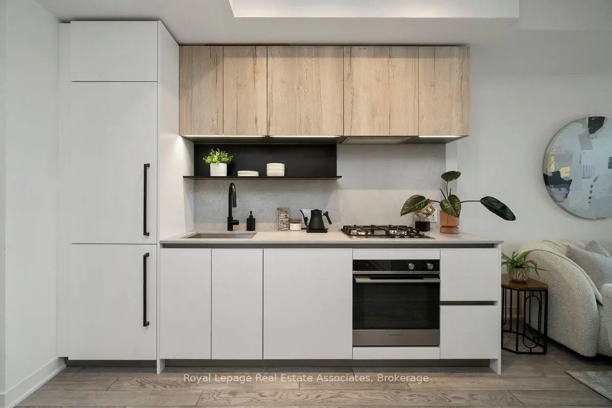 Designed to feel good the moment you walk in. Concrete accents, great light, and an effortless flow set the tone for modern west-end living done right. Clean lines, hardwood underfoot, and wall-to-wall windows create an immediate sense of openness, while exposed concrete ceilings add a cool, loft-inspired edge. The kitchen blends style and function with quartz counters, integrated appliances, a gas cooktop, modern lighting, and black hardware accents. The open living space flows to a private balcony, perfect for morning coffee or late-night chats. A tucked-away den offers flexible bonus space. The bedroom features expansive windows, custom blinds, and a wall-to-wall closet. The bathroom features a walk-in glass shower and bold black accents. Located in Junction Point, a design-forward building recognized as the BiLD 2021 Project of the Year. Maintenance fees include insurance, common area maintenance, and Rogers Xfinity Internet (1.5 Gigabit Unlimited). Steps to cafés, shops, parks, and transit, including TTC, UP Express, and GO.