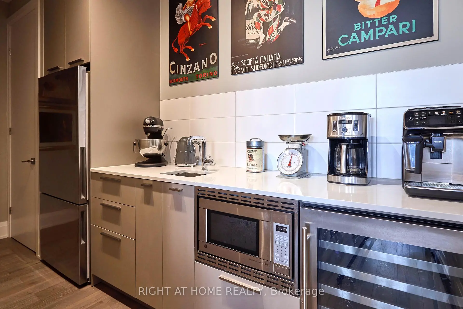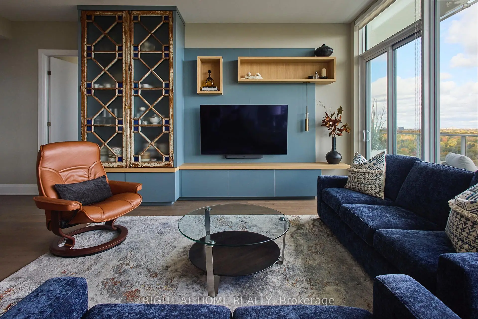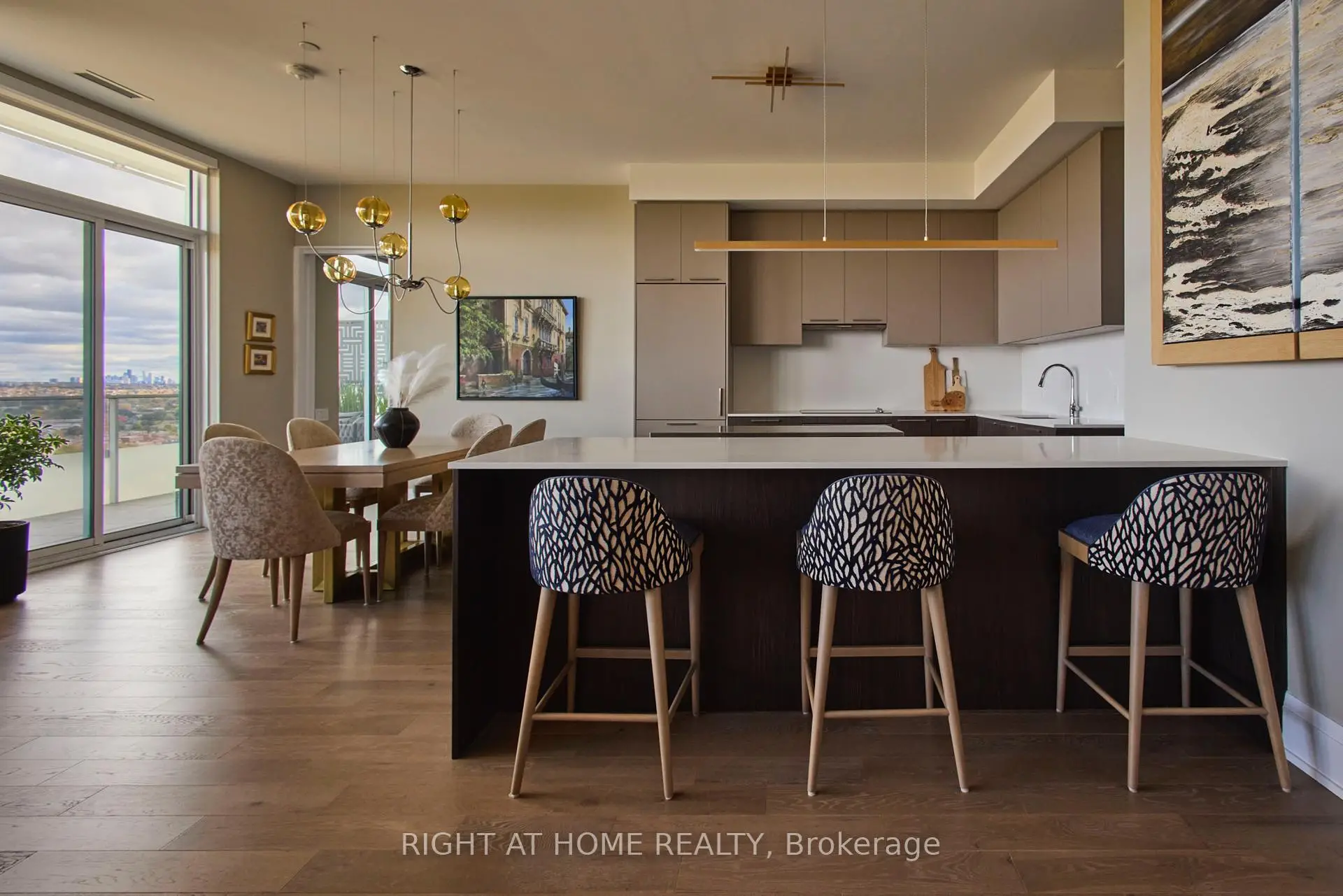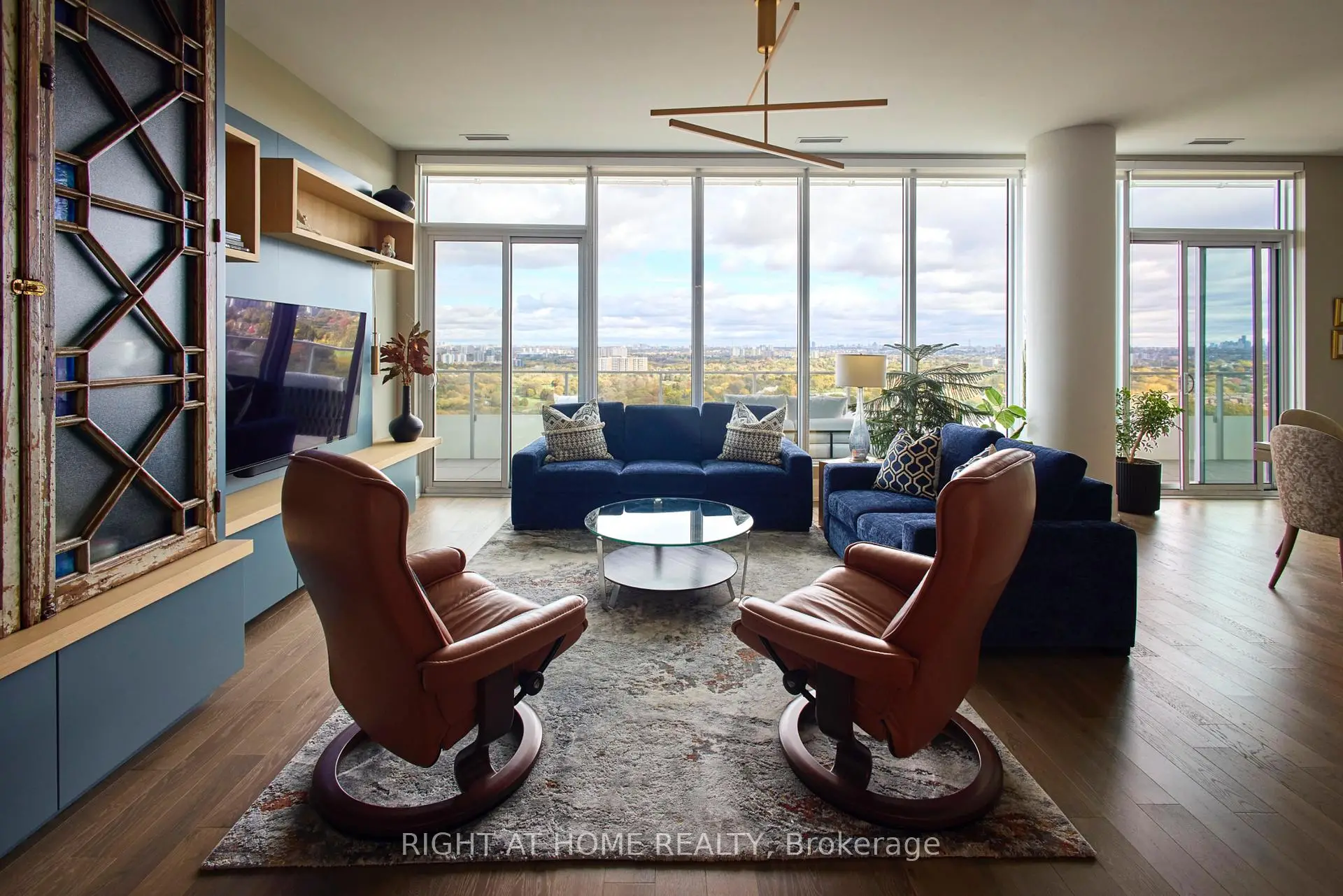An impeccably designed and completed residence offering rare scale, light, and finishes. Spanning almost 1,850 square feet with 10-foot ceilings and floor-to-ceiling windows, this fully customized suite is complemented by over 600 square feet of wraparound terrace. The exceptional split two-bedroom-plus-den layout delivers generous room proportions, abundant storage, and effortless livability throughout. The chef's kitchen offers expansive counter space with premium appliances, perfectly paired with a large walk-in pantry featuring a second refrigerator, sink, wine fridge, and remarkable storage. A wide living and dining area enjoys sweeping views and opens directly to a professionally landscaped, deep terrace-ideal for outdoor dining and lounging and complete with water bib and bbq connection. The corner primary bedroom retreat includes a luxurious walk-in closet and an elegant ensuite with dual vanities, a glass-enclosed shower, and a soaker tub positioned at the window. A full second bedroom features its own walk-in closet and ensuite bath. A guest powder room and a stylish laundry room with sink and side-by-side washer and dryer complete this truly unique home. Three parking spaces and a storage locker included.