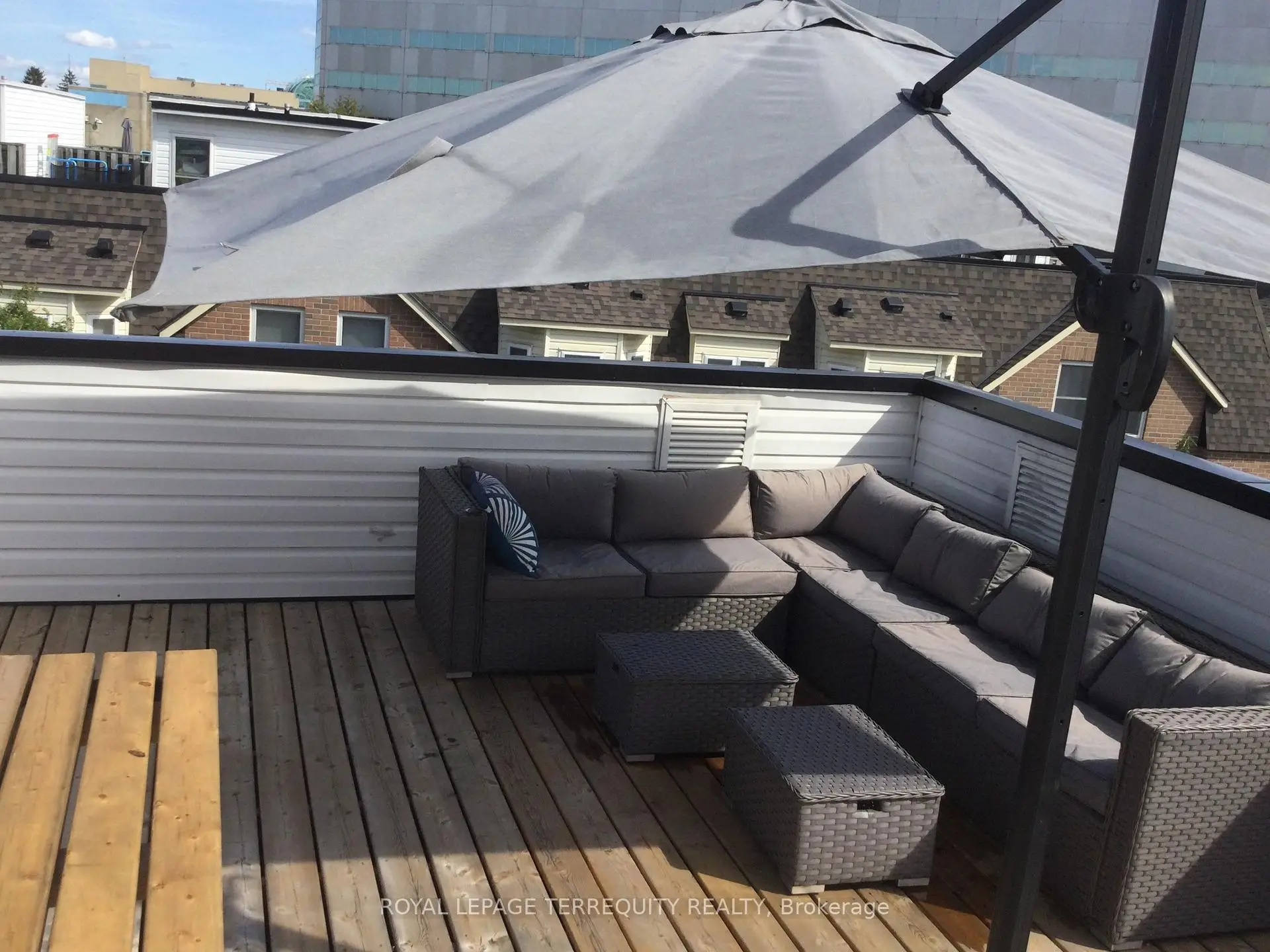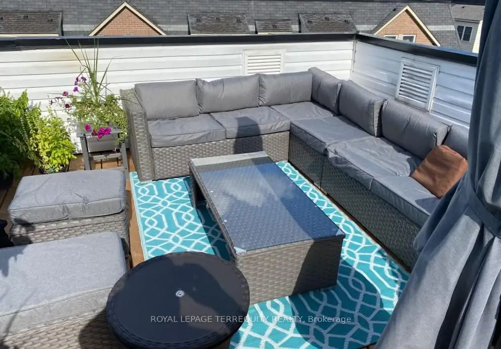 Opportunity Knocks! The 3 Bedroom 3 bathroom layout with the Rooftop Terrace has largest floor plan in the Condo Complex. It is a South-East facing corner Unit flooded with daylight. The Kitchen features a new Quartz Countertop, Stainless Steel Appliances, a 5 Burner Gas Range, a brand new Dishwasher all with the adjacent breakfast nook plus a custom storage cabinet as an extra! Bar stools in the photos are included. The Bedrooms have unique custom built closet cabinets. See for yourself!! New flooring on the second level. Roller blinds throughout the whole Unit. The Dining room beside the Livingroom has a Ceiling fan. There are 2 Owned Parking Spots which are easily accessible at the foot of the front porch. (photo is for illustration purposes-not the exact parking spots) Rooftop Terrace owned furniture is included. (photo indicates mostly the exact pieces which are to be included) The location offers wonderful transportation possibilities with the Highway and TTC Subway nearby.Great shopping is in the immediate neighbourhood along with local schools. HVAC fully serviced since Summer 2025.