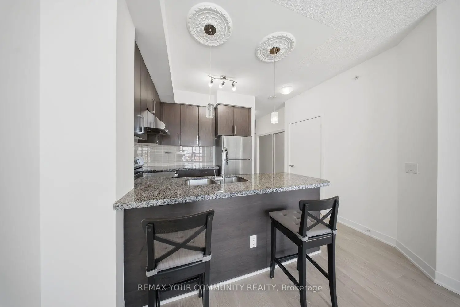 Newly Renovated & Move-In Ready. This beautifully updated 1 Bed + Den, 2 Bath suite offers approximately 700 sq. ft. of thoughtfully designed living space with modern upgrades throughout. Featuring brand-new high-quality vinyl flooring, upgraded granite countertops, freshly painted interiors, and smart touches like automatic ensuite lighting sensors, every detail has been carefully curated. Enjoy your east-facing balcony with natural morning sunlight and open city views. The functional layout is rarely offered in today's newer builds. The versatile den can easily serve as a second bedroom or private office, while the two full bathrooms provide added flexibility and long-term value. Located near Humber College, University of Guelph-Humber, Humber GO Station, and Etobicoke General Hospital, with quick access to Highways 427, 407, 409, and 401, this is a highly connected location with strong growth potential. Includes 1 parking space and 1 locker for added value. Move in, rent out, or hold long term. This is the perfect opportunity for first-time home buyers.