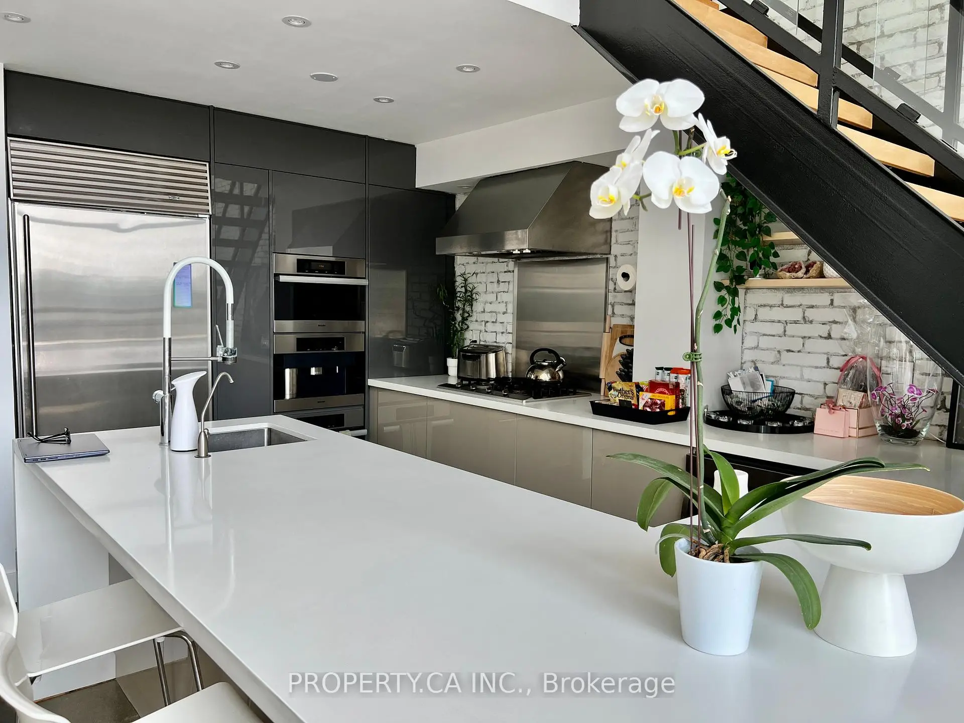 A truly one-of-a-kind Mimico hard loft, extensively renovated with over $150K in premium upgrades. Featuring polished concrete floors on the main level, hardwood flooring on the second level, and a striking metal staircase with glass railings. The designer kitchen is equipped with built-in Miele appliances, a Sub-Zero refrigerator, quartz countertops with waterfall edge, and a water filtration system. The open-concept living space impresses with soaring 17-ft ceilings, a gas fireplace, and floor-to-ceiling windows with Somfy motorized blinds. Enjoy a spa-inspired 6-piece bathroom complete with double vanity, Jacuzzi tub, Rubi 3-way shower with rainfall feature, smart fan, towel warmer, and LED mirrors. A versatile den includes a built-in closet, desk, and Murphy bed-perfect for guests or a home office. Includes 1 parking space and 1 tandem locker, both owned.