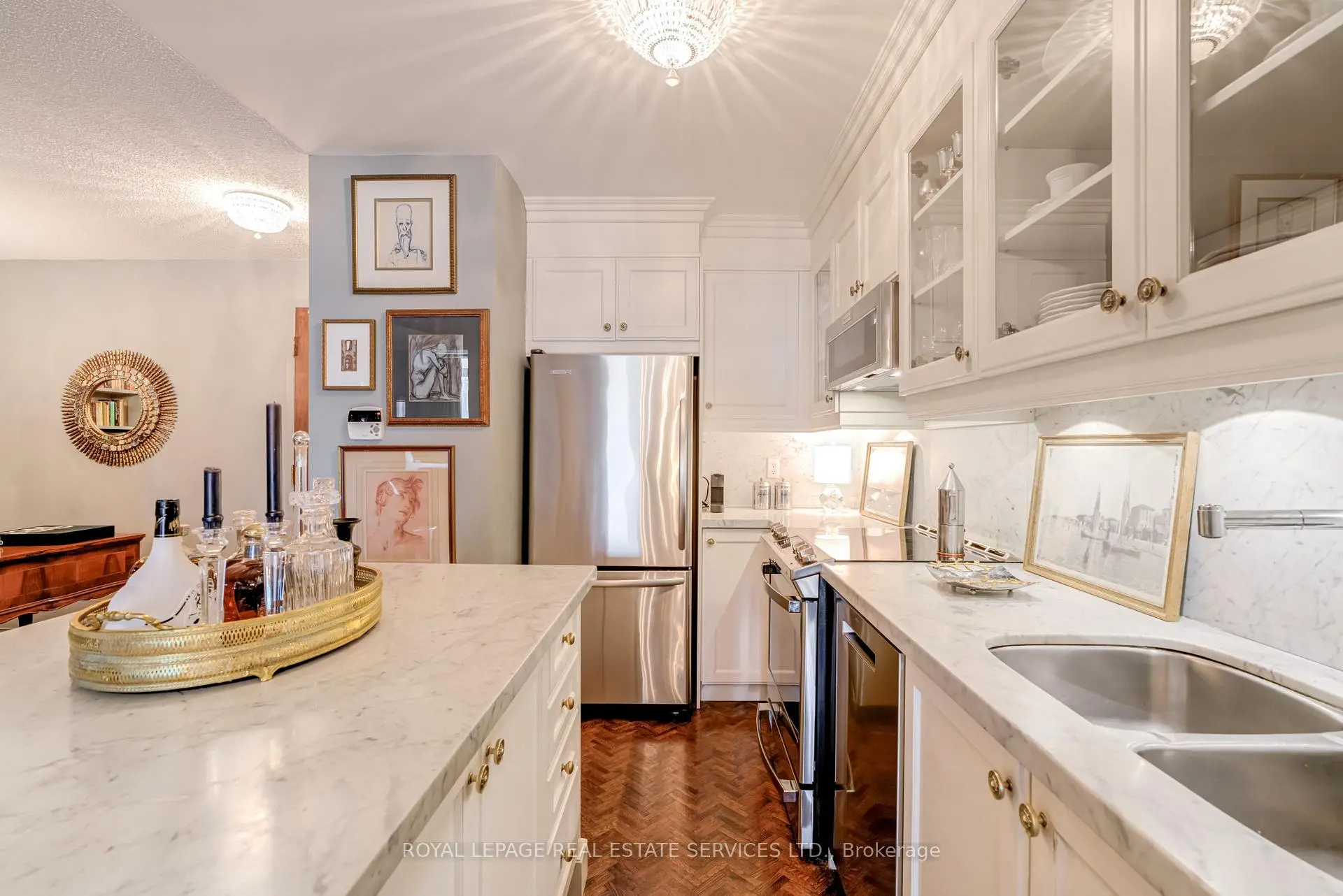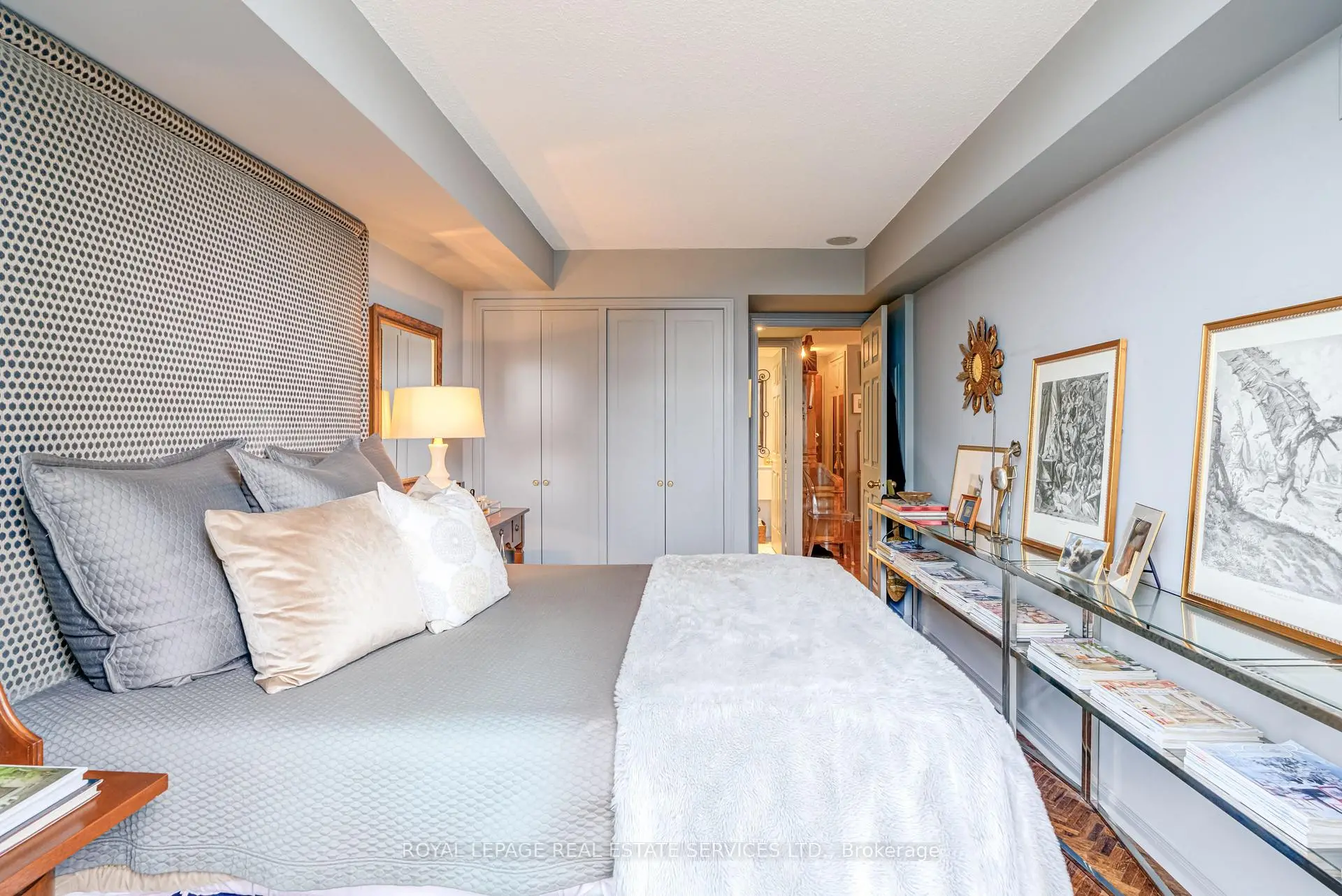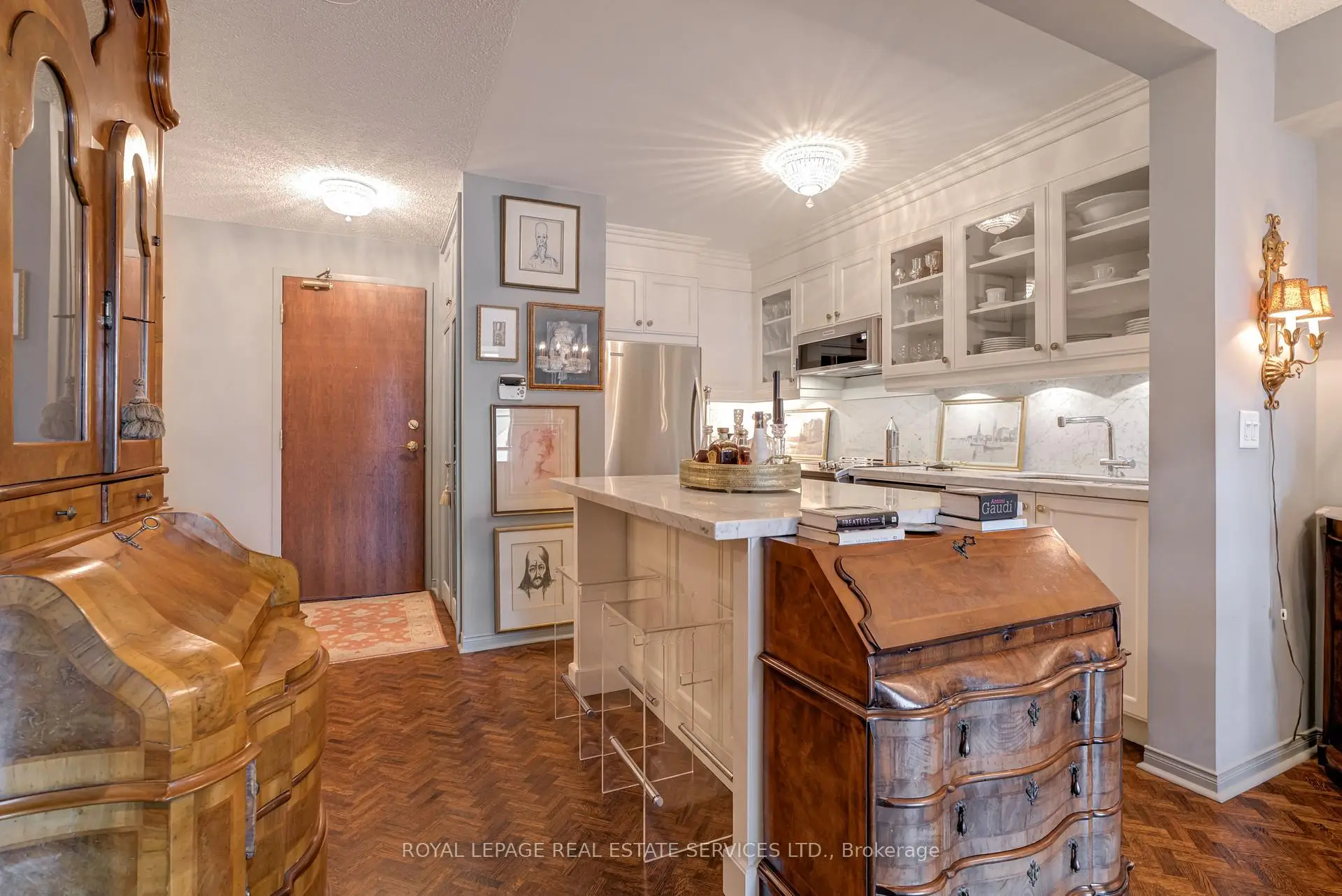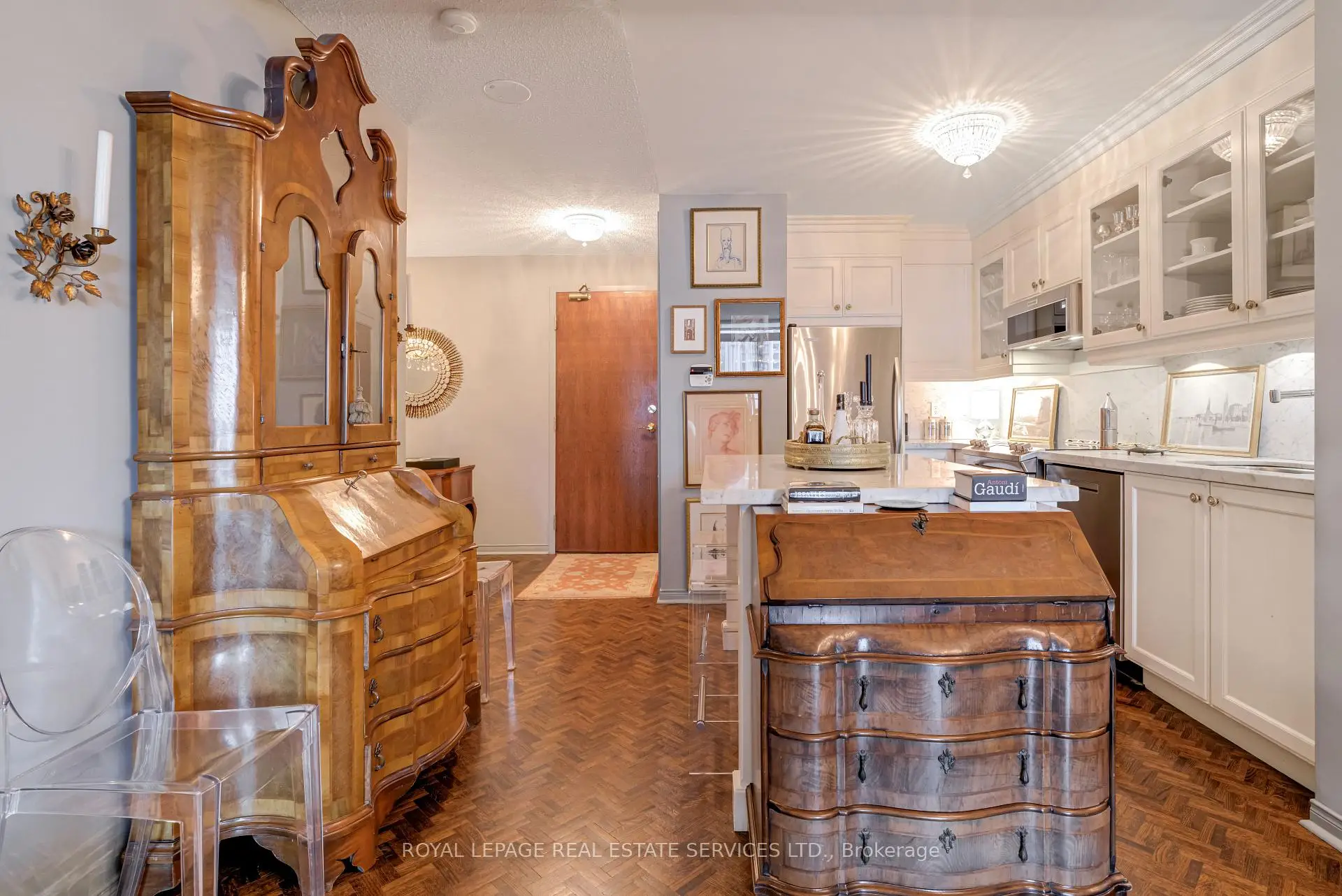 Luxury Living Beyond the Box in the Sky! Stop settling for cookie-cutter units and step into a residence that truly feels like home. This boutique-style condo has been meticulously renovated with designer finishes and an open-concept flow. The heart of the home is a chef-inspired kitchen featuring Carrera marble countertops and backsplash, a generous island with seating, and premium newer appliances. Every detail of this home has been elevated: from the warmth of herringbone wood floors throughout to custom-built library shelving in the den and custom closet doors. Retreat to a spa-like bathroom featuring tumbled marble flooring and a stylish floating vanity. Enjoy sunset cocktails or morning cappuccinos on your large private balcony with unobstructed west views over the park and neighbourhood. This wonderful condo is located in an elegant and secure building with a 24-hour security gatehouse, fully equipped modern fitness room with premium commercial cardio and strength training equipment, renovated party room, library and new secure courier/package lockers. Condo includes newly installed fan coil unit with warranty. Located just minutes to Islington subway station, lots of restaurants, shops, schools and a quick drive to HWY 427 or the Gardiner expressway. This is a rare opportunity for the discerning buyer. A true must-see. Welcome Home!