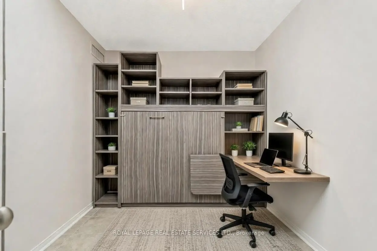 This bright and spacious 2 + 1 bedroom unit in Port Royal Place, offers 2 full bathrooms a separate dinning area and 1,005 square feet of comfortable living. The large west facing private balcony overlooks a family-friendly parkette, ideal for morning coffees and quiet evening relaxation while watching the sun set. Inside, the thoughtfully designed layout features generously sized bedrooms, a versatile den (perfect for a home office, guest room, or play area), and ample dining space that comfortably fits an 8-seat dining table. The two full bathrooms and open-concept living areas create a functional and welcoming home for everyday living and entertaining. Enjoy the rare convenience of two side-by-side parking spots located right next to the elevators, plus an oversized locker on the same parking level-perfect for bikes, strollers, and seasonal storage. The building offers 24-hour security, a party room, and a fully equipped exercise room for convenience, entertaining, and staying active. Located in one of Etobicoke's most desirable and family-oriented neighbourhoods, you're steps to Islington Subway Station, top-rated schools, grocery stores, shops, restaurants, and parks. Quick access to highways, downtown Toronto, and the airport makes this location incredibly convenient. Whether you're a young professional, growing family, or looking for low-maintenance living with room to entertain, this condo truly stands out. Photos have been virtually staged. Maintenance fees include all utilities.