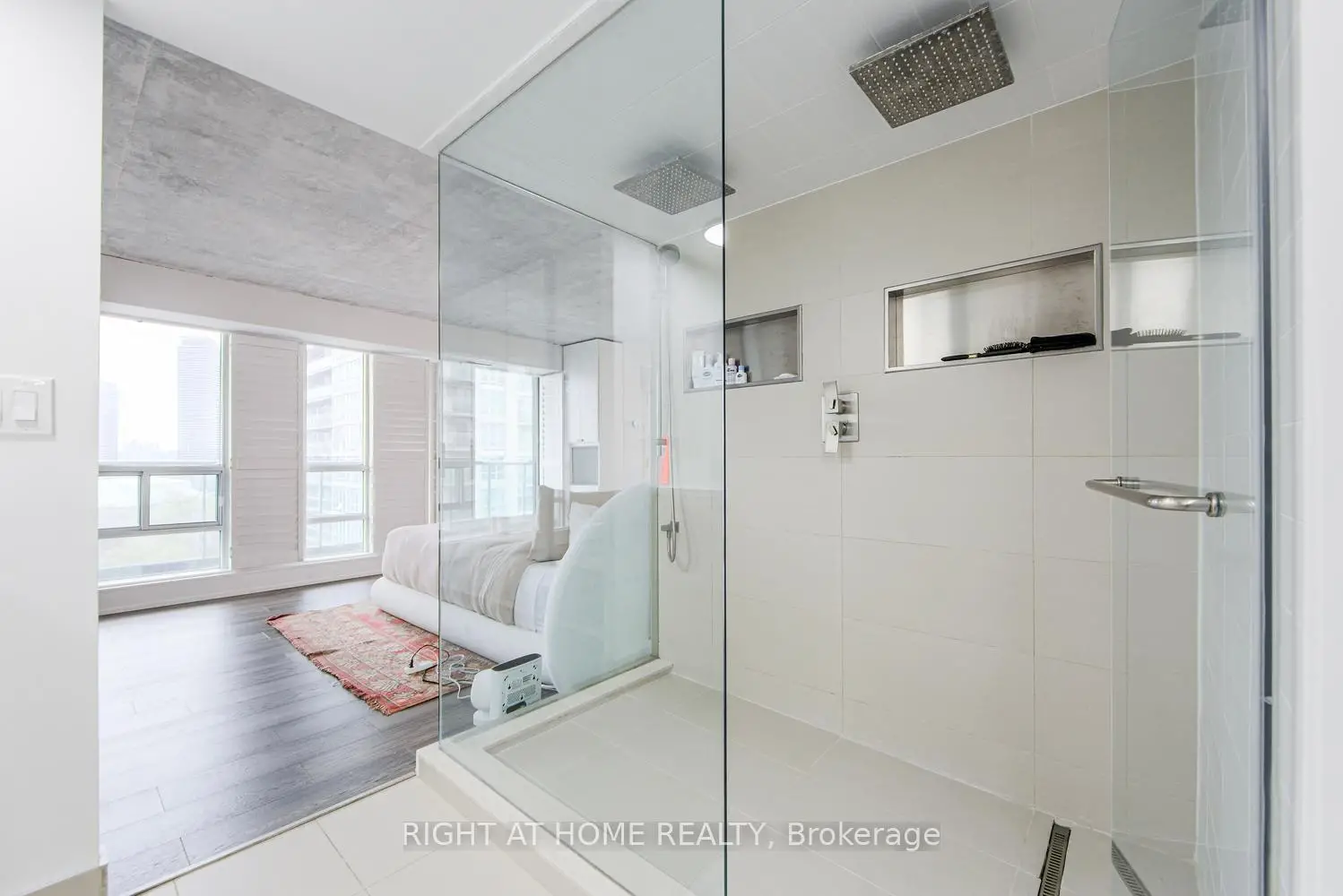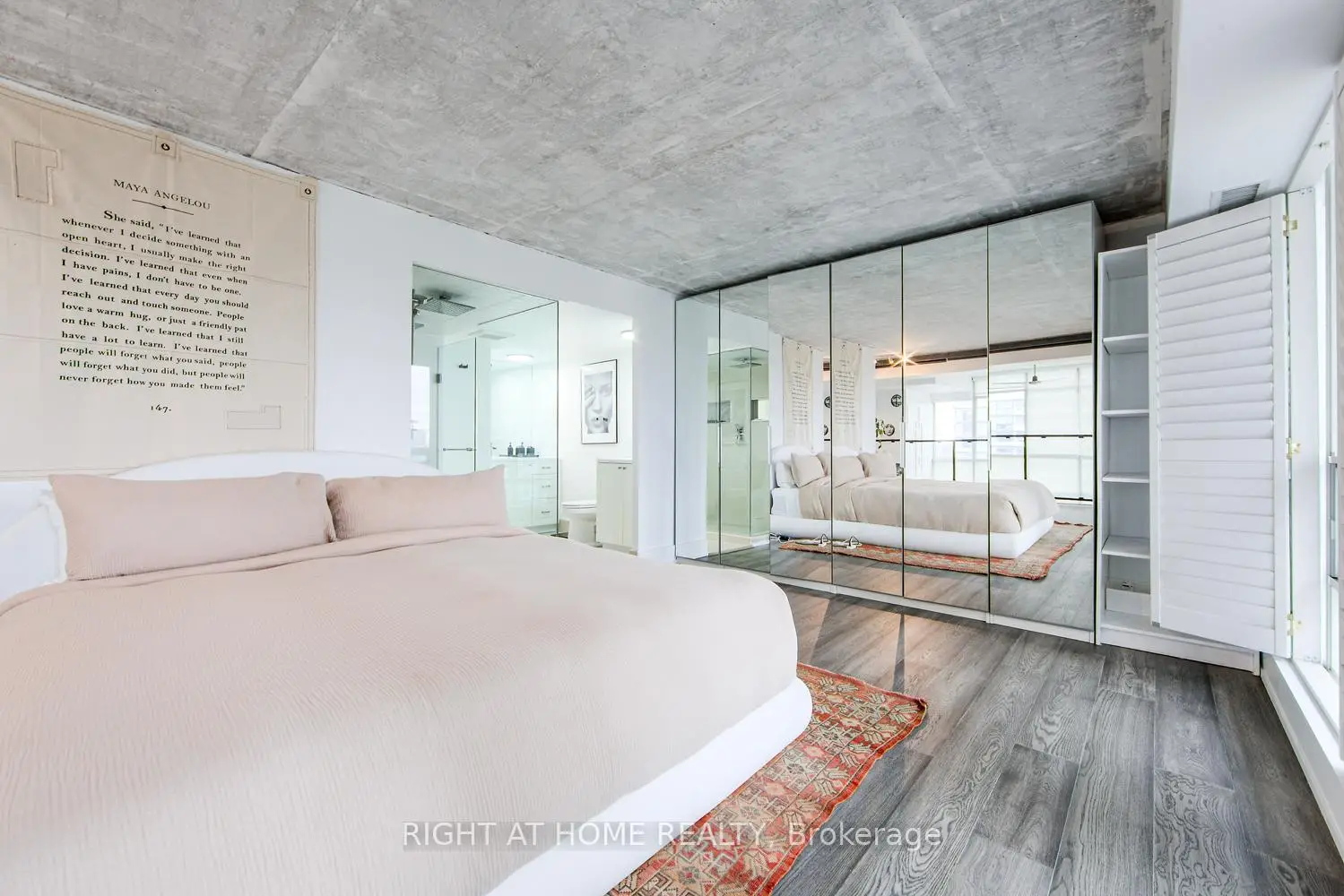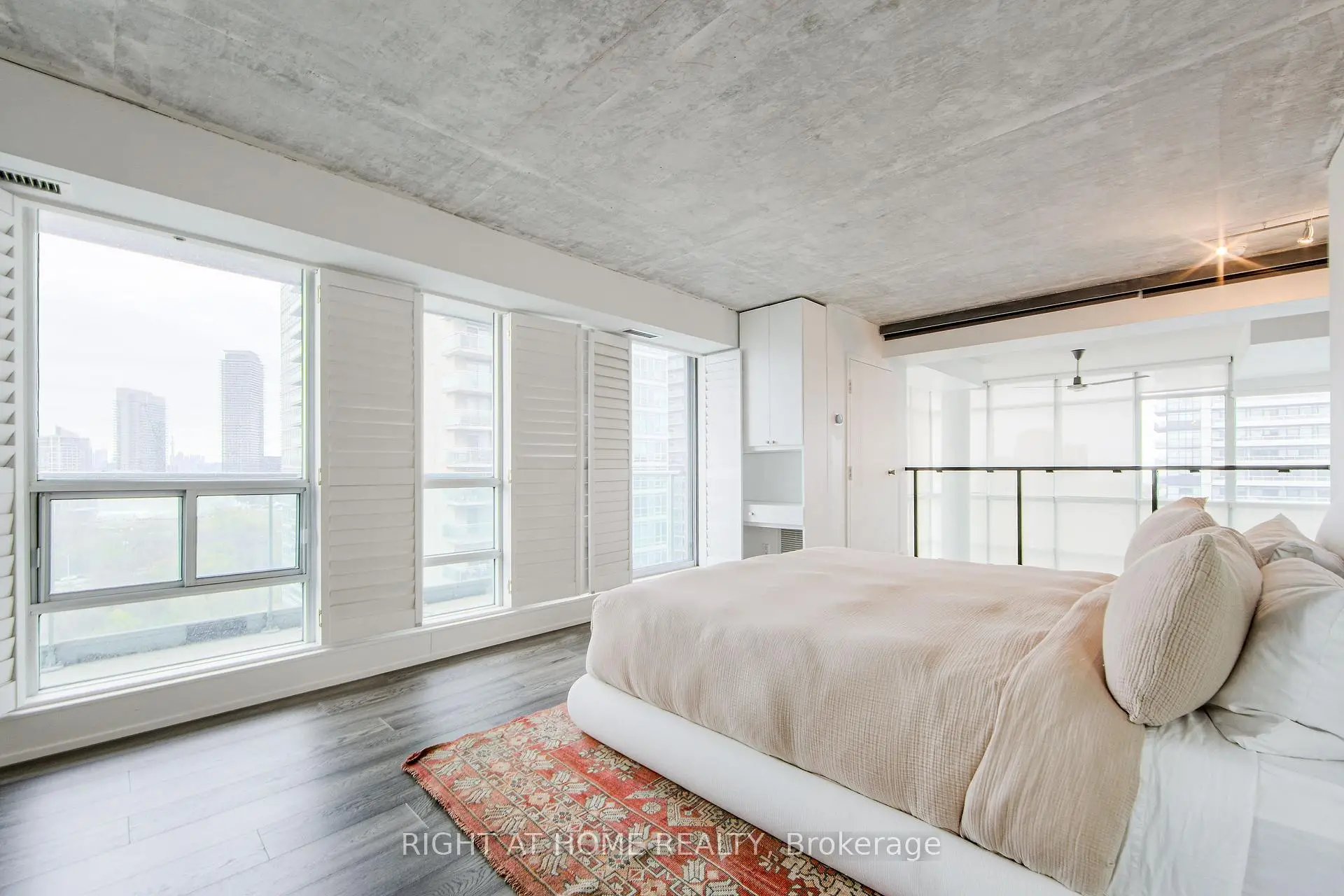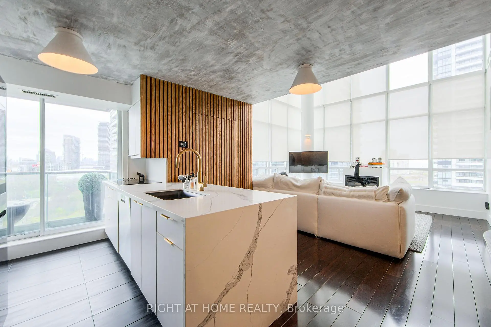 Welcome to Mystic Pointe lofts in Mimico! This converted distillery warehouse offers a sophisticated living experience. A corner unit boasting 2+1 bedrooms, 2 bathrooms, 17 ft high ceilings and 1210 sq ft of open space, this residence features unique architectural elements. The second-floor primary suite, includes a spa-inspired ensuite, open concept den, and main floor gourmet kitchen with built in smart high end appliances provide a luxurious atmosphere. With modern design touches like exposed brick, concrete, and custom finishes, this loft is a standout. Enjoy views of Lake Ontario, the CN Tower, and Downtown Toronto from every angle. Relax on one of the two balconies or host a lavish dinner party in the spacious dining room. For a truly unparalleled living experience, viewing in person is highly recommended.