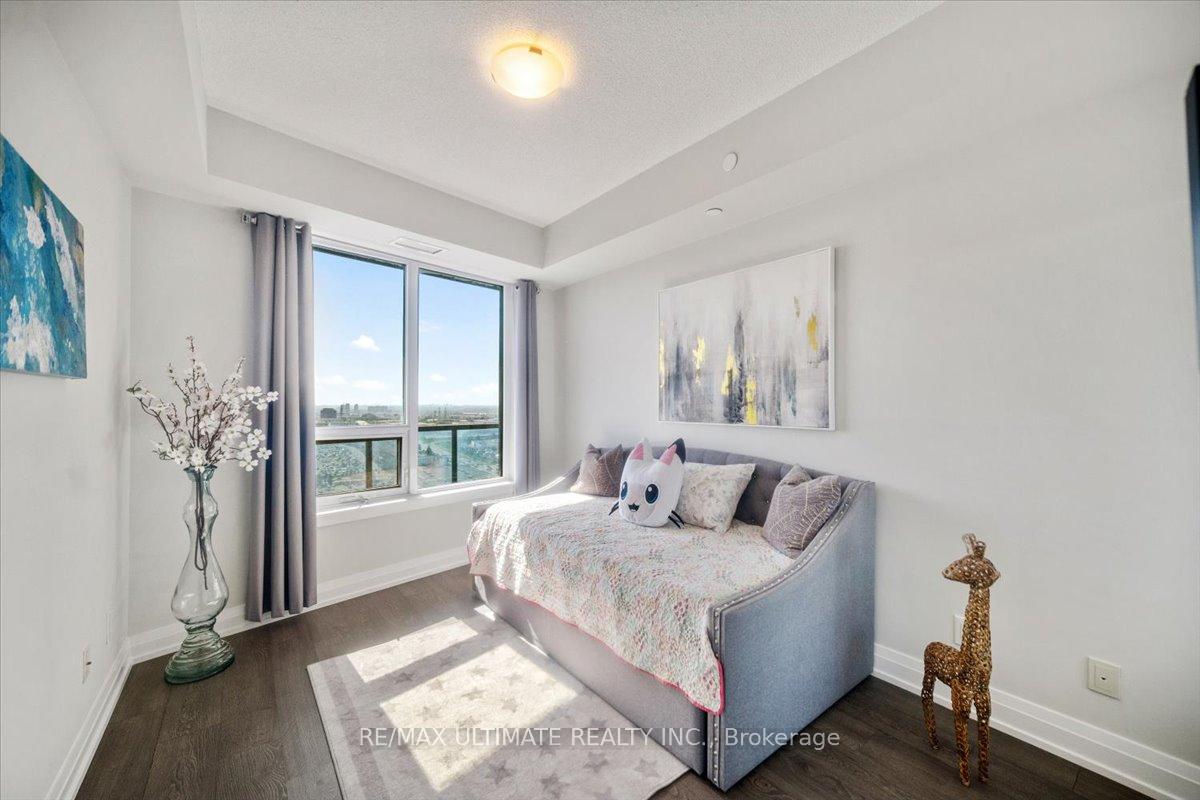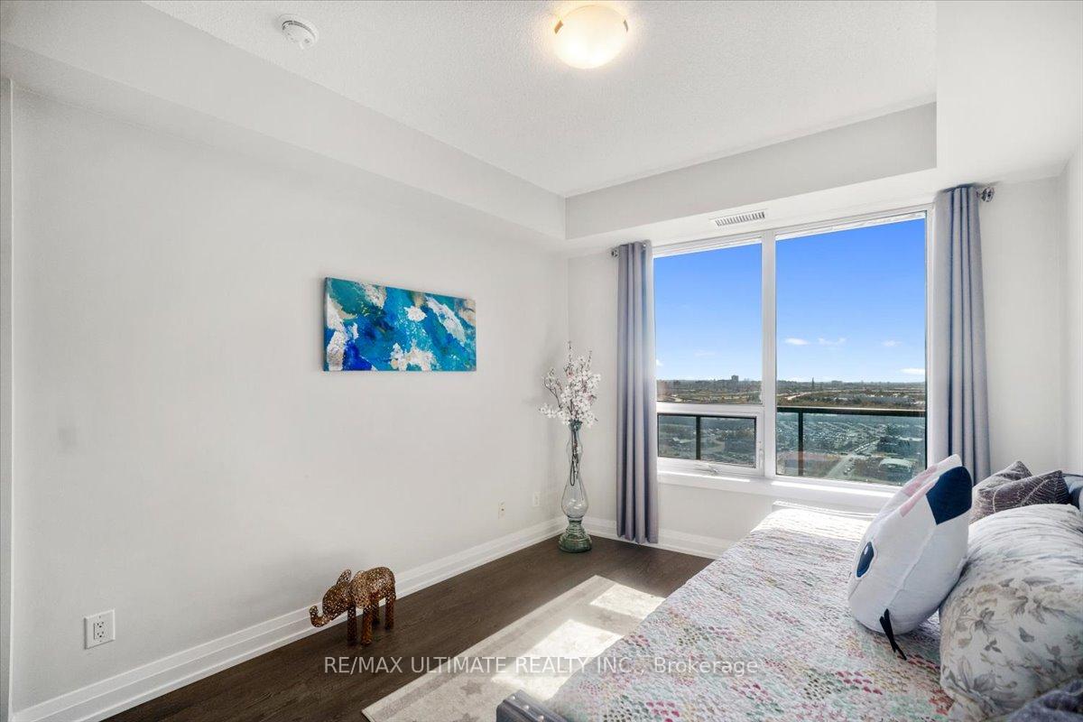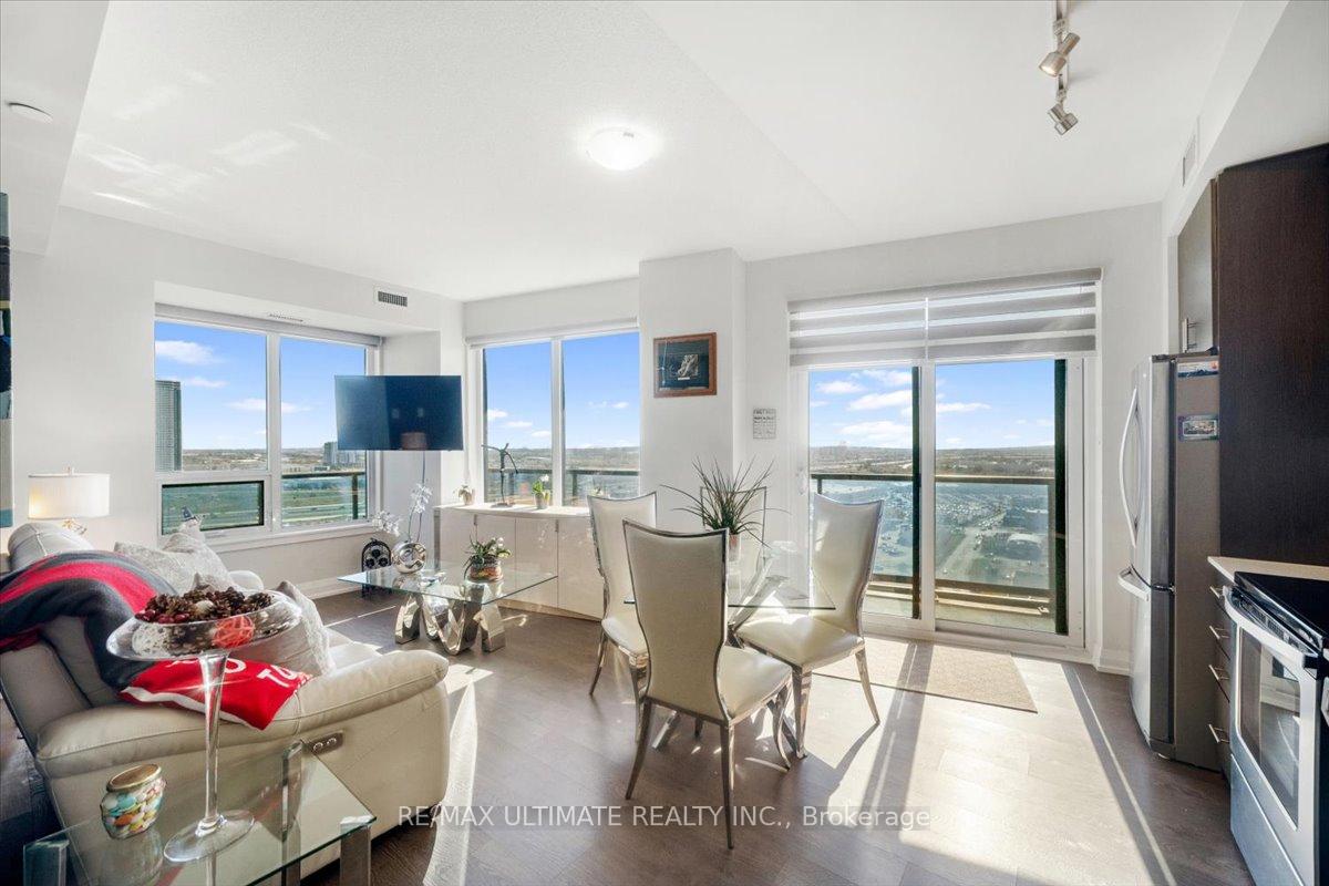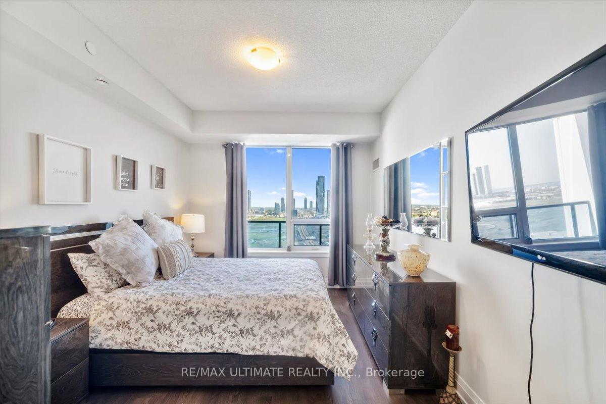Welcome to Unit 2008 at Centro Square Condominiums, where modern living meets unmatched convenience in the heart of Vaughan. This spacious 2-bedroom, 2-bathroom corner suite offers a bright layout filling the home with natural light and providing sweeping views of the city skyline over a wrap-around balcony. The kitchen is equipped with upgraded stainless steel appliances, seamlessly flowing into the combined living and dining area. Both bedrooms are generously sized, with the master featuring its own ensuite, while the second full bathroom ensures comfort for family, guests, or a work-from-home setup. Residents enjoy access to resort-style amenities including a fitness centre, indoor pool, party and meeting rooms, golf simulator, outdoor BBQ and lounge area, billiards & media rooms, guest suites, and 24-hour concierge service. Perfectly located with direct access to shopping, dining, and entertainment all across the street, major highways, and just minutes from Vaughan Metropolitan Centre subway station, this unit delivers the ideal blend of style, function, and urban lifestyle. Top of the line upgrades added include under-mount lighting, glass shower enclosure in master ensuite, stainless steel appliances, full-size washer & dryer, mirrored closet doors, kitchen cabinetry, and bath & kitchen fixtures.