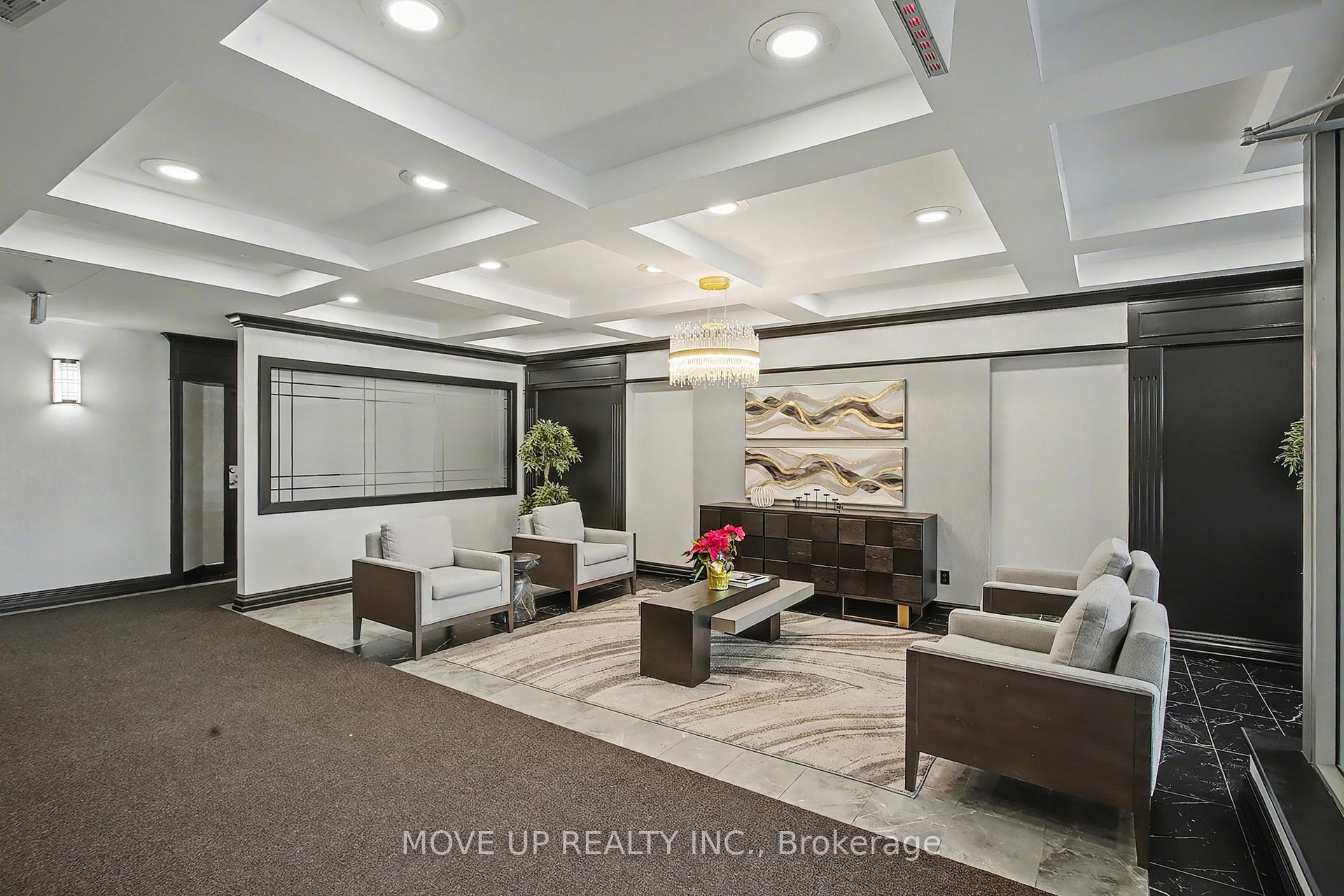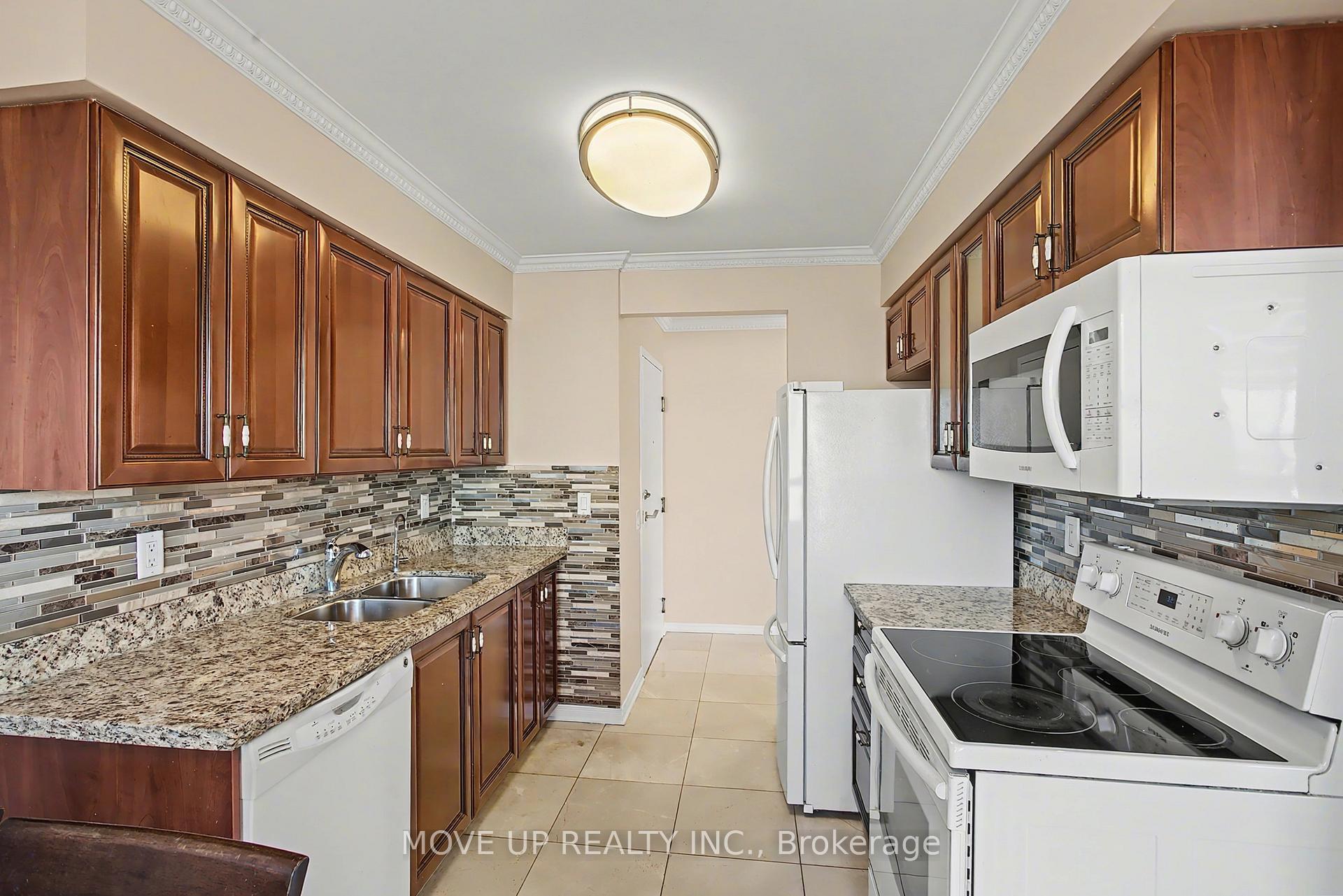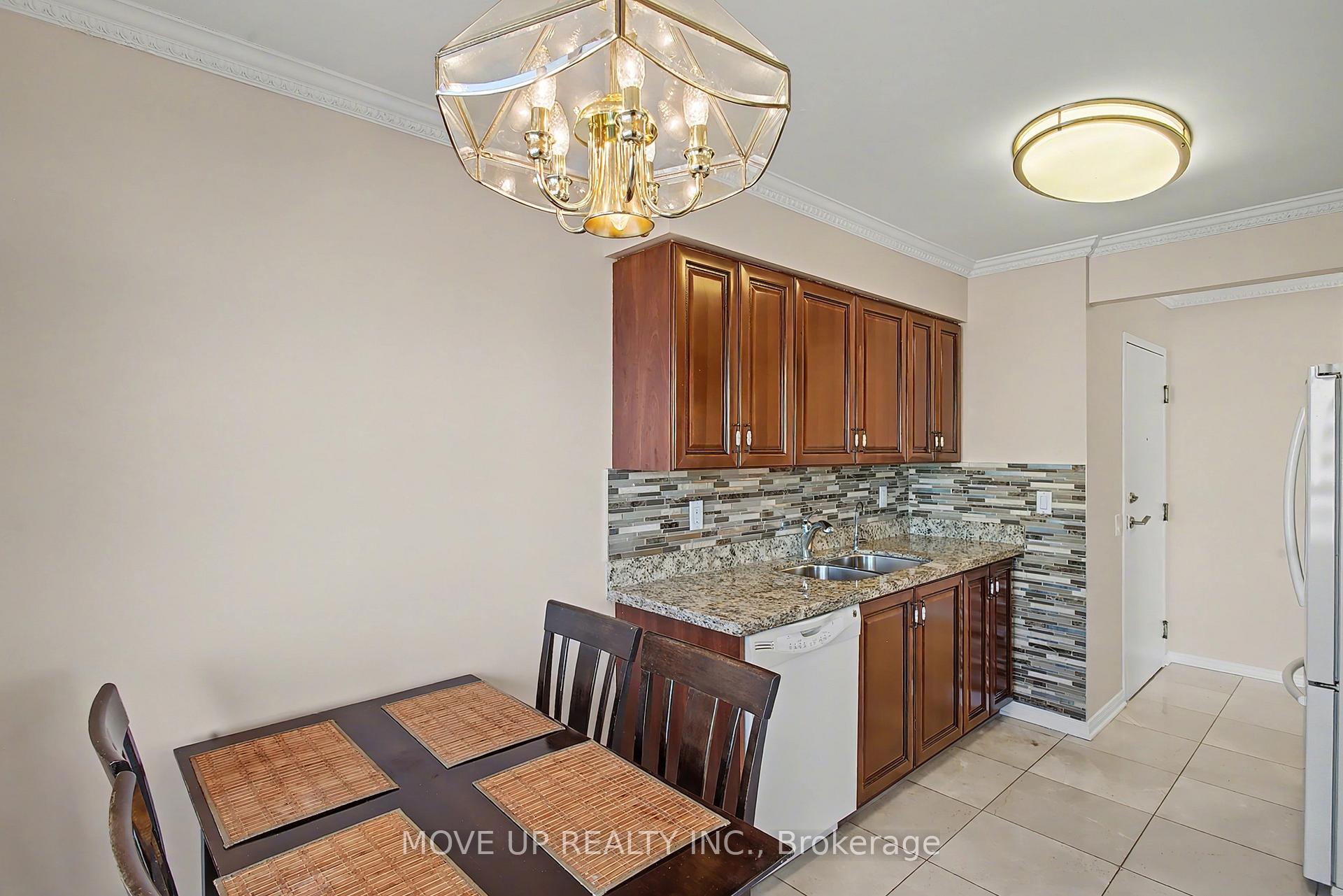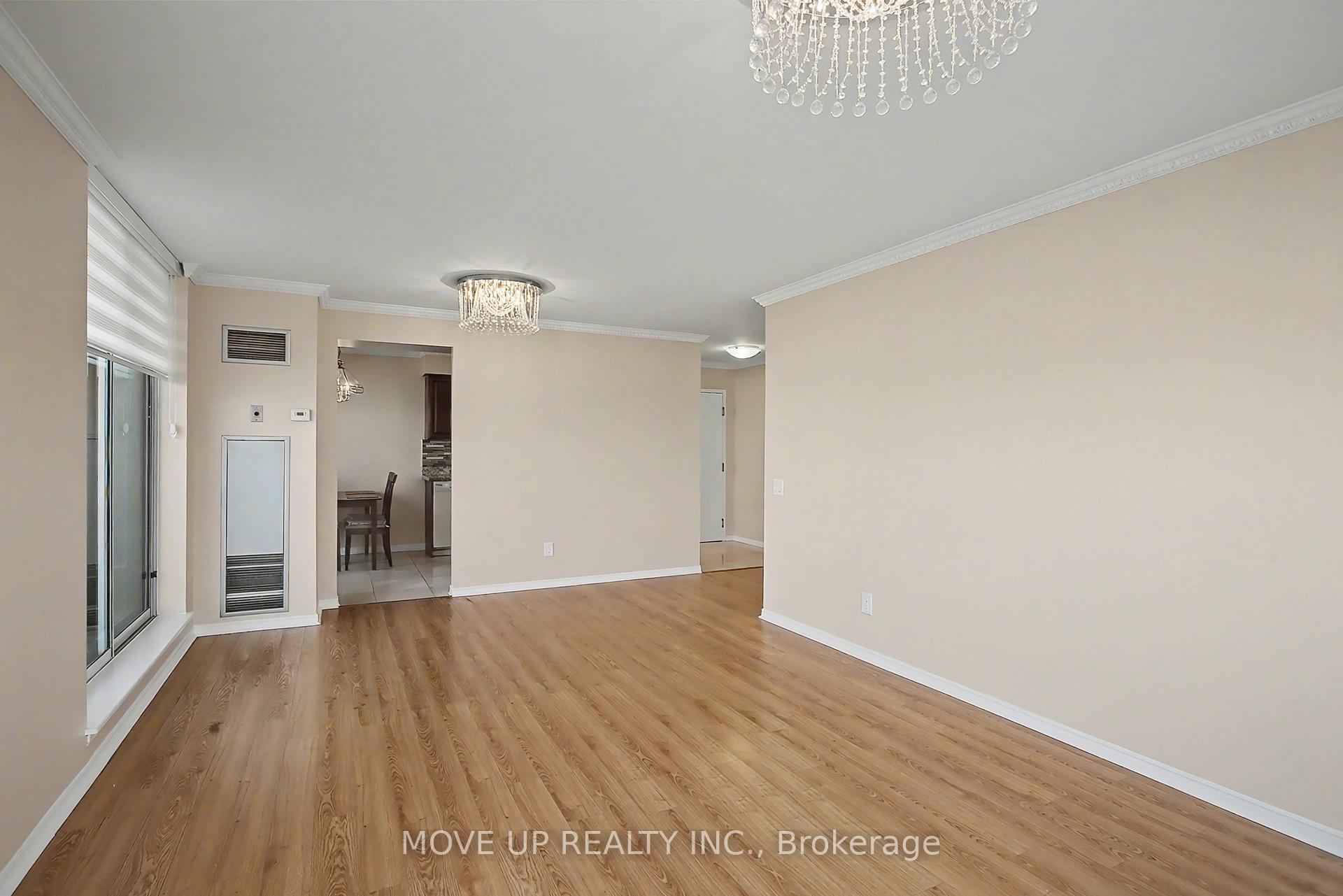Immaculate 2-Bedroom Corner Residence with Panoramic South-East Views. Welcome to this beautifully renovated corner unit offering approximately **1,142 sq. ft.** of refined living space, bathed in natural light from its coveted **south-east exposure**. Thoughtfully updated with **brand-new carpet and fresh paint throughout**, this elegant suite seamlessly blends comfort, functionality, and style. The expansive **living and dining area** features a walk-out to a **large open balcony**, perfect for enjoying serene treetop vistas, glowing morning light, and captivating **Toronto skyline views**. The **custom kitchen cabinetry** and bright **eat-in kitchen** create an inviting space for both everyday living and entertaining.The **primary bedroom retreat** boasts a **4-piece ensuite** and **his & hers closets**, while the generously sized **second bedroom** is ideal as a home office, nursery, or guest suite. Enjoy the convenience of **two full bathrooms**, **ensuite laundry**.Perfectly situated near **Steeles & Bathurst**, this home also includes **one drive-in parking space**, offering both comfort and convenience in a prime location.