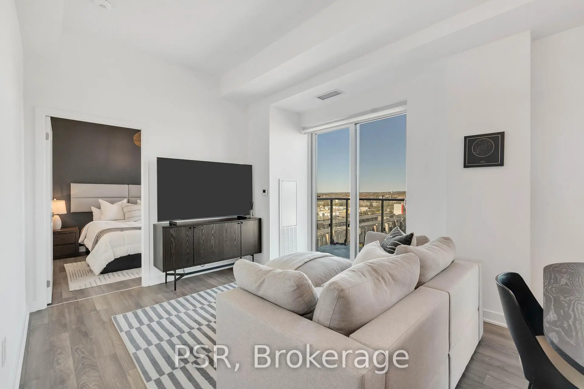 Welcome to the 10th floor of 100 Eagle Rock Way, where sleek design meets everyday comfort in one of Vaughan's most desirable addresses. This beautifully appointed condo offers soaring ceilings, rich hardwood floors, and floor-to-ceiling windows that bathe the space in natural light. The open-concept layout seamlessly connects the living, dining, and kitchen areas, perfect for hosting friends or simply unwinding in style. Step out onto your private, oversized balcony and take in panoramic views, ideal for morning coffees or evening cocktails. The modern kitchen is a chefs dream, featuring premium appliances, stylish cabinetry, and a clean, contemporary finish. The spacious primary suite includes a spa-inspired ensuite, offering a tranquil retreat after a long day. Enjoy upscale amenities including a concierge, fully equipped fitness centre, and outdoor BBQ area, all designed to elevate your lifestyle. Underground parking is also included for your convenience. Ideally situated just moments from shops, restaurants, transit, and major highways, this is urban living at its finest.