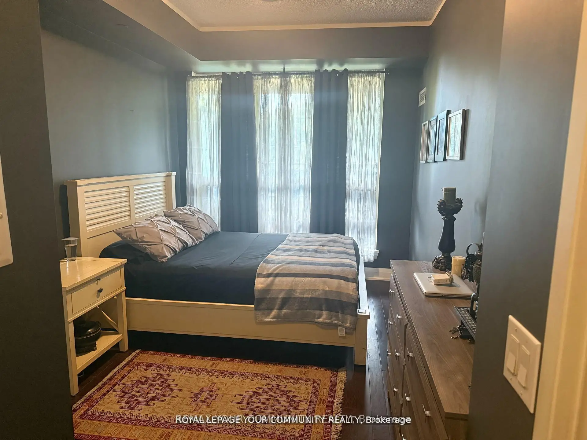 Stylish 1 + den (Den is big enough to be used as 2nd bedroom) condo with 2 full baths, thoughtfully designed open concept,9' ceiling, south facing with natural light and walk-out to large "108 Sq Ft Terrace with a drain" to enjoy when the weather allows. "Upgraded engineered hardwood floor throughout" by the builder. Located steps from TTC, top-rated schools, Promenade Mall, Center Point Mall & other amenities. This home offers comfort with exceptional convenience, maintenance fee includes water, heat. Includes premium amenities such as fully equipped gym, party rm, 24hr security on the weekends, billiard rm, TV room, library & guest room. Unit is tastefully painted (modern) with modern light fixtures. Extra large, private locker & very convenient parking spot in P1, close to the elevator. The unit offers style, comfort & convenience.