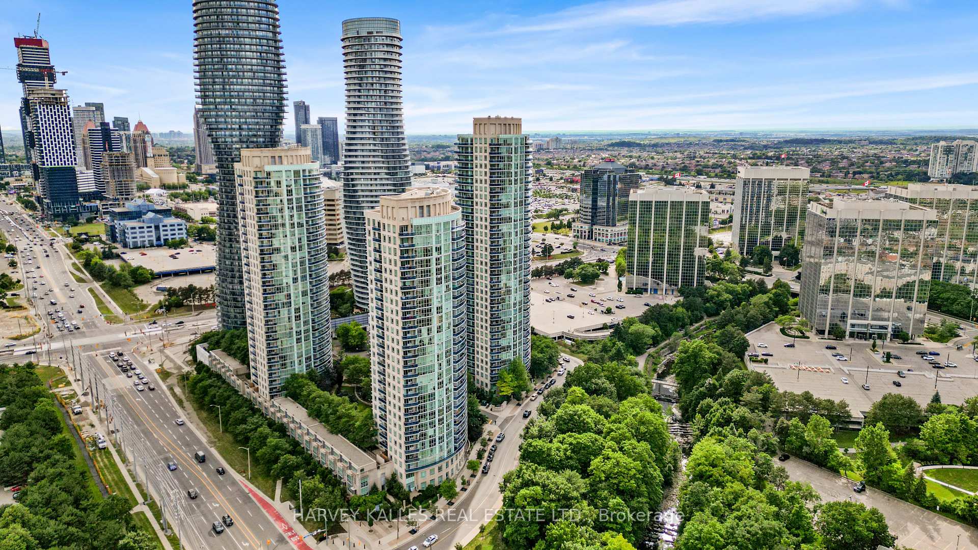 Welcome to this bright and spacious corner unit 2-bedroom, 2-full bathroom condo at the iconic 80 Absolute Ave, offering a rare and highly sought-after 2-car tandem parking plus a private locker and open balcony. Water and Heat Included in Maintenance. This well-designed split-bedroom layout provides excellent flow and privacy, ideal for professionals, couples, or small families. Floor-to-ceiling windows invite natural light and offer tranquil views of the lush green canopy, creating a serene backdrop year-round. This unit has been recently renovated with new flooring, fresh paint and updates made to the bathrooms and new appliances (dishwasher and stove). Located in the heart of downtown Mississauga, you're just minutes from Square One Shopping Centre, fine dining, entertainment, and the future LRT line, with easy access to HWY 403, 401, and QEW perfect for commuters. Residents of this award-winning building enjoy unparalleled amenities, including indoor and outdoor pools, a full fitness centre, squash and basketball courts, theatre room, running track, guest suites, party rooms, 24-hour concierge, and more. Only a handful of units in this building offer a 2-car tandem parking space plus your own private locker directly behind your parking spaces. This unit faces Absolute Ave and does not face the busy street, offering quiet and relaxing views from your private balcony. Don't miss your chance to live in one of Mississauga's most prestigious and amenity-rich communities!