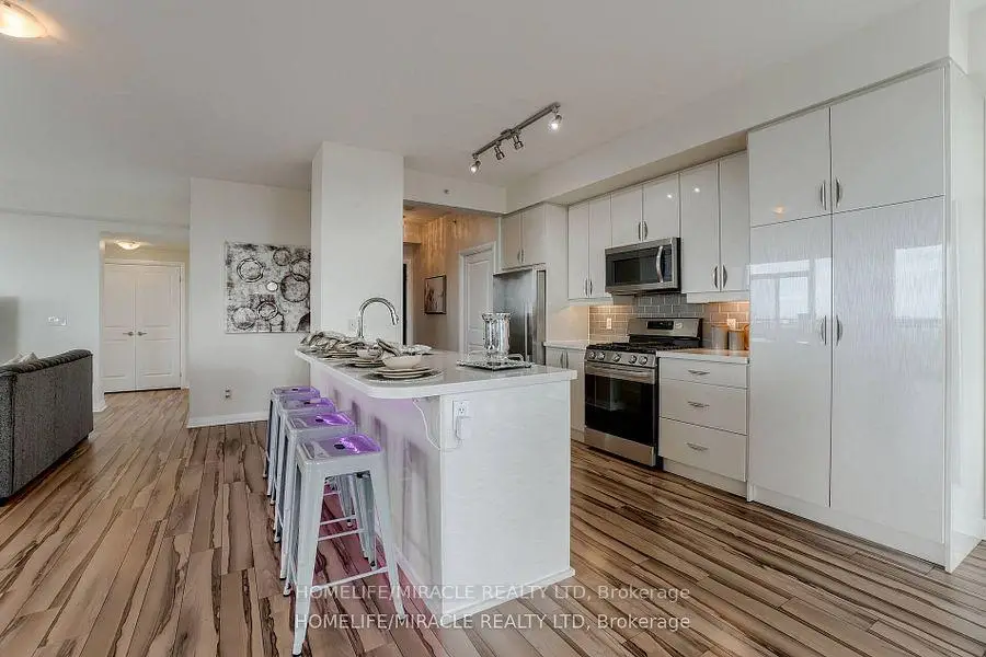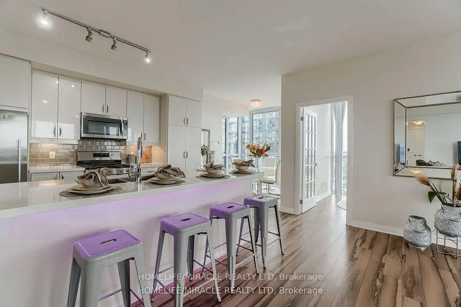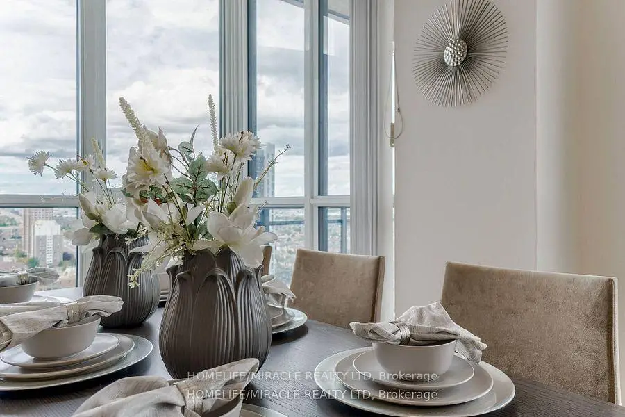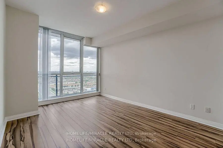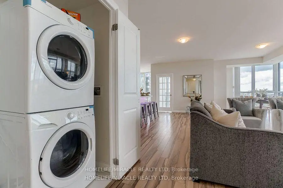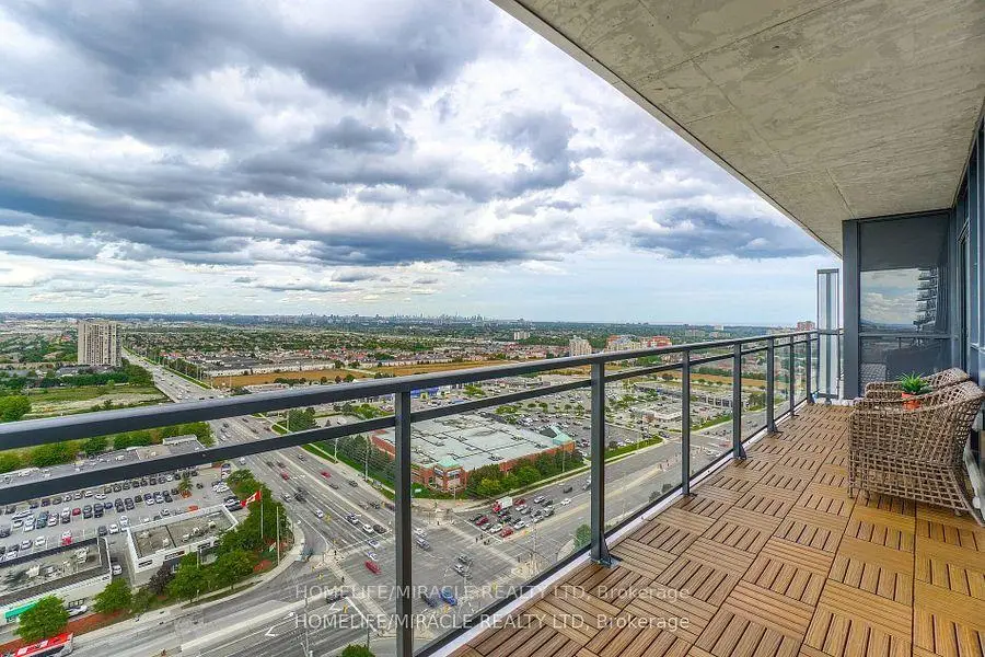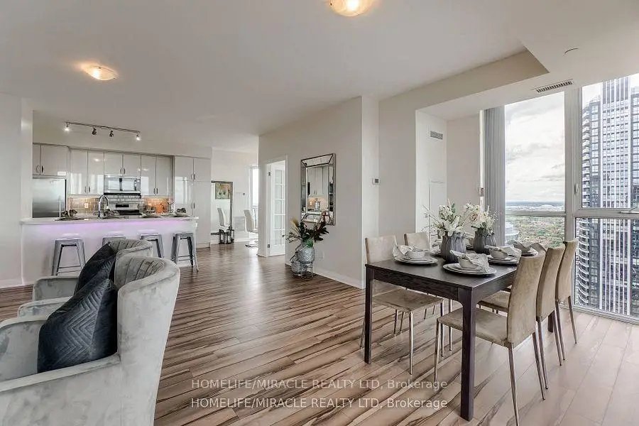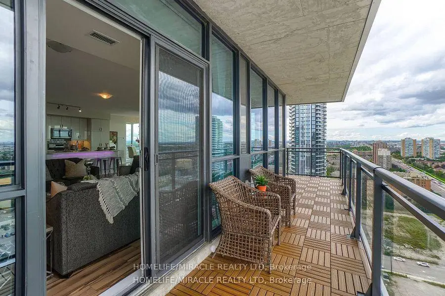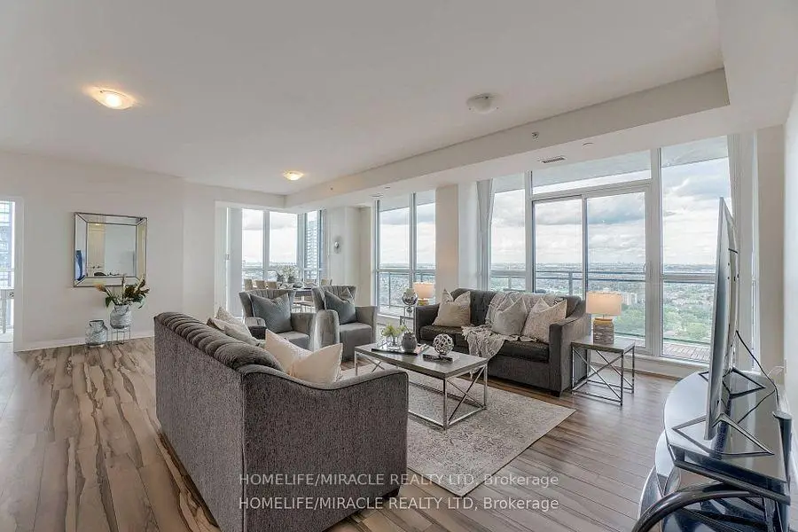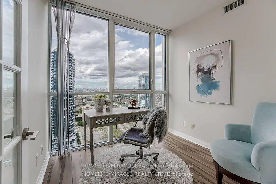 Welcome to this stunning 2,100 sq. ft. luxury corner penthouse, offering premium finishes and floor-to-ceiling windows that flood the space with natural light. With only four units on the floor, enjoy enhanced privacy and exclusivity. This spacious layout features 3 bedrooms plus a den and two full bathrooms. The open-concept living and dining area is surrounded by floor-to-ceiling windows, creating a bright and airy atmosphere. The generous primary bedroom includes a large walk-in closet, a 5-piece ensuite, and direct access to a private balcony. Enjoy top-tier building amenities including 24-hour security, a fully equipped gym, yoga studio, sauna, indoor swimming pool, and party room. Additional highlights include two large balconies, two parking spaces, and a spacious locker. Located in a prime area directly across from the new Hurontario LRT, this property offers excellent convenience and connectivity. The unit is currently leased for $5,000 per month, with a tenant willing to renew.