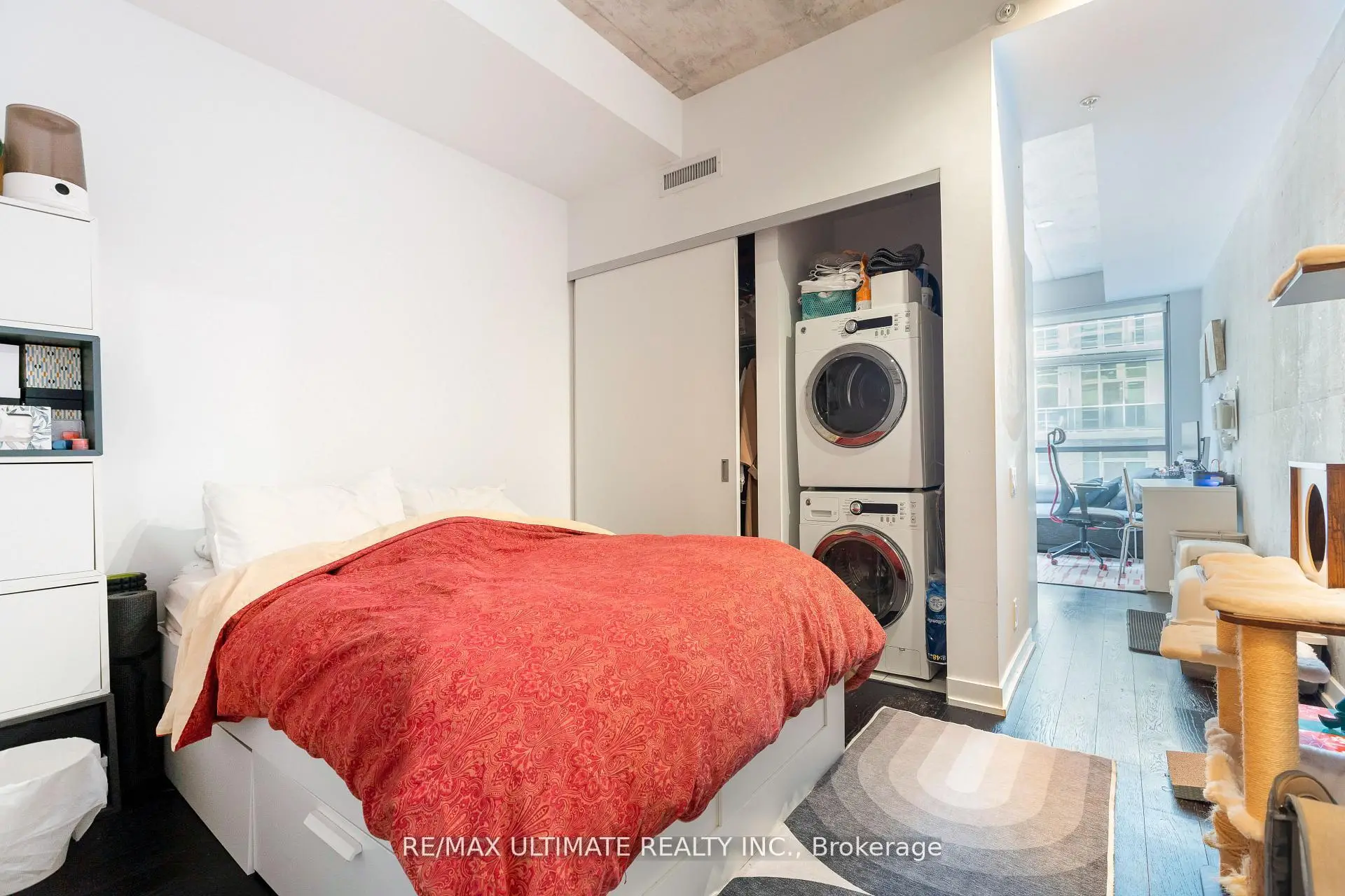 Fabulous "Home" on the "The Brant Park Lofts" in the heart of Vibrant King West Village-King West Neighborhood. This one-bedroom, with its modern design, makes it the perfect urban sanctuary. Bright, south-facing, open concept design with exposed concrete ceiling And Walls. Features 9 ft ceilings and large floor-to-ceiling windows. The kitchen boasts quartz countertops and a ceramic backsplash. Includes one locker. The boutique building offers 5-star amenities and enhanced security features, providing peace of mind for residents. Steps to all restaurants, cafes, fitness studios, nightlife, and close to the Financial District; directly across from Waterworks Food Hall & St. Andrews Park, with an off-leash dog area.