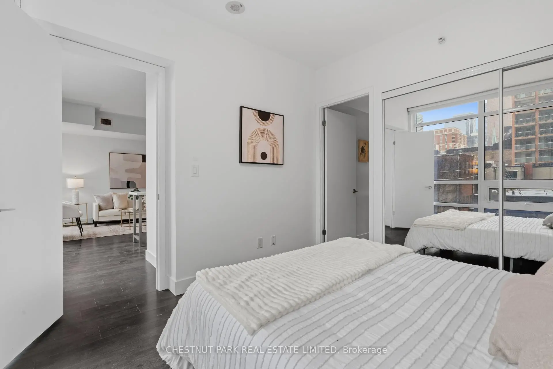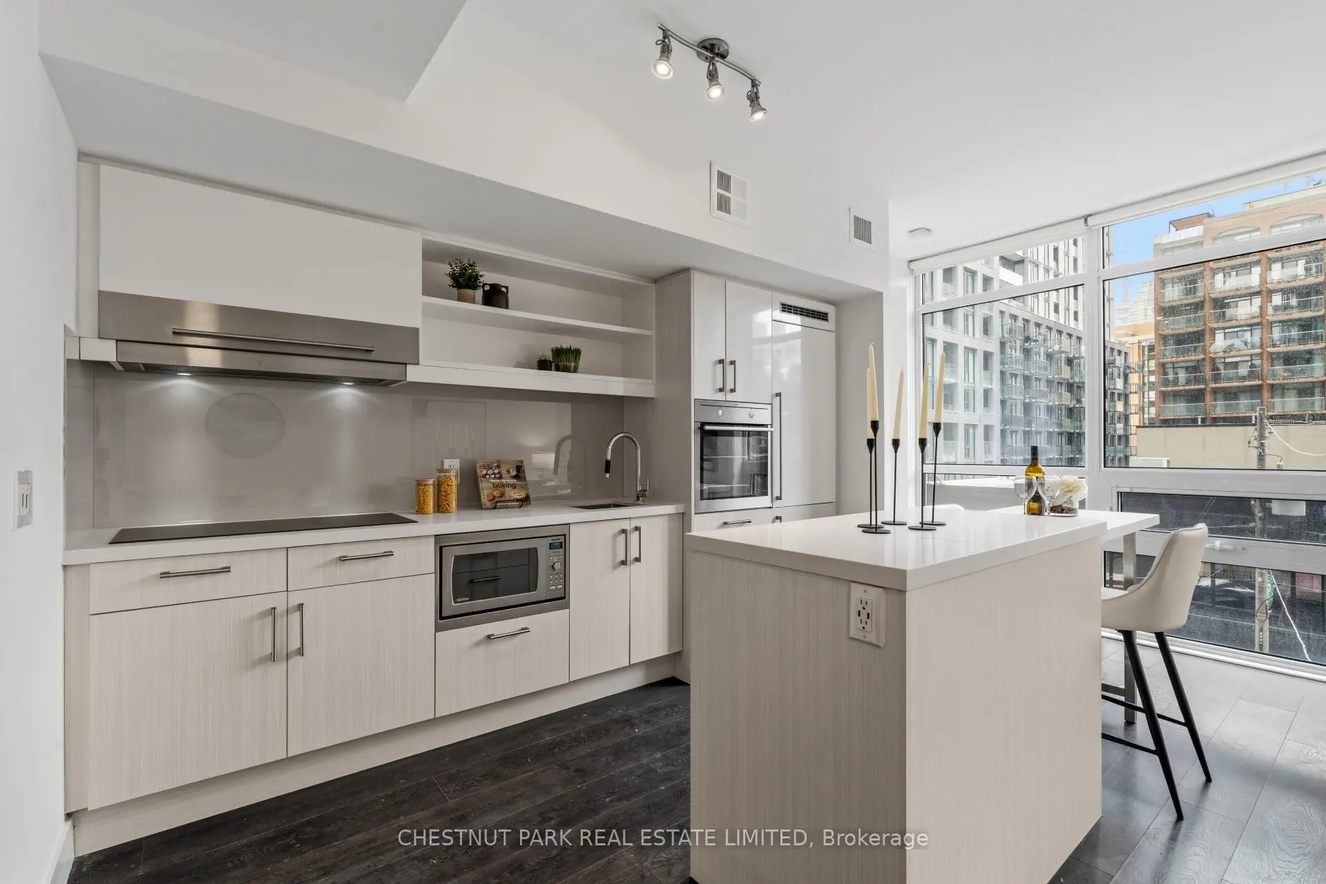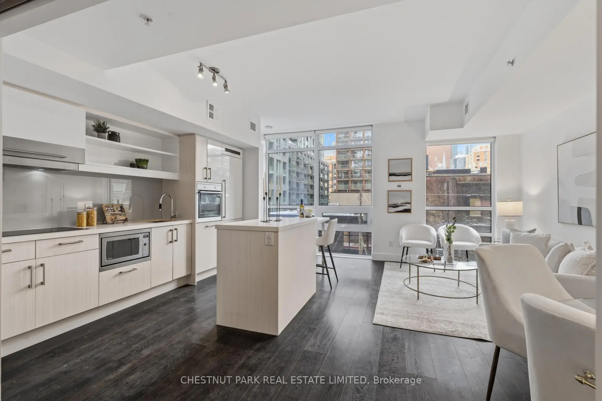 Welcome to this spacious and intelligently designed two-bedroom plus den suite in the heart of King East-Toronto's renowned furniture and design district. Offering approximately 950 sq. ft. of interior living space, this residence blends modern finishes with a highly functional layout, ideal for end-users and investors alike. Smart, Functional Layout The well-appointed floor plan features a bright open-concept living and dining area, perfect for entertaining or relaxing. The contemporary kitchen flows seamlessly into the main living space and is anchored by a functional island-ideal for casual dining and everyday use. Two generously sized bedrooms are thoughtfully positioned for privacy. The primary bedroom offers a comfortable retreat, while the second bedroom features sleek frosted sliding glass doors, allowing flexibility without compromising light. A separate den provides valuable additional space-perfect for a home office, nursery, or reading nook-making this layout especially versatile for modern urban living.