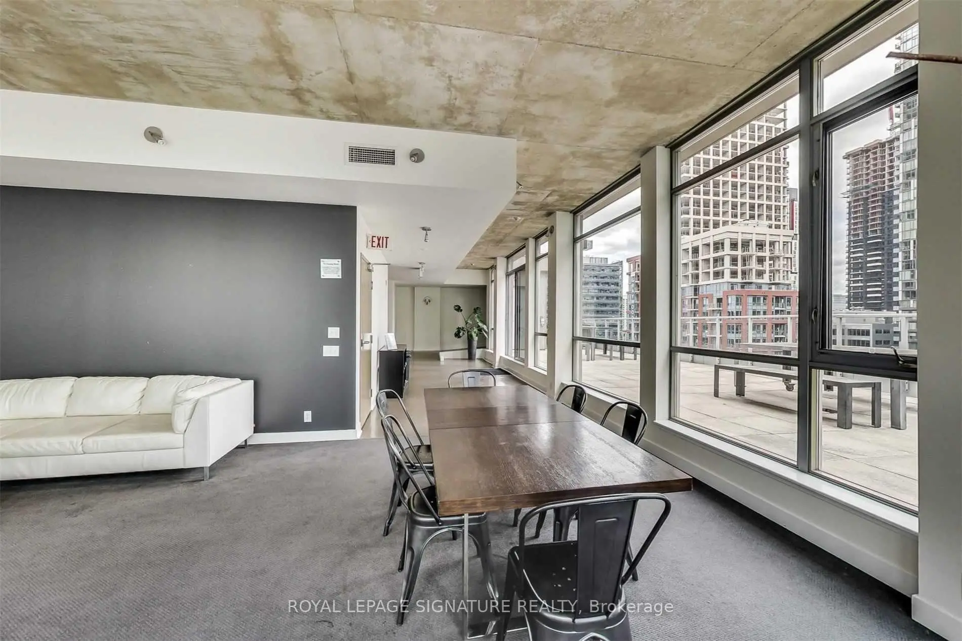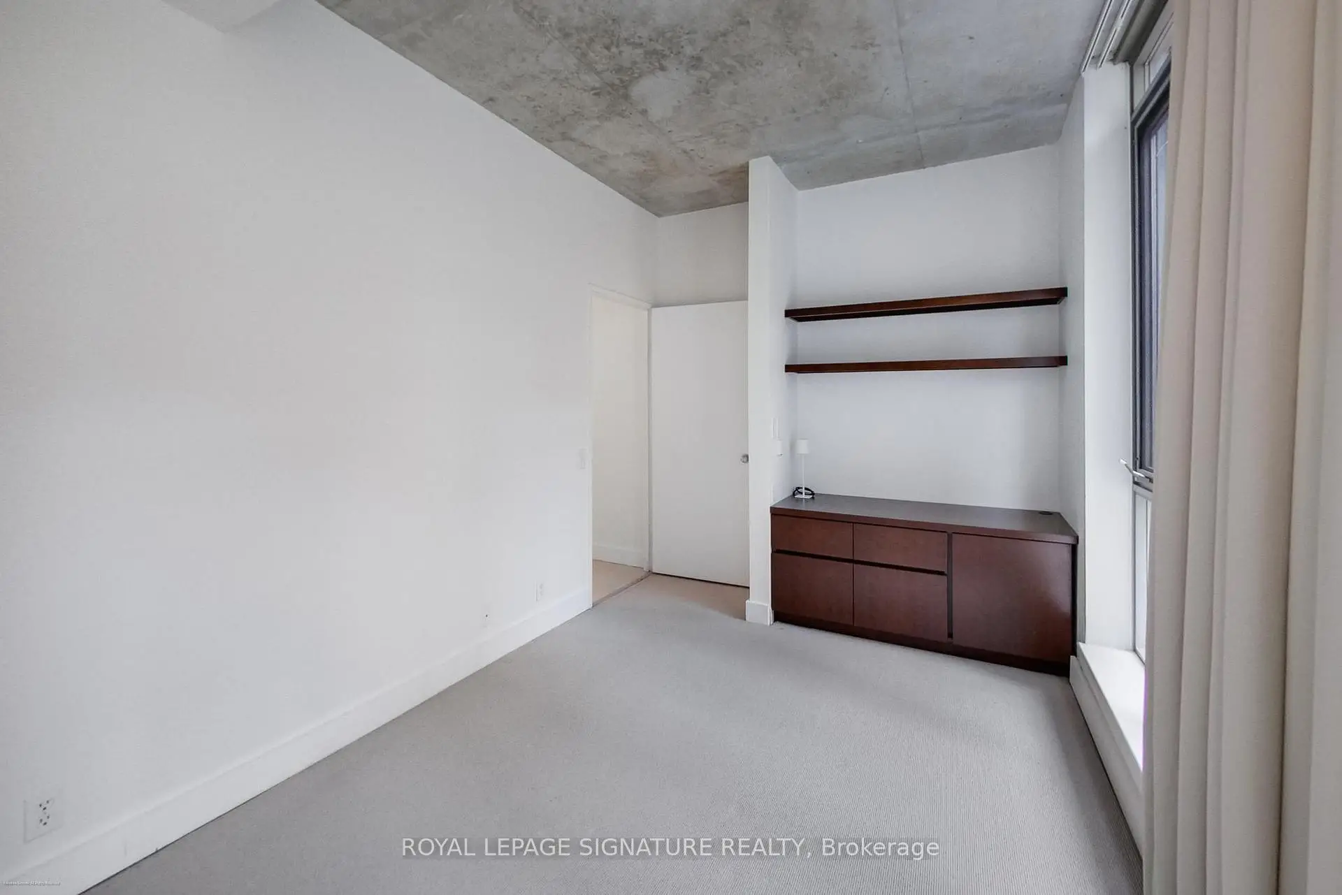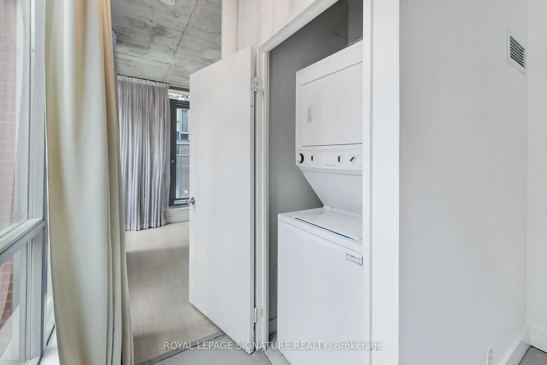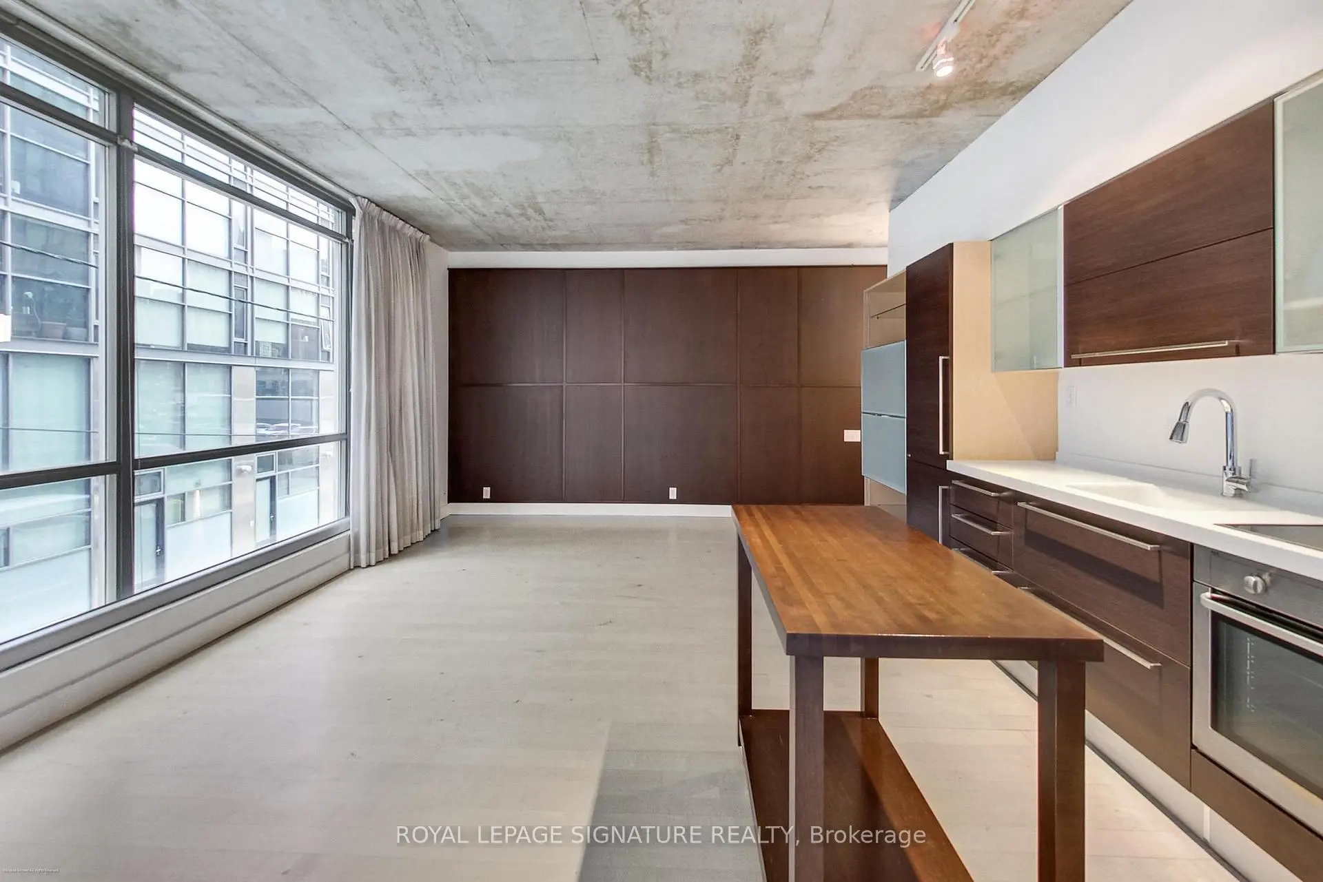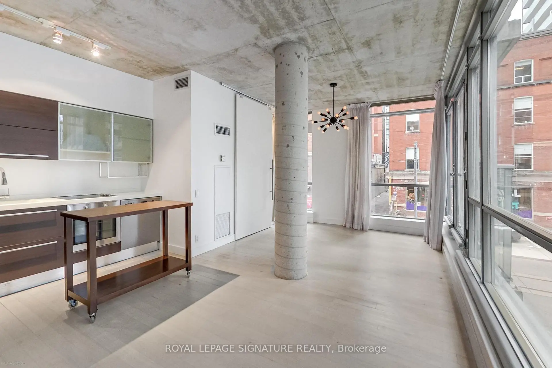 Welcome to the iconic Charlotte Lofts, a stunning 884sqft one bedroom corner loft in an exclusive 63-suite boutique building, perfectly situated in one of Toronto's most walkable, energetic neighbourhoods. Steps to King West, Queen West, and the Financial District, you're surrounded by the city's best dining, nightlife, shopping, and transit. This sun-filled loft blends industrial character with modern design, featuring soaring exposed concrete ceilings, a statement column, and wrap-around floor-to-ceiling windows with blackout blinds. The expansive living/dining area with a wainscoting feature wall offers exceptional flexibility for entertaining or working from home, with a Juliette balcony showcasing southeast city views. The Scavolini kitchen is sleek and functional with Corian counters, built-in stainless steel appliances, ample storage, and a movable island. Incredible custom storage solutions-including a front hall closet and a den converted into a massive walk-in closet, add thoughtful luxury. The primary suite features floor-to-ceiling windows, built-ins, and a spa-like 4-piece bath with dual rainfall shower heads. A true statement loft in an unbeatable downtown location. Hydro, water, heat, and central air are all included in monthly fees.