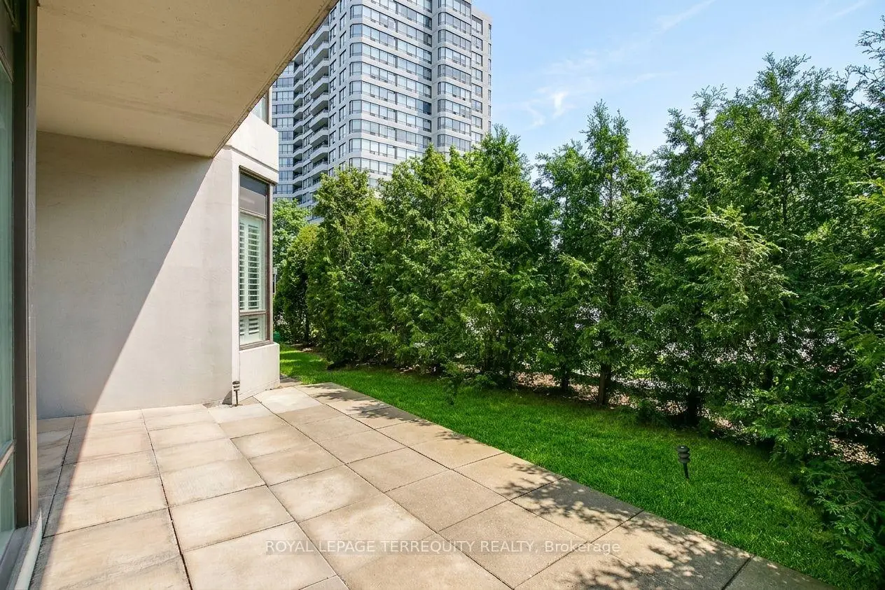 Outstanding and rarely offered main floor convenience, tastefully updated condo featuring renovated modern open concept kitchen with peninsula island, cooktop, integrated dishwasher, wine fridge/beverage cooler, and stainless steel appliances. Two newly renovated bathrooms. South facing unit offering an abundance of year-round sunlight. Ideal for downsizers or buyers seeking spacious living without compromising comfort or convenience. Bright, well-designed layout with sun-filled living/dining area with large windows, plus bright den surrounded by windows, ideal for office or flex space. Generous primary bedroom with floor-to-ceiling windows, updated ensuite, and his and hers closets. Second bedroom with built-in cabinets and walkout to terrace. Includes two parking spaces and two lockers!! Enjoy the convenience of main floor living with no wait for elevators and direct walkout to your patio for that true home garden-like feel. Amazing amenities include outdoor pool, party room, squash/racquetball/tennis courts, sauna, and more. Beautifully maintained Primrose grounds. Ideally located at Bathurst and Steeles, walking distance to shops, transit, places of worship, 3 plazas, parks, and more, with one bus to Finch Subway or Steeles West Subway.